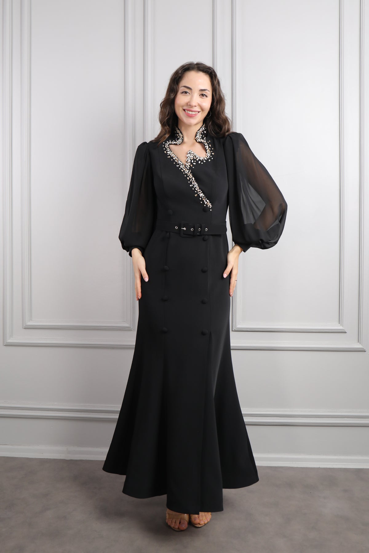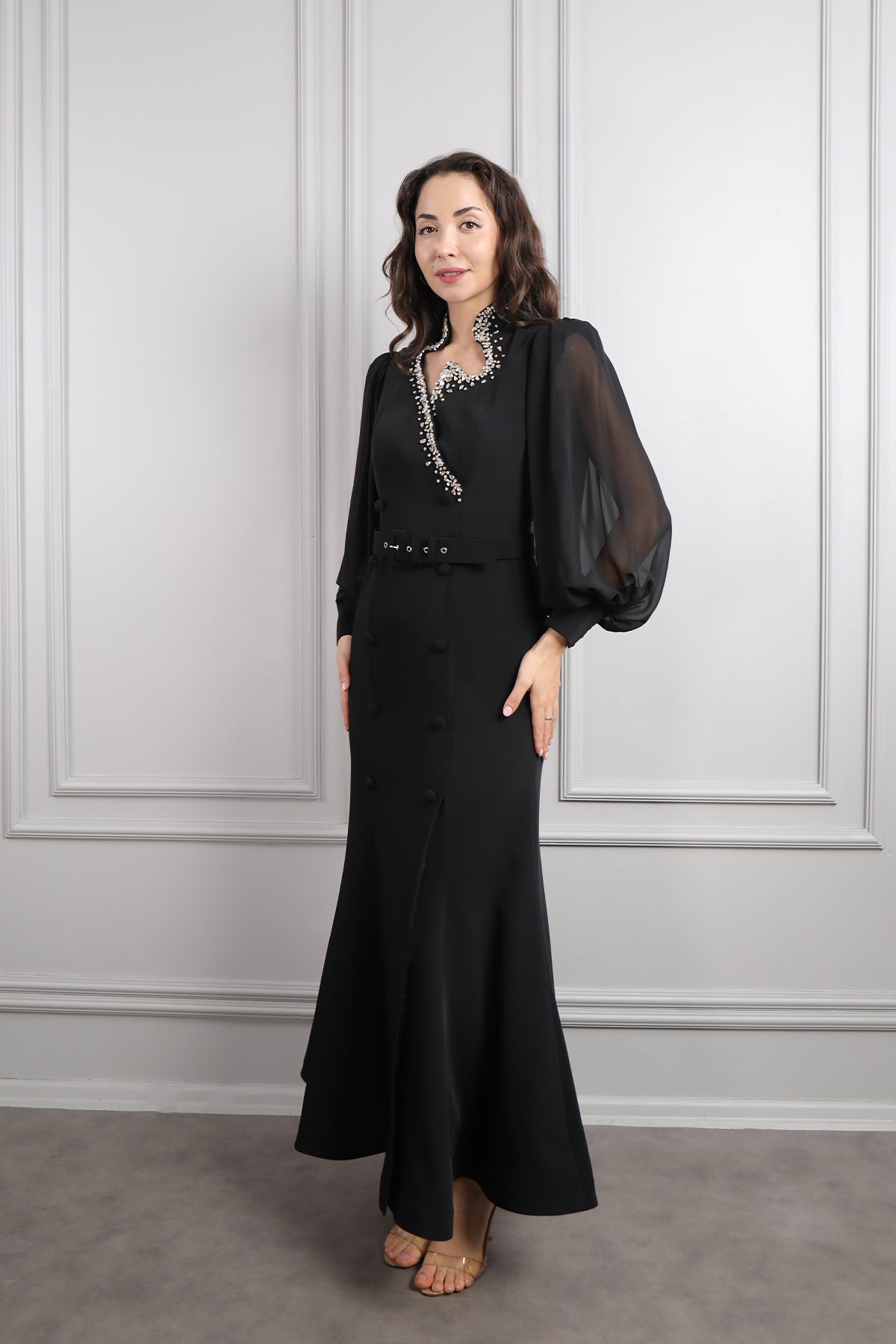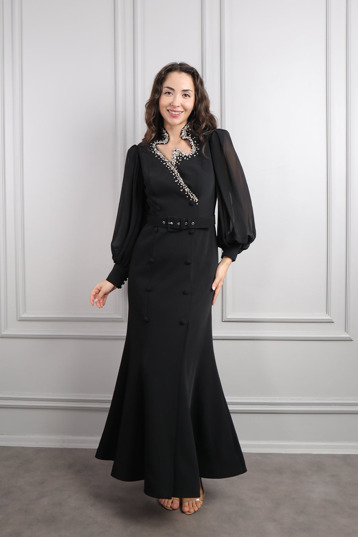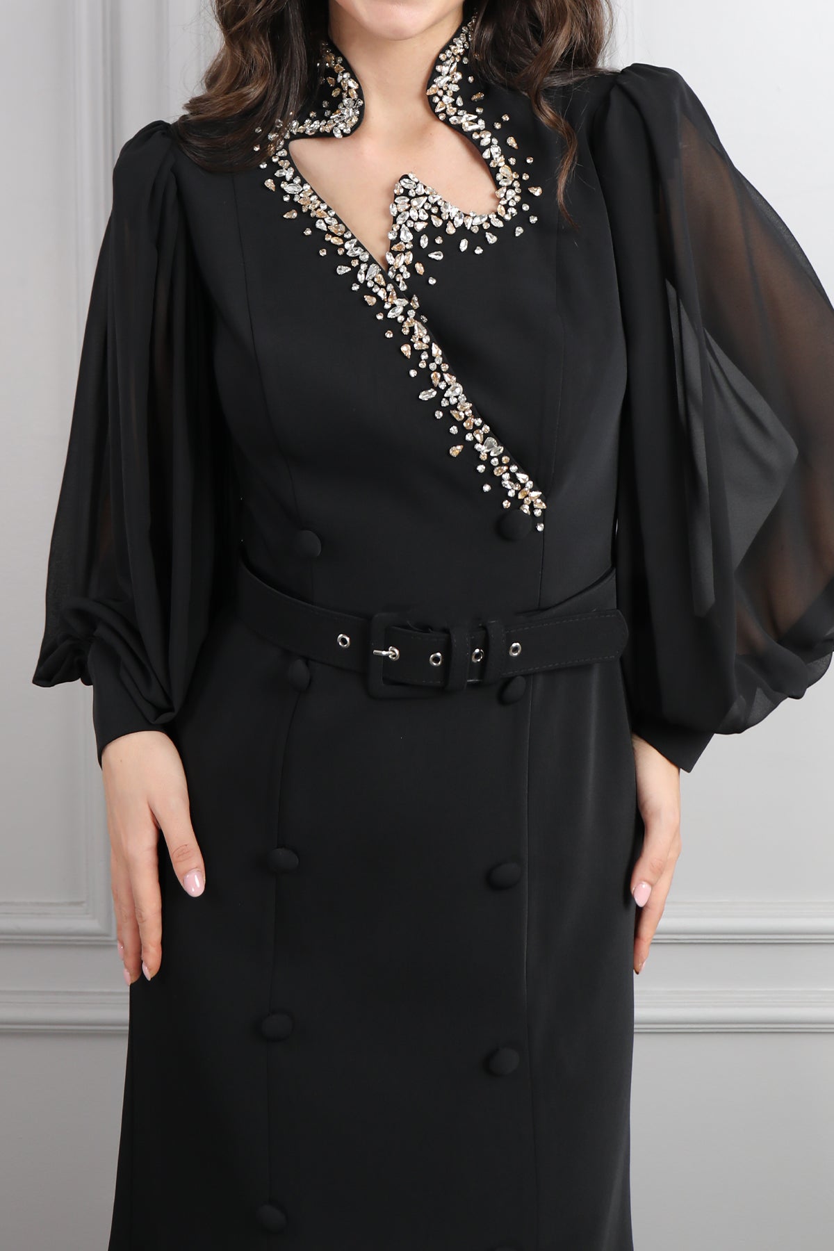Asimetrik Yaka Beli Kemerli Taş Detaylı Elbise Siyah Özellikleri