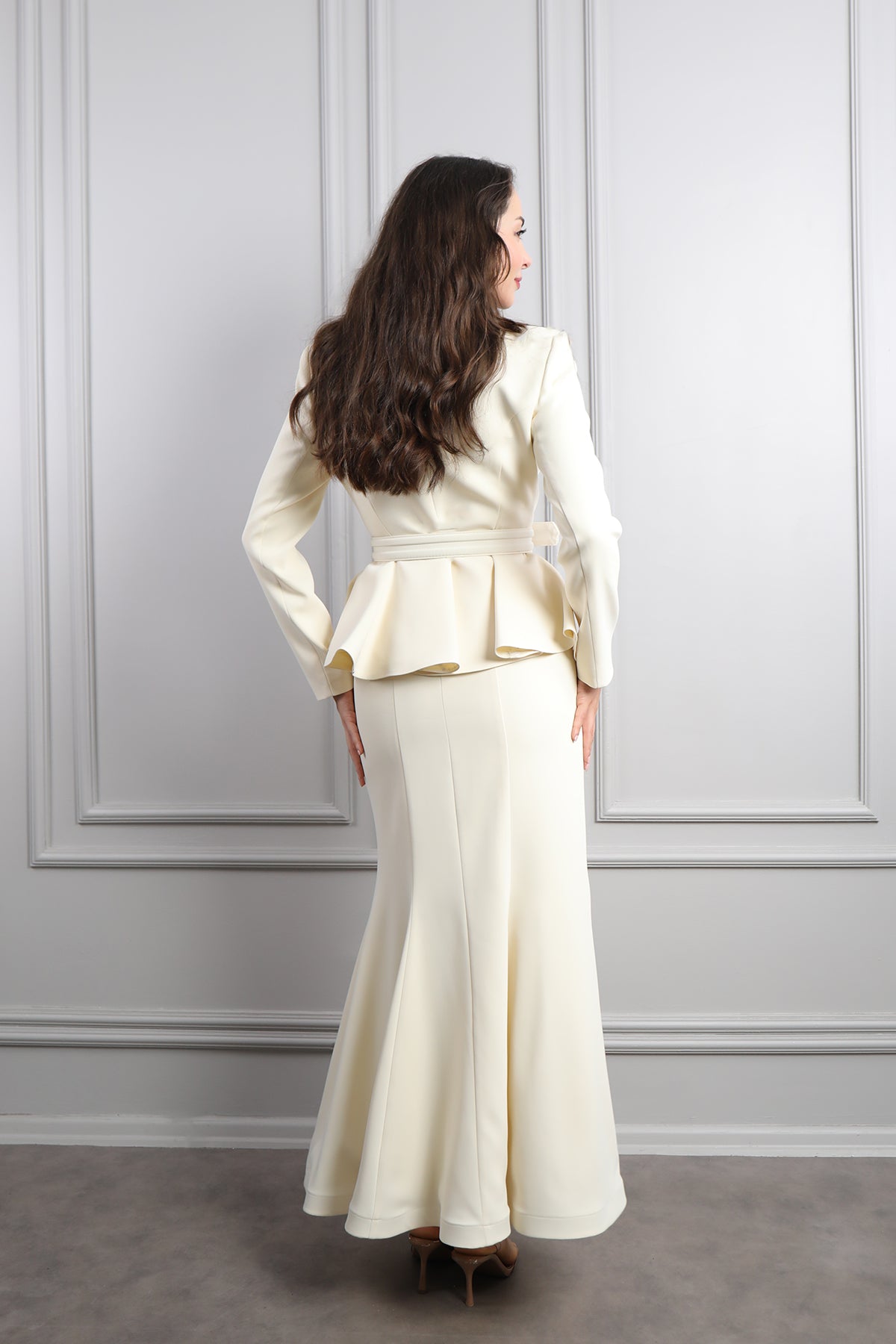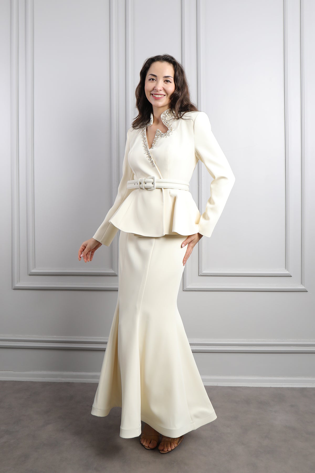 Asimetrik Yaka Beli Kemerli Taş Detaylı Etek Takım Ekru