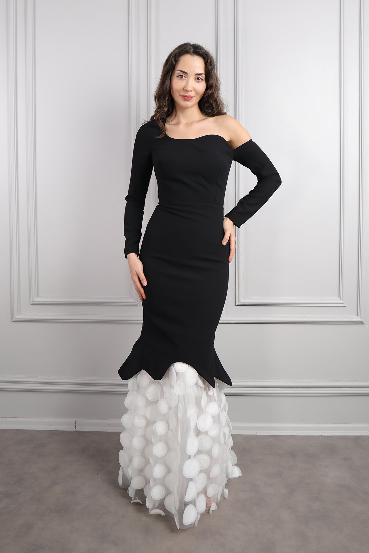 Asimetrik Yaka Detaylı 3D Aplikeli Tül Etek Abiye