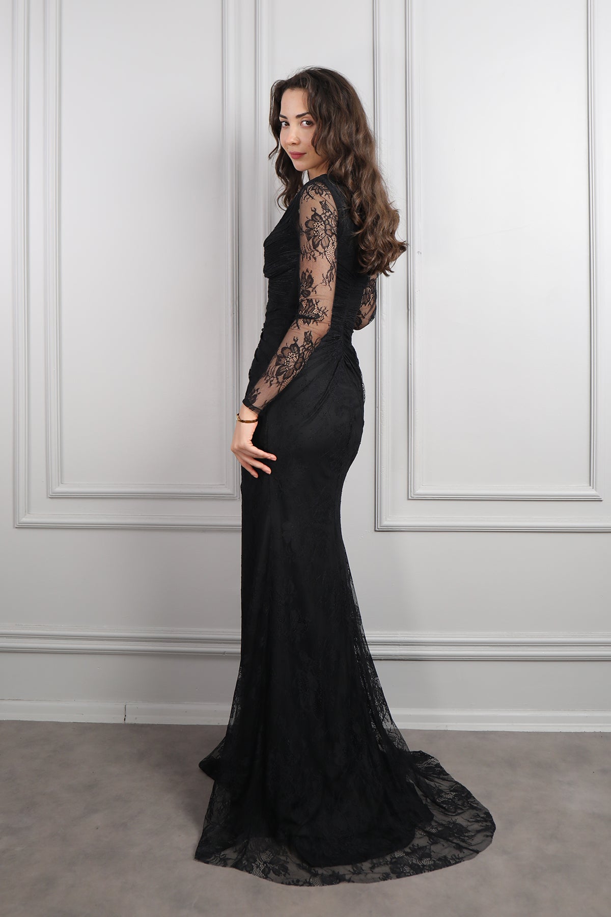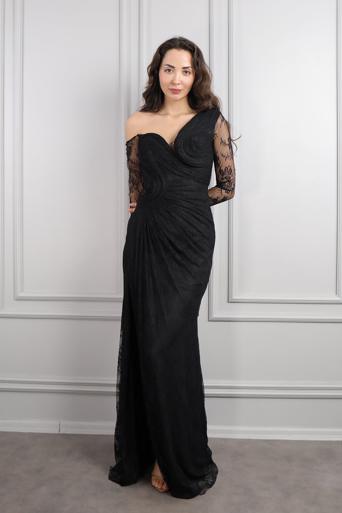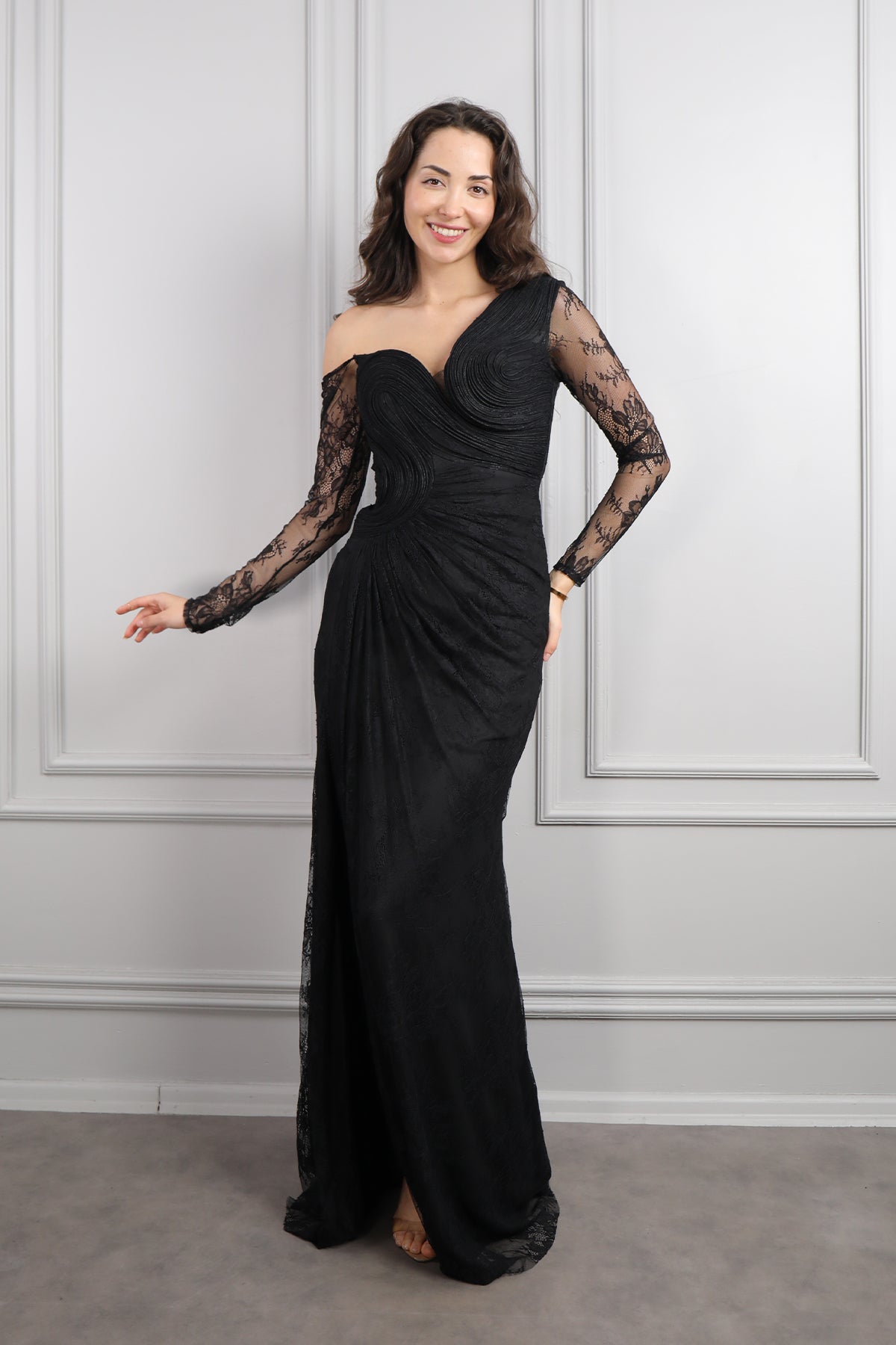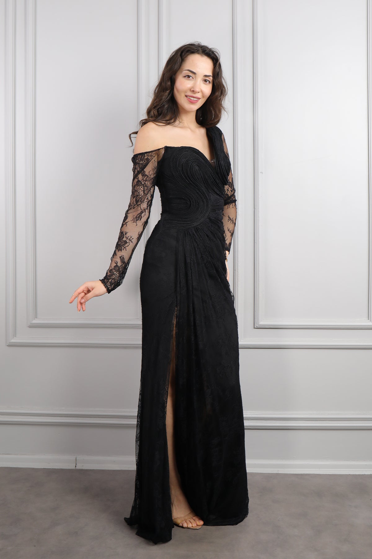 Asimetrik Yaka Transparan Kol Drapeli Dantelli Abiye