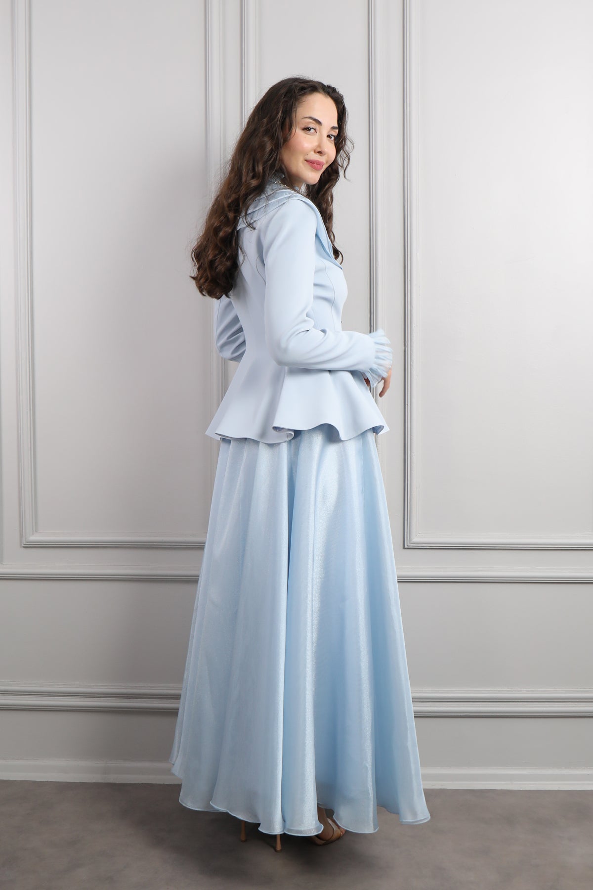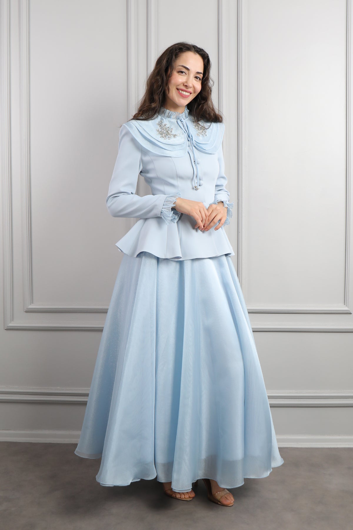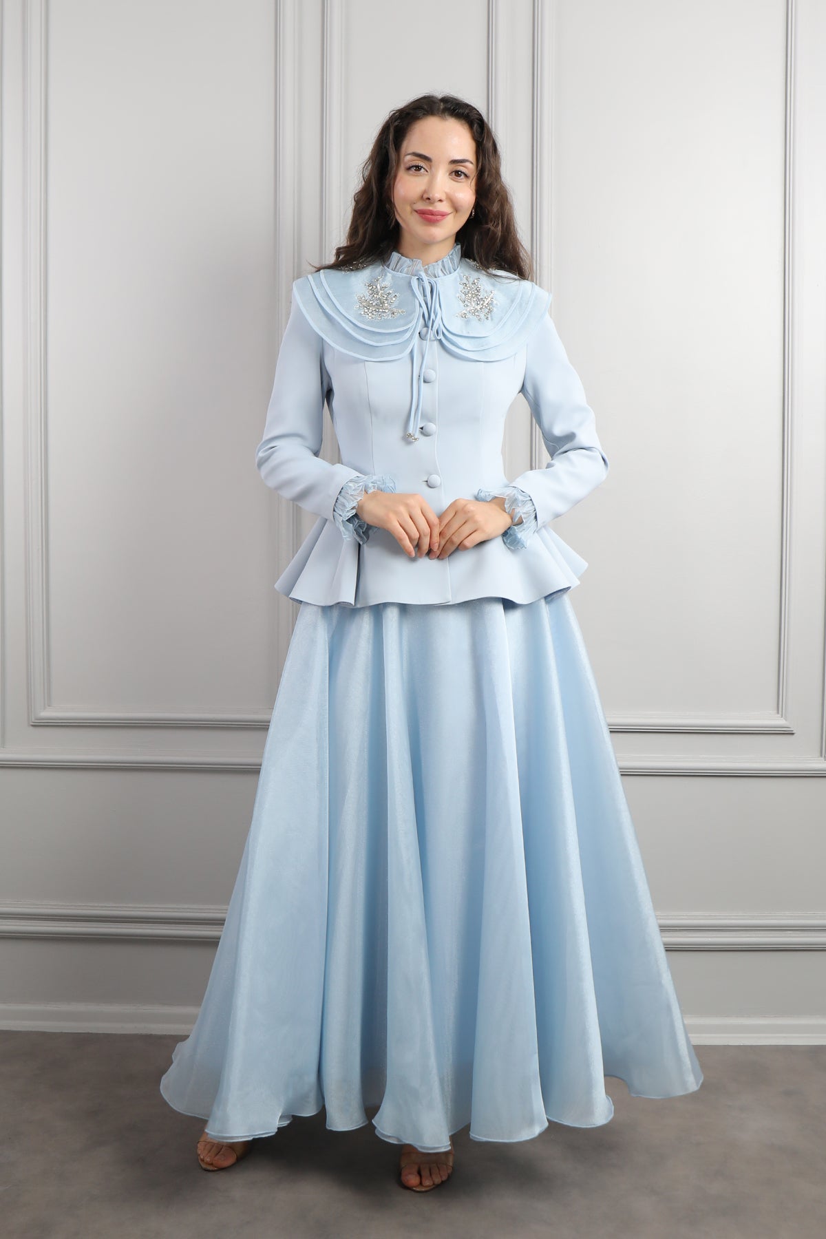 Tül kumaş ile fırfırlarla hakim yaka görünümü verilen ceketimizin kat detaylı bebe yakası inci işlenerek süslenmiştir. Yakasına bağlama detayı verilirken ceketin ön kısmı düğmelerle detaylandırılarak tasarlanmıştır. Altındaki tül kumaş kullanılarak tasarlanan tam boy eteği bol bir şekilde inerek bütünlük oluşturulmuştur. Özel günlerinizde tercih edebileceğiniz etek takımımızı seçmeniz sizler için ideal bir seçim olacaktır.