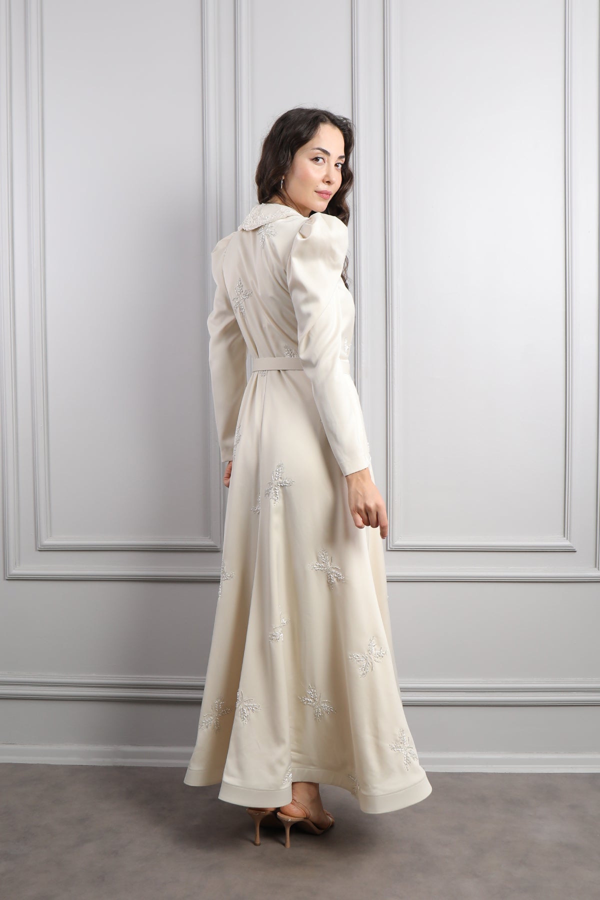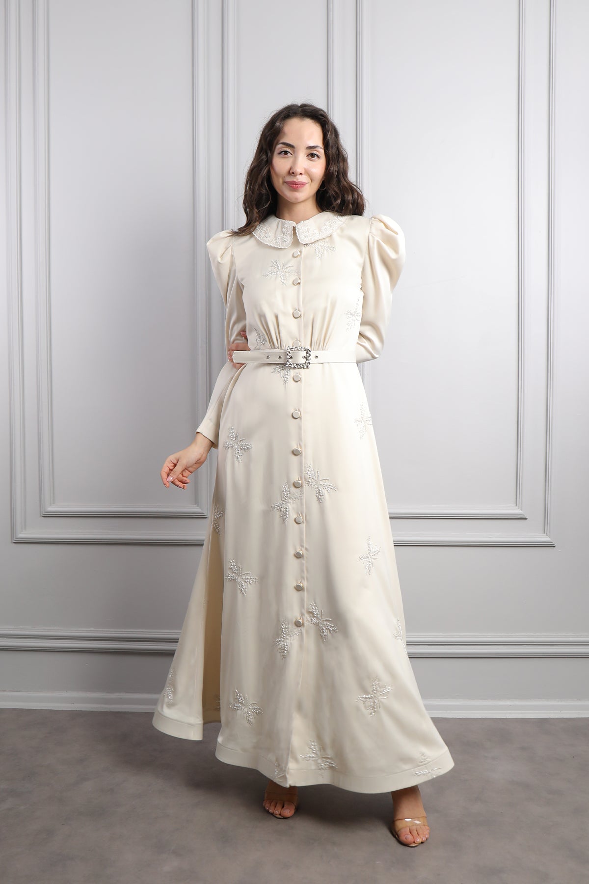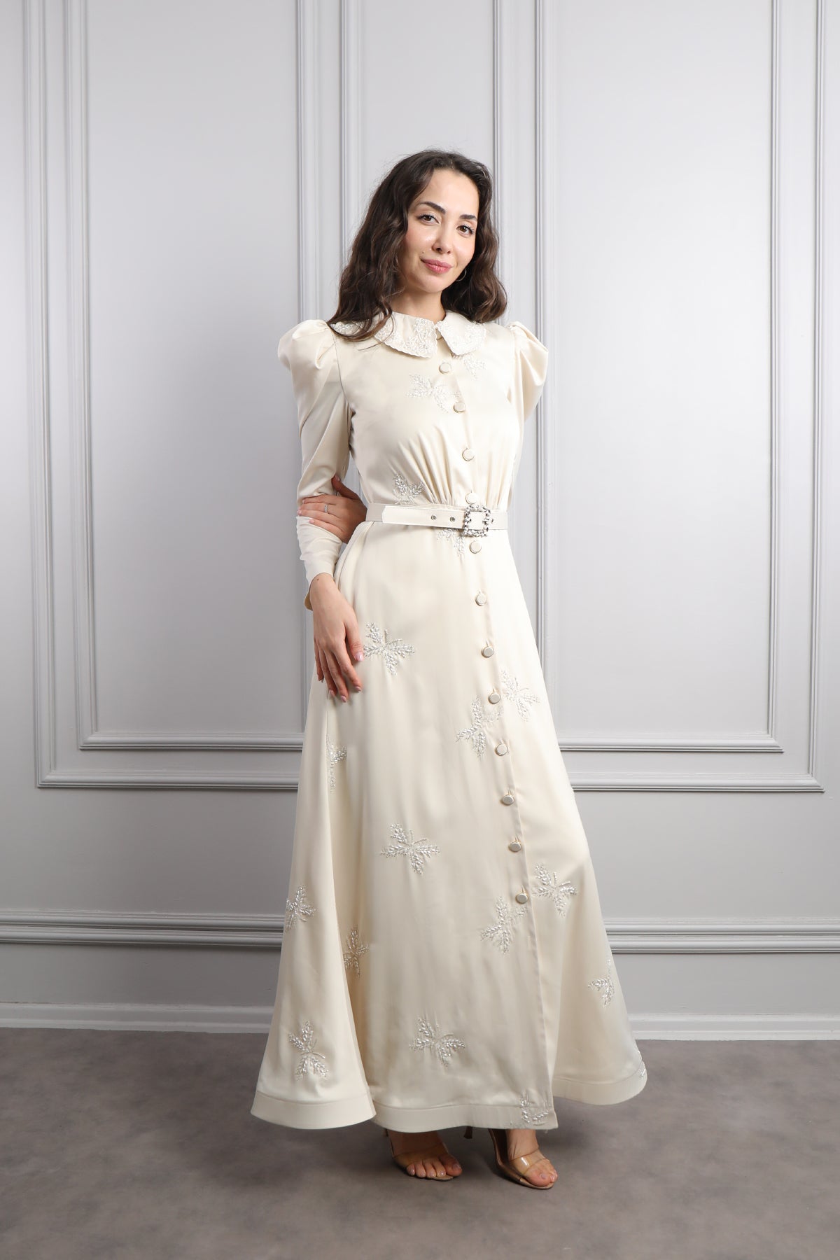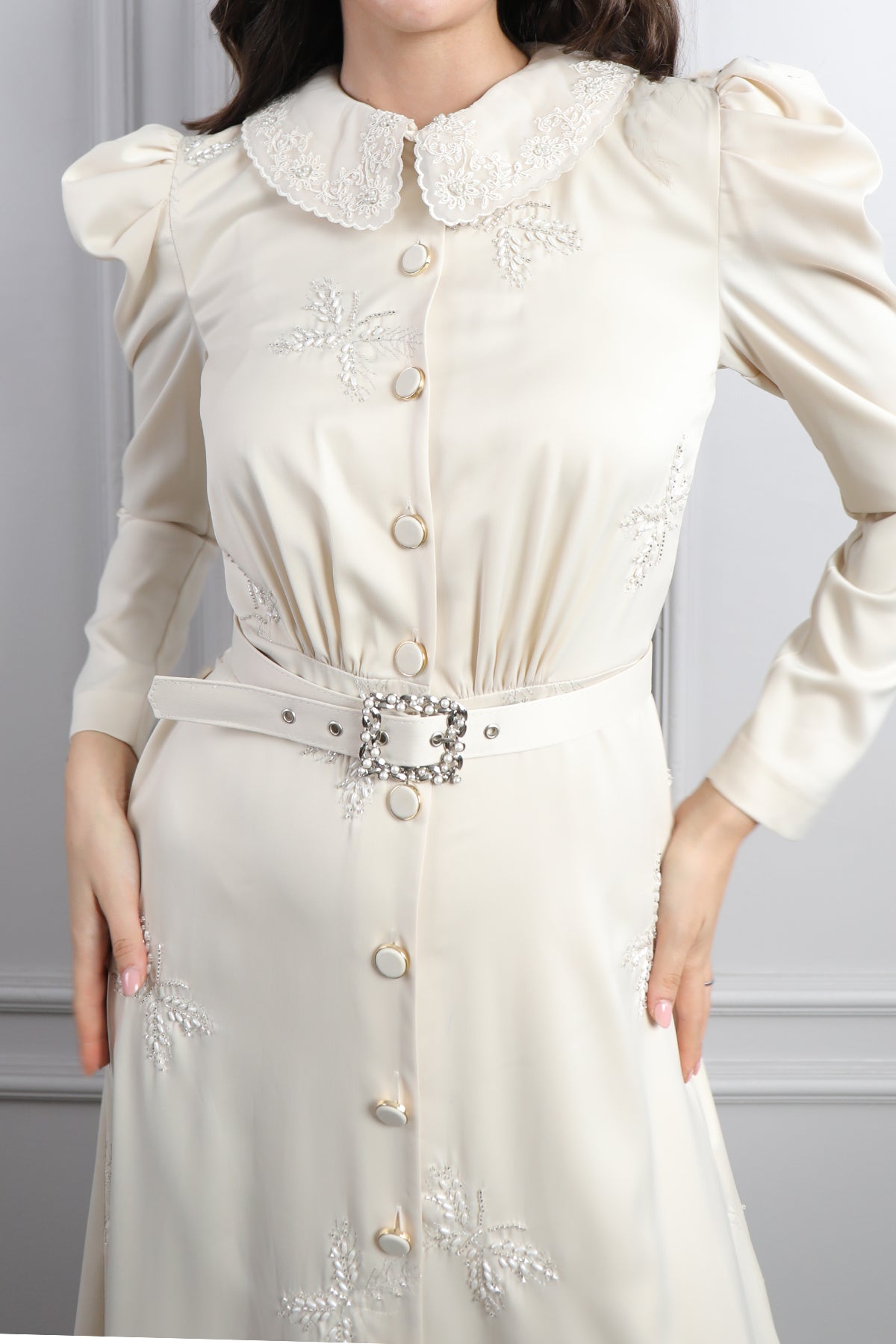 Bebe Yaka Beli Kemerli Boncuk İşlemeli Saten Elbise Kemik