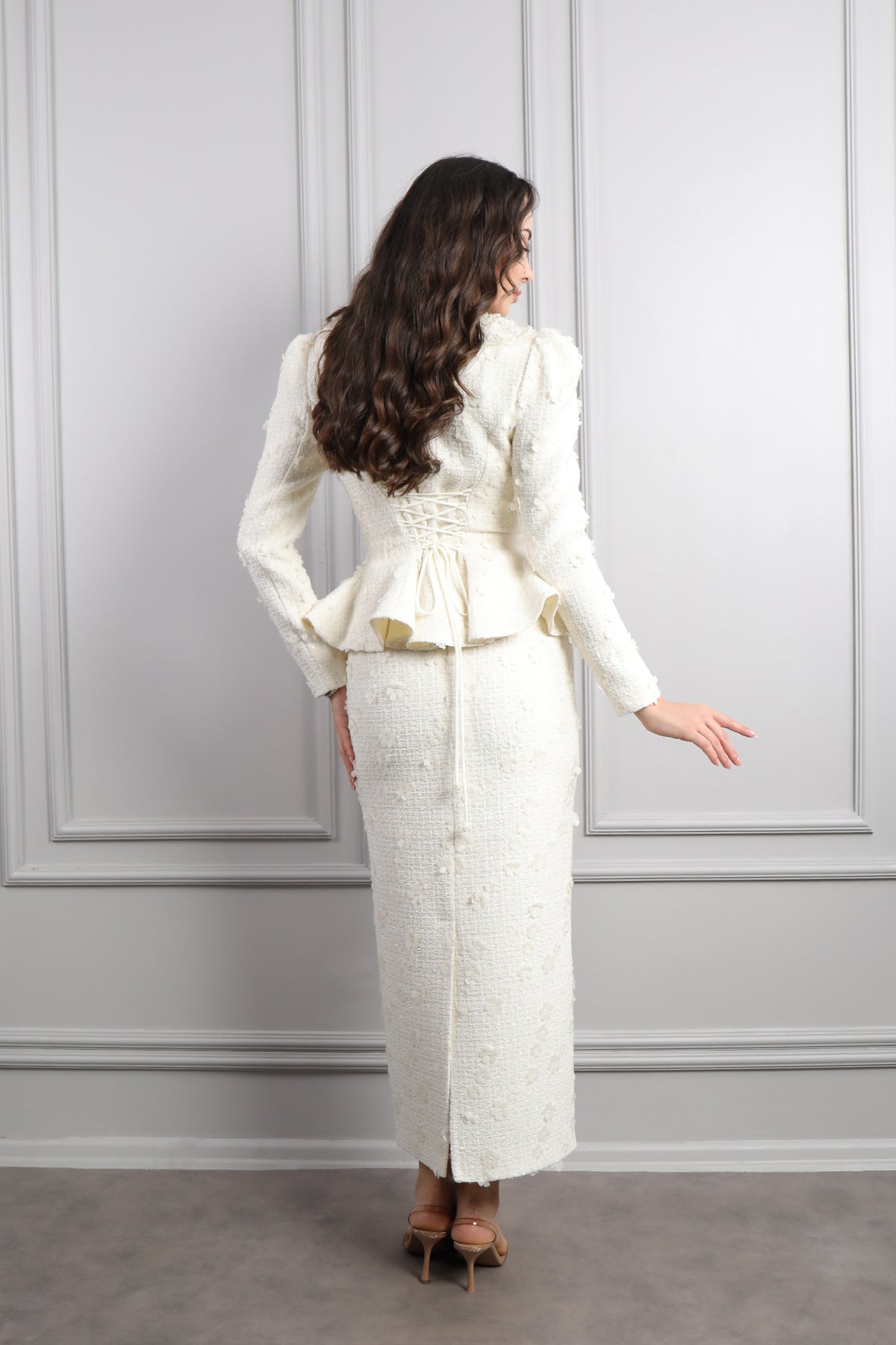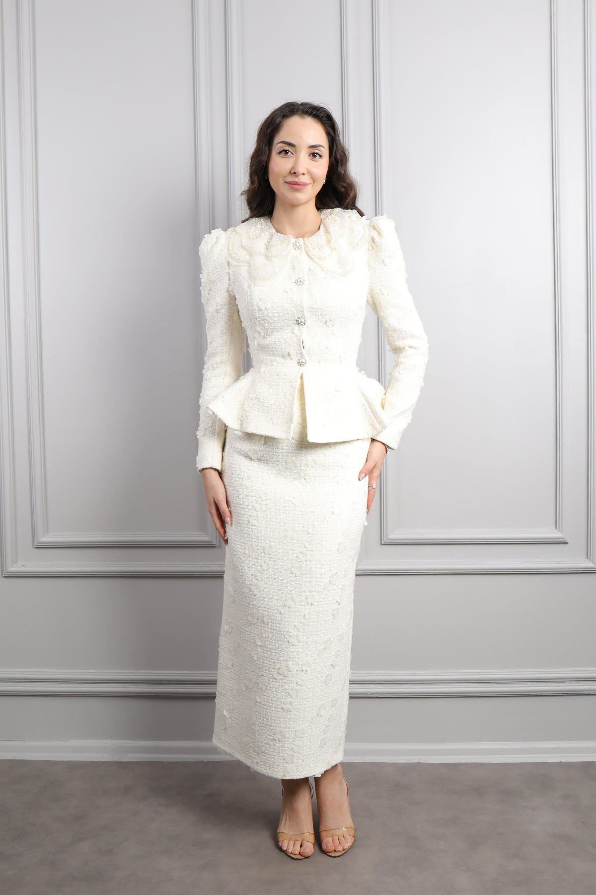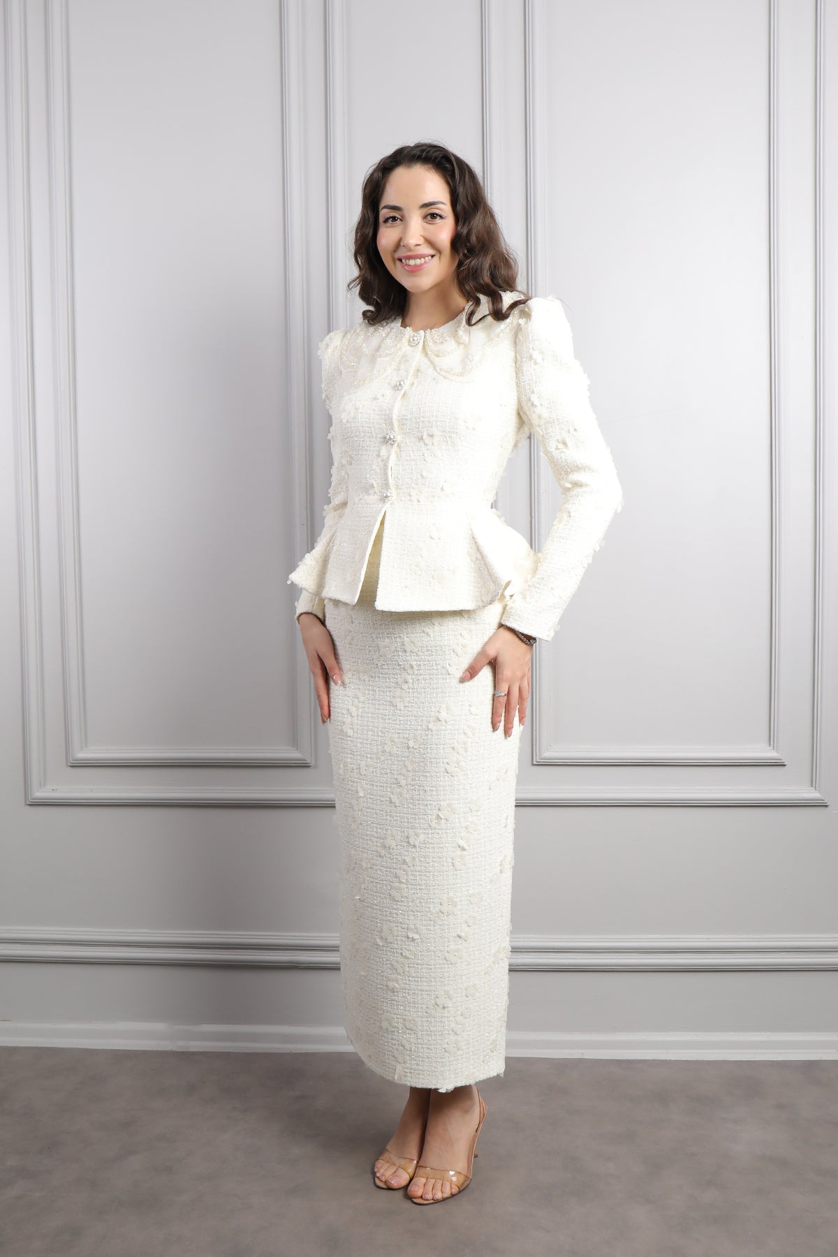 Bebe Yaka Çiçek Detaylı Tüvit Etek Takım Ekru