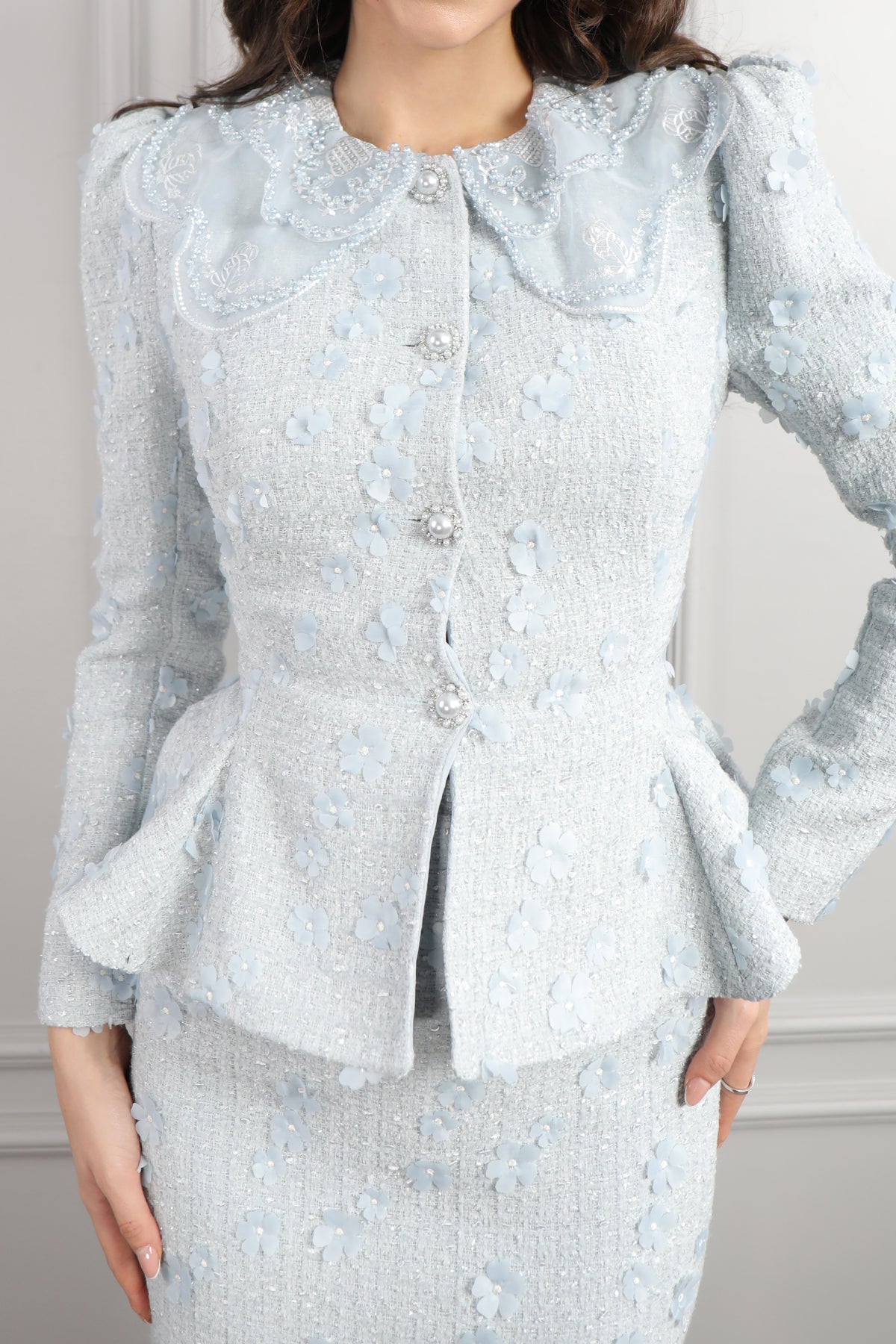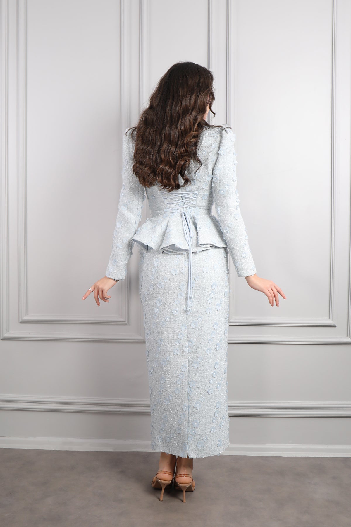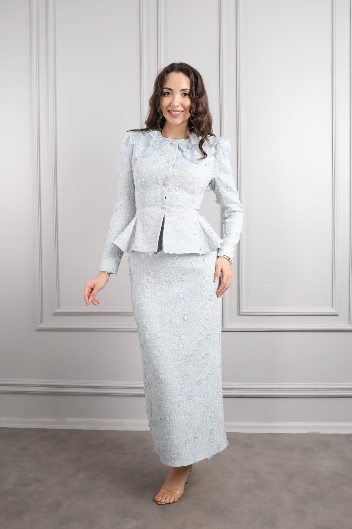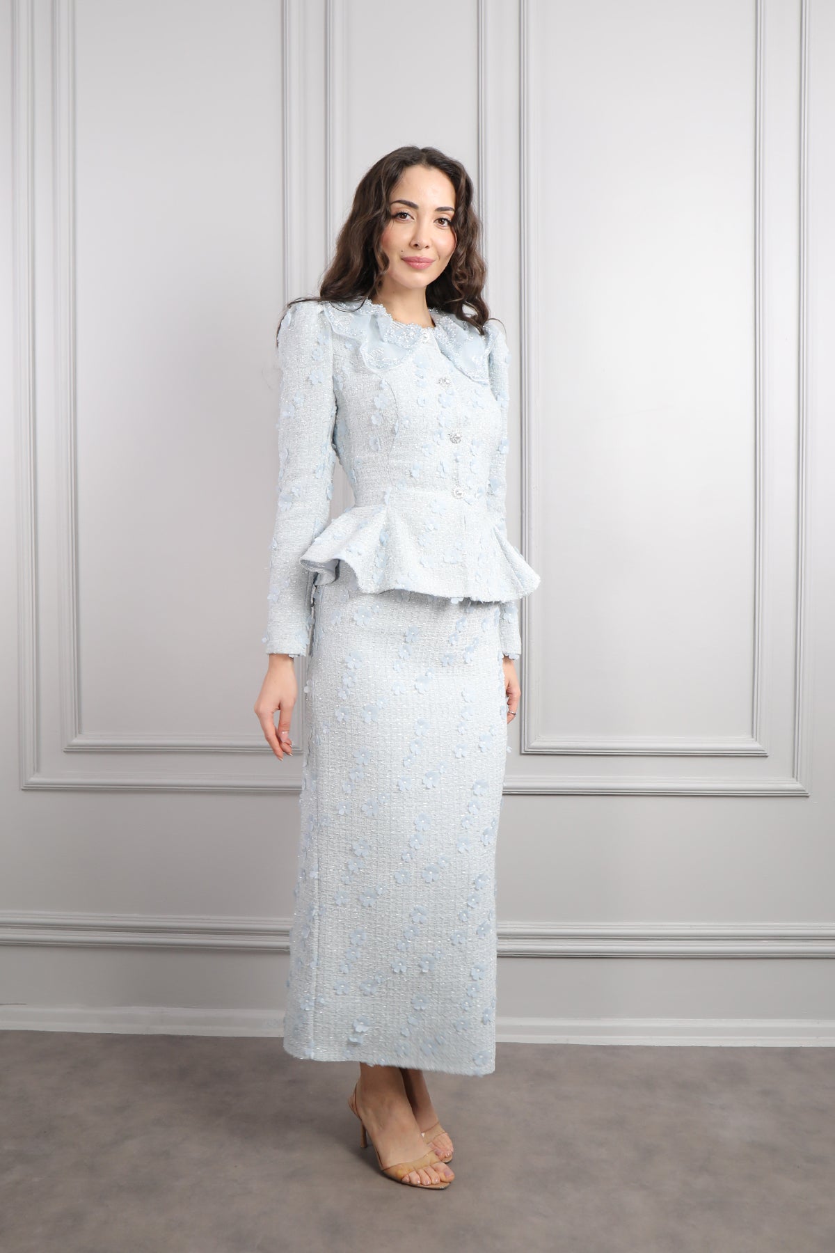 Zarif detaylarıyla romantik bir stil sunan Bebe Yaka Çiçek Detaylı Tüvit Etek Takım, sezonun en naif ve en şık tasarımlarından biri olarak öne çıkıyor. Yumuşak dokulu tüvit kumaşı sayesinde hem sıcak tutan hem de modern bir görünüm sunan takım, özellikle feminen şıklığı seven kadınların favorisi oluyor. Üst parçada yer alan bebe yaka detayı, kombinine masum ve vintage bir hava katarken, özenle hazırlanmış çiçek işlemeleri ile tasarım daha da zarif bir görünüm kazanıyor. Etek kısmının ideal kesimi, hareket rahatlığı sağlarken vücut formunu son derece estetik bir şekilde tamamlıyor. Günlük şehir stilinden özel davetlere kadar pek çok ortamda kullanılabilen bu takım, hem konforlu hem de şık bir stil elde etmek isteyenler için mükemmel bir seçenek.