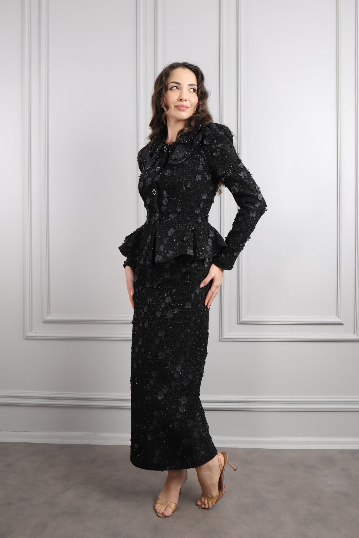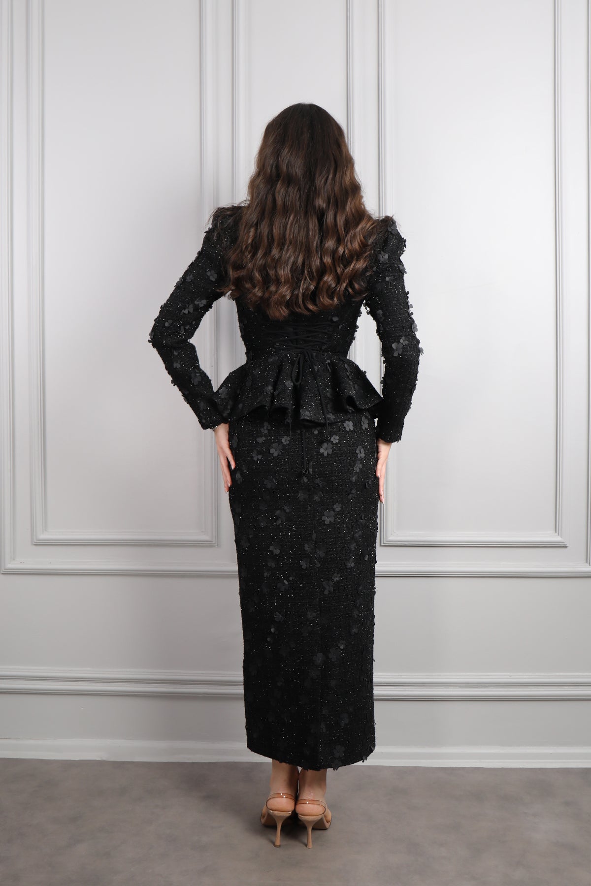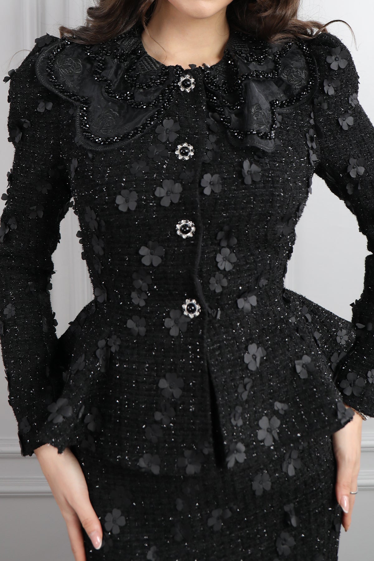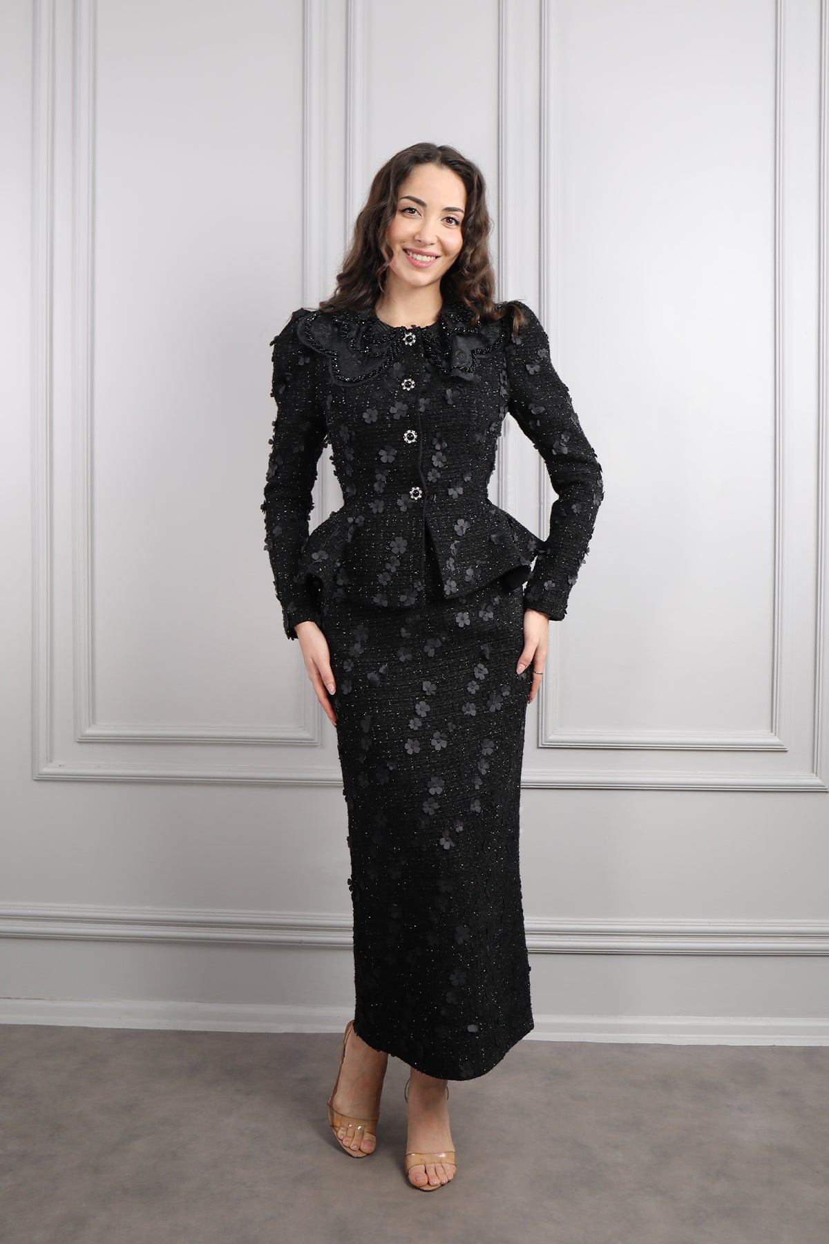 Bebe Yaka Çiçek Detaylı Tüvit Etek Takım Siyah