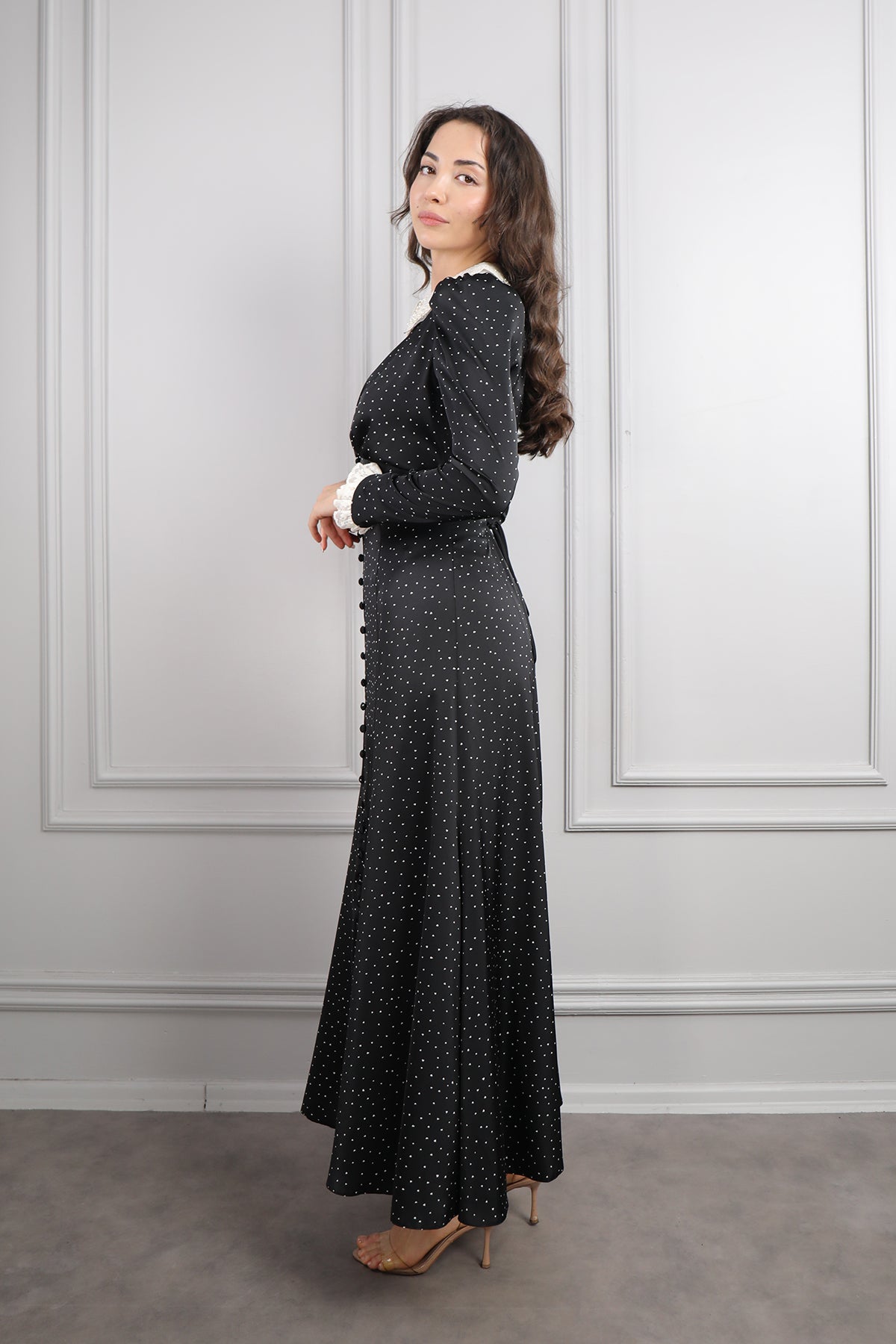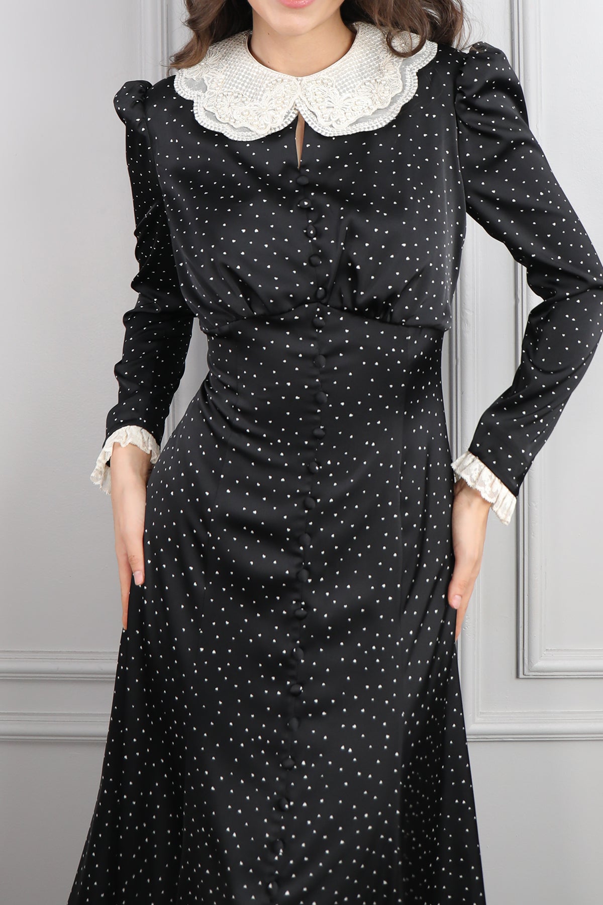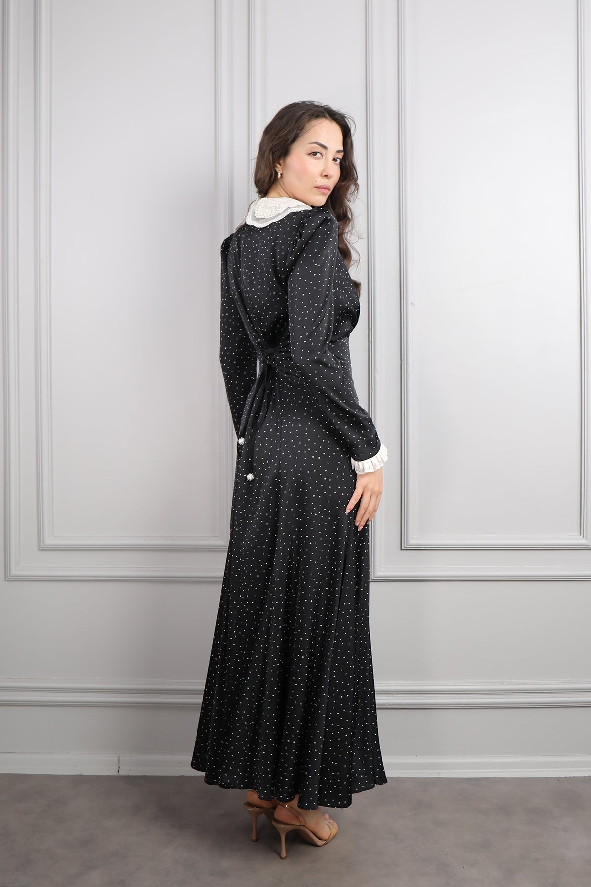 Bebe Yaka Önü Düğmeli Puantiyeli Saten Elbise Siyah