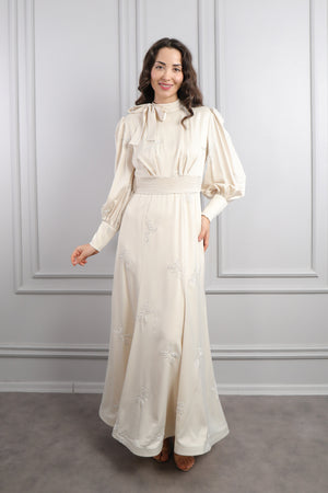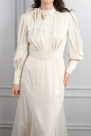 Gardırobunuza nostaljik ama bir o kadar da zarif bir dokunuş katmak istiyorsanız, bu bebe yaka, önü düğmeli, puantiyeli saten elbise tam size göre! Saten kumaşın doğal parlaklığı ve yumuşak dokusu, elbiseye sofistike bir hava katarken; küçük puantiyeler ise vintage stilin en sevimli detaylarından biri olarak öne çıkıyor. Dantel detaylı bebe yaka ve manşetler, elbiseye feminen bir dokunuş kazandırırken, A-kesim etek formu hareket özgürlüğü sunuyor. İnce düğme detayları elbiseye zarif bir geçiş sağlarken, belden oturan yapısı vücut hatlarını zarifçe vurguluyor. Hem gündüz şıklığında hem de özel davetlerde rahatlıkla tercih edebilirsiniz.