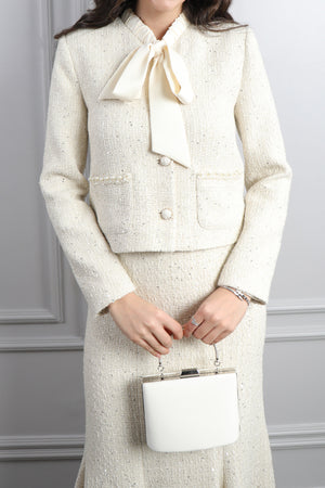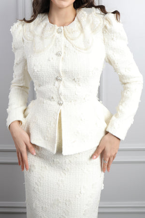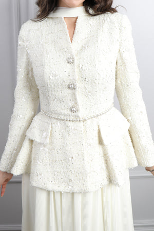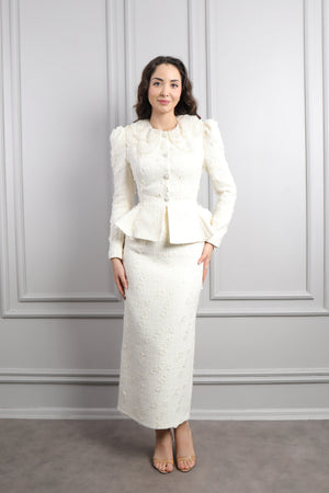 Özel günlerin vazgeçilmezi olacak bu beli bağlamalı, kolları transparan boncuk işlemeli tüllü etek takımı, modern ve zarif çizgileriyle göz kamaştırıyor. Şıklığı ve rahatlığı bir arada sunan bu takım, hem davetlerde hem de özel organizasyonlarda fark yaratmak isteyen kadınlar için ideal bir tercih. Ceket kısmında yer alan bel bağlama detayı, vücut hatlarını nazikçe vurgulayarak feminen bir duruş kazandırırken; transparan ve boncuk işlemeli kollar ise tasarıma zarif bir ışıltı katıyor. Alt parçada kullanılan tül kumaş ve inci detaylı işlemeler, eteğe romantik bir hava verirken, her adımda zarafetinizi ön plana çıkarıyor.