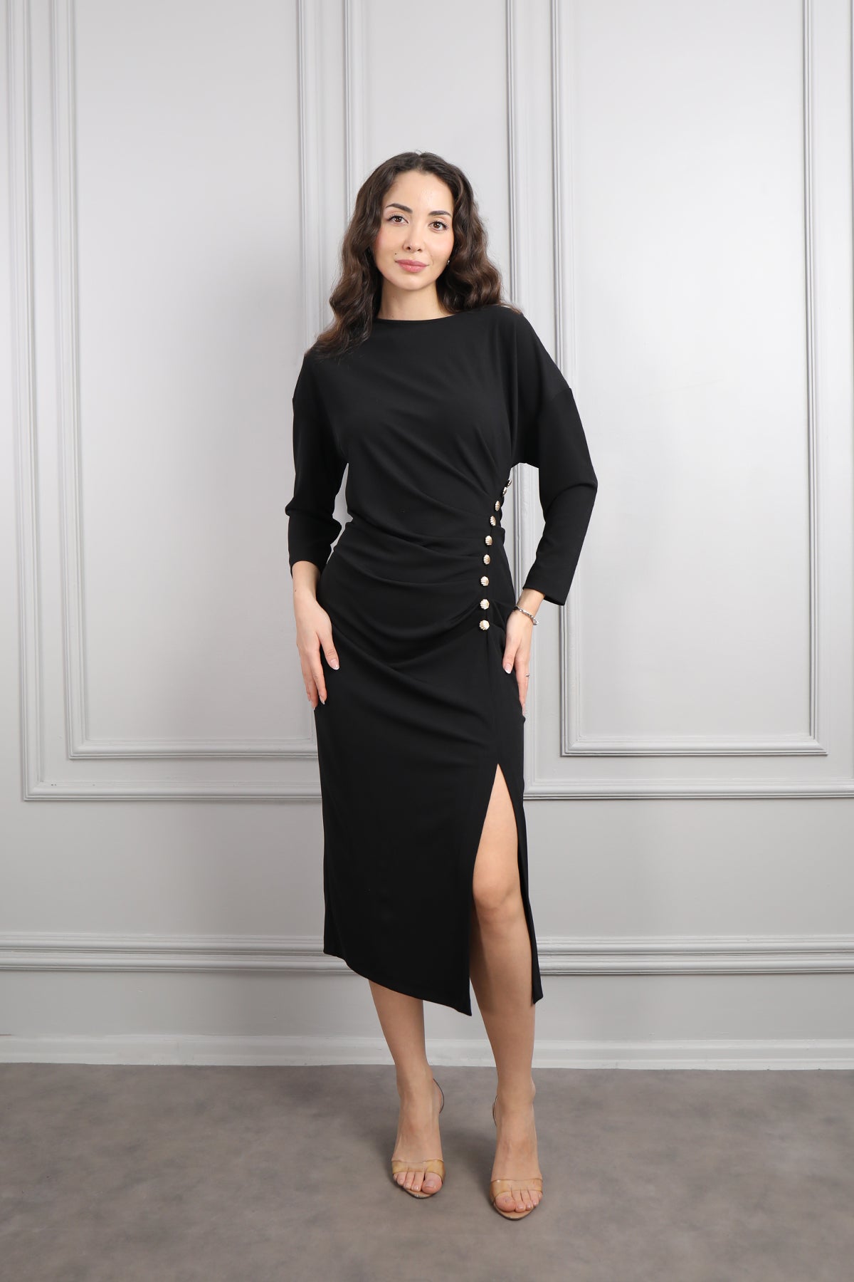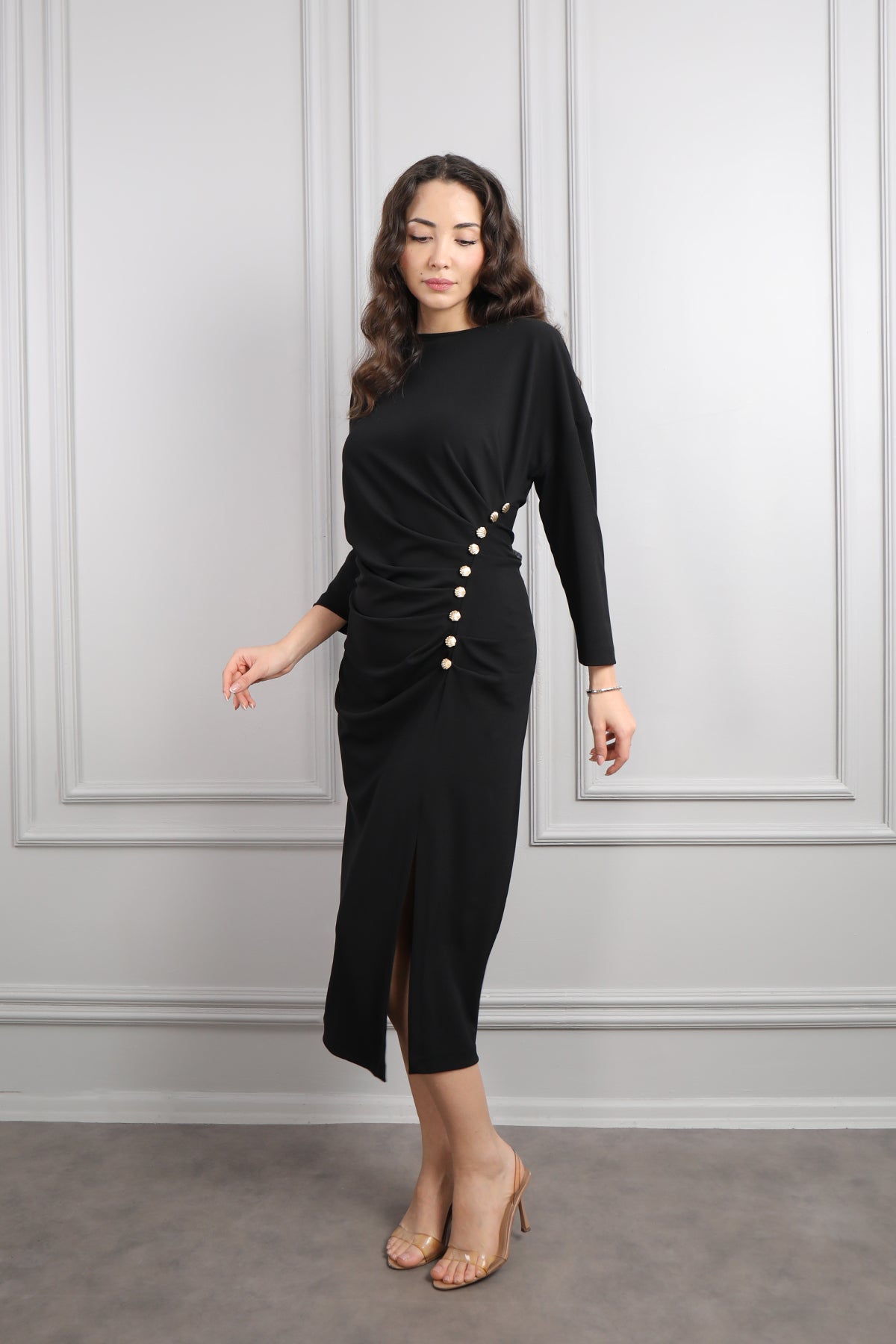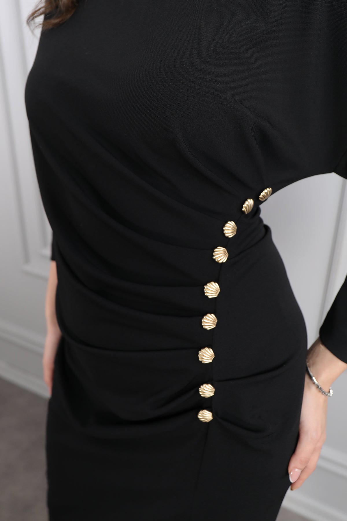 Beli Düğme Detaylı Drapeli Büyük Beden Midi Boy Elbise Siyah Özellikleri