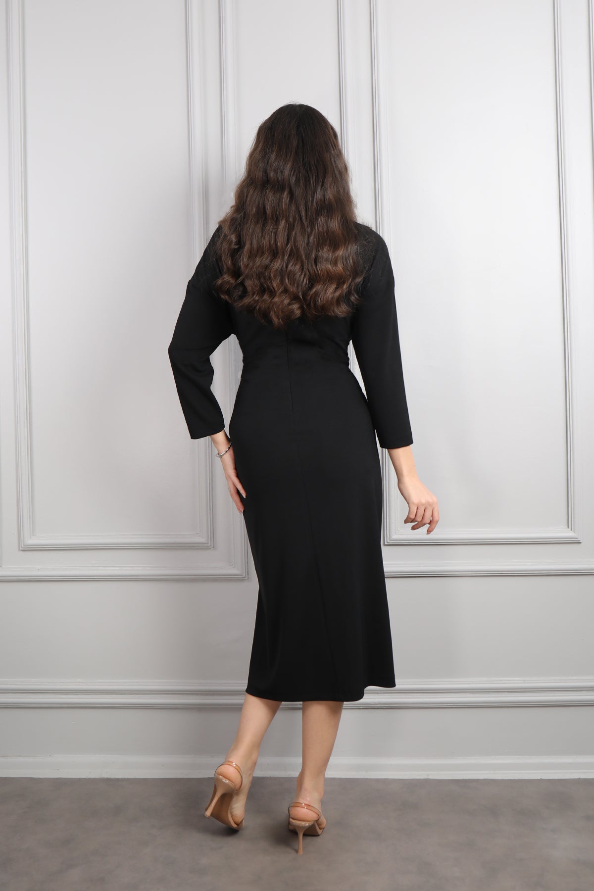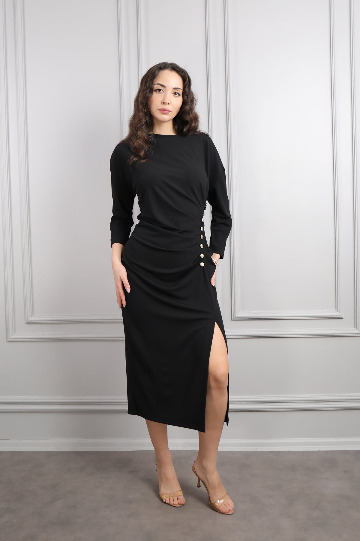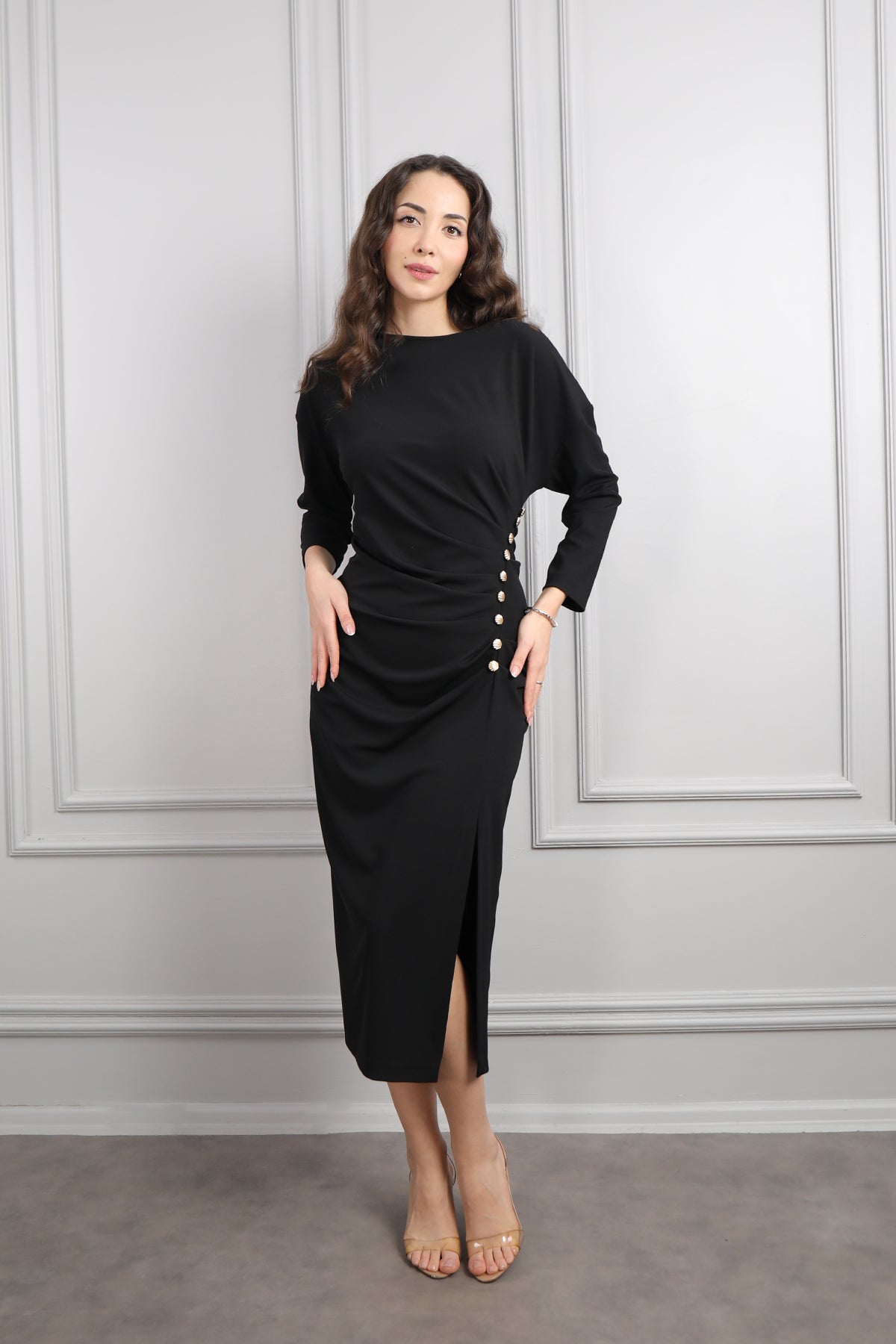 Beli Düğme Detaylı Drapeli Büyük Beden Midi Boy Elbise Siyah Özellikleri