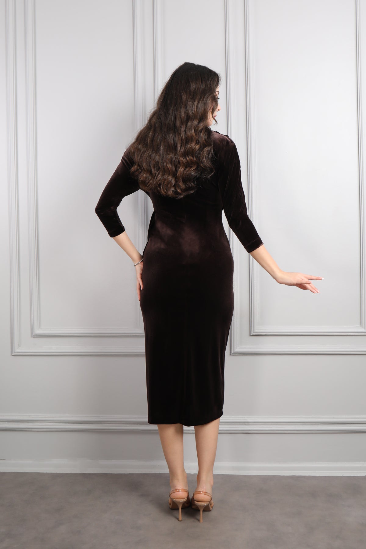 Beli Gold Detaylı Drapeli Kadife Midi Boy Elbise Kahve