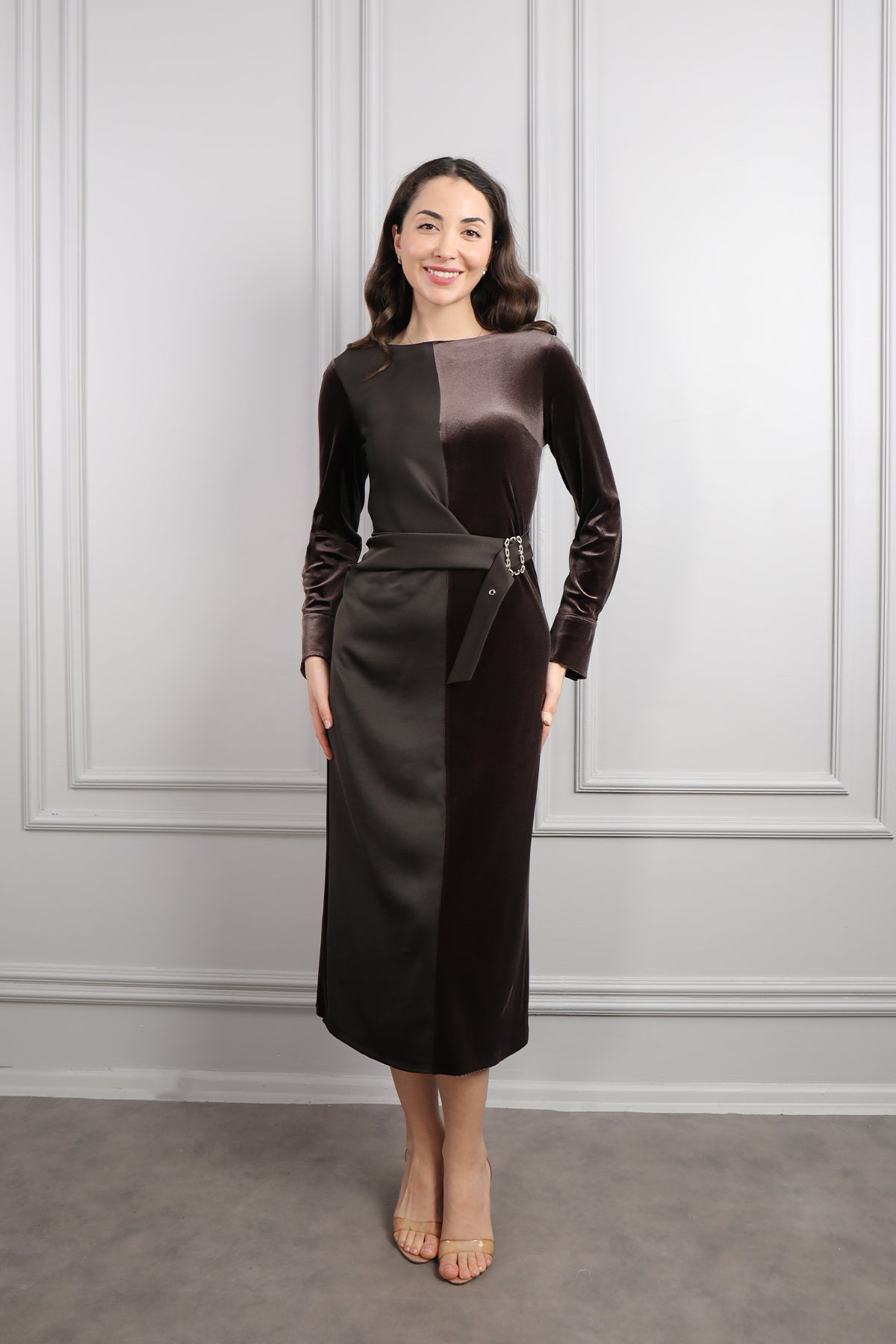 Beli Kemer Görünümlü Kadife Detaylı Midi Boy Elbise Kahve