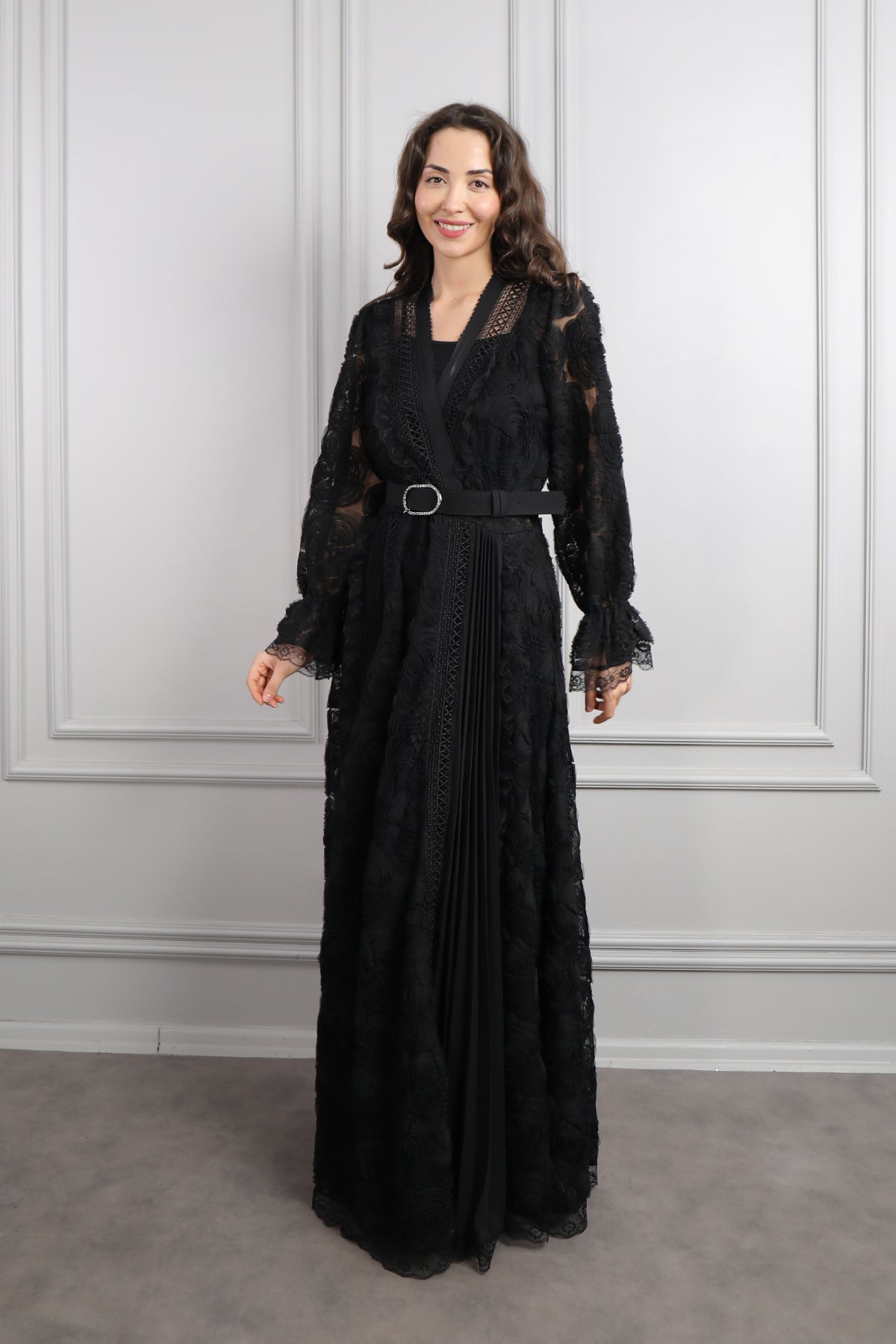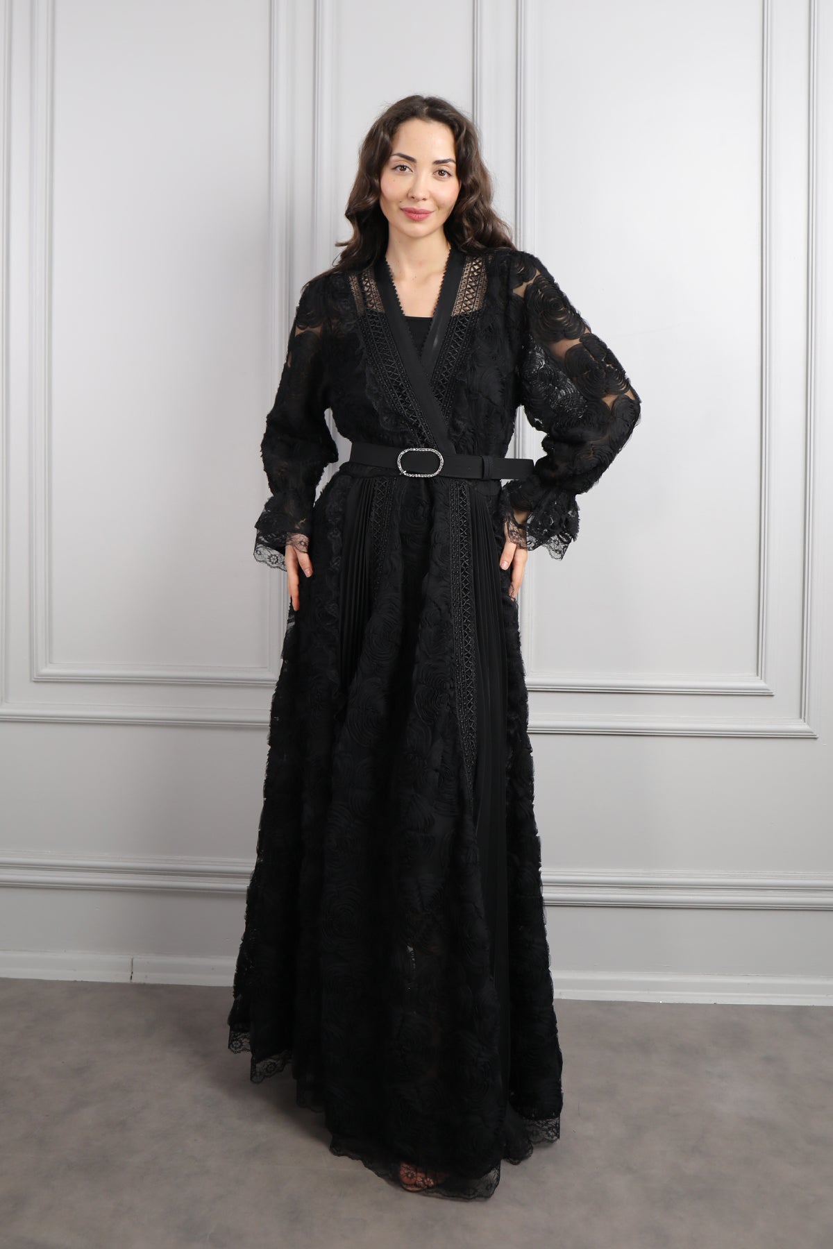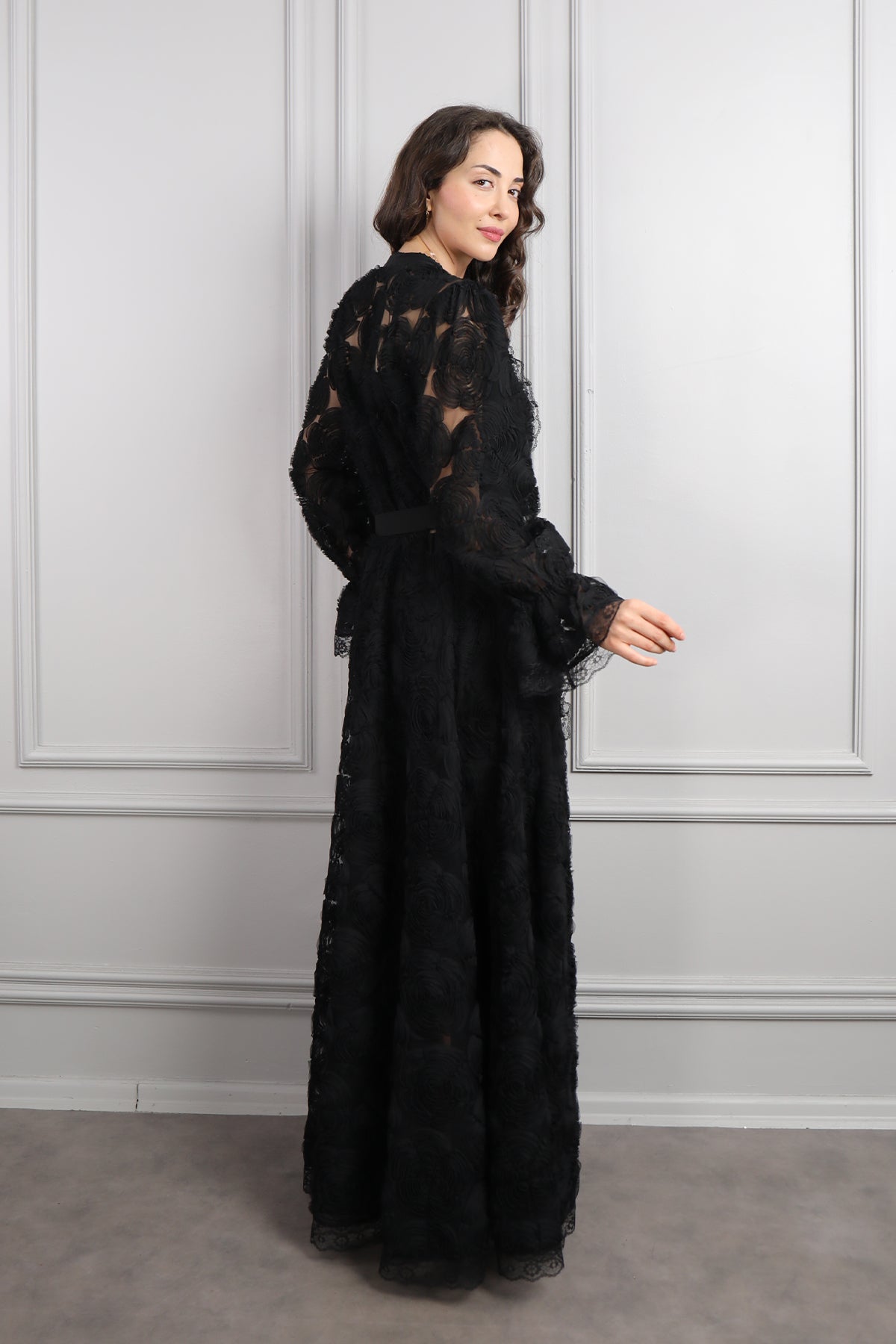 Zarif detaylarıyla göz kamaştıran Çiçek Detaylı Dantelli Elbise. V yaka kesimi ve bel kısmındaki ayarlanabilir kemeri sayesinde vücut hatlarını kusursuz biçimde öne çıkarırken, romantik dantel kumaşı ve çiçek işlemeleri ile feminen bir hava yaratır. Uzun ve dökümlü eteği zarafeti ön plana çıkarırken, rahat kalıbı gün boyu konfor sunar. hem şıklığı hem de rahatlığı bir arada isteyen kadınlar için mükemmel bir seçimdir. özel davetlerden akşam organizasyonlarına kadar her ortamda asil bir duruş sergilemenizi sağlar.