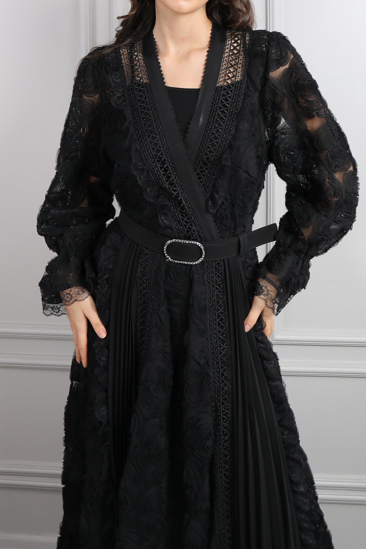 Beli Kemerli Çiçek Detaylı Dantelli Büyük Beden Elbise