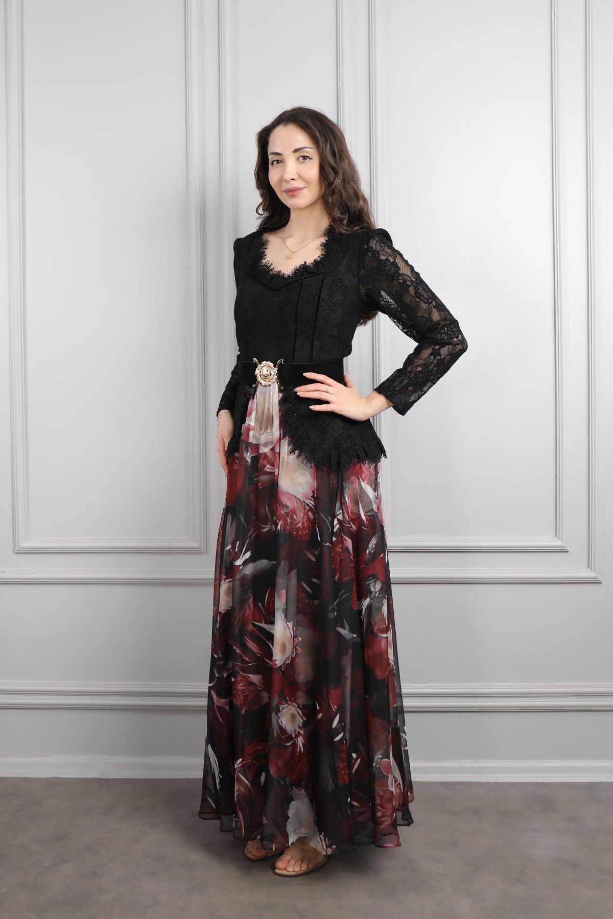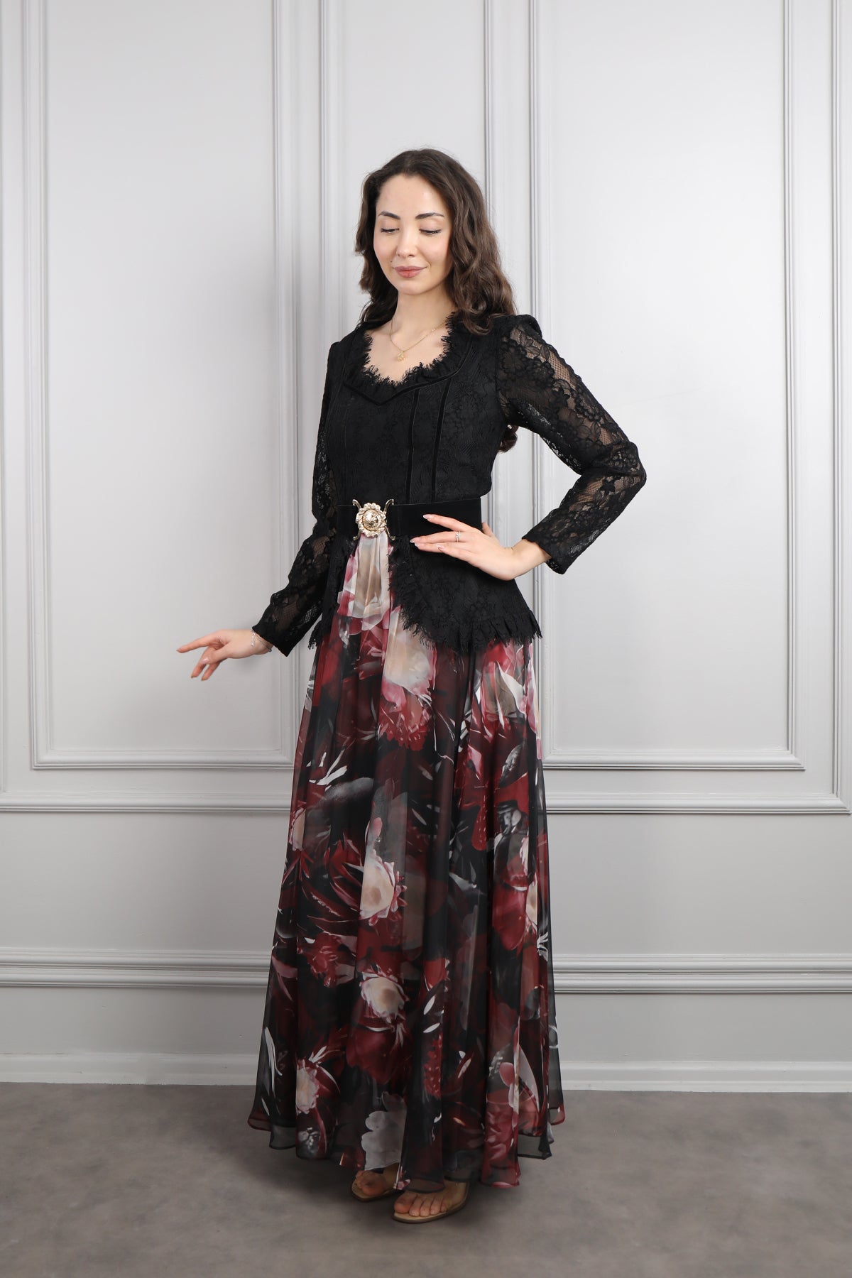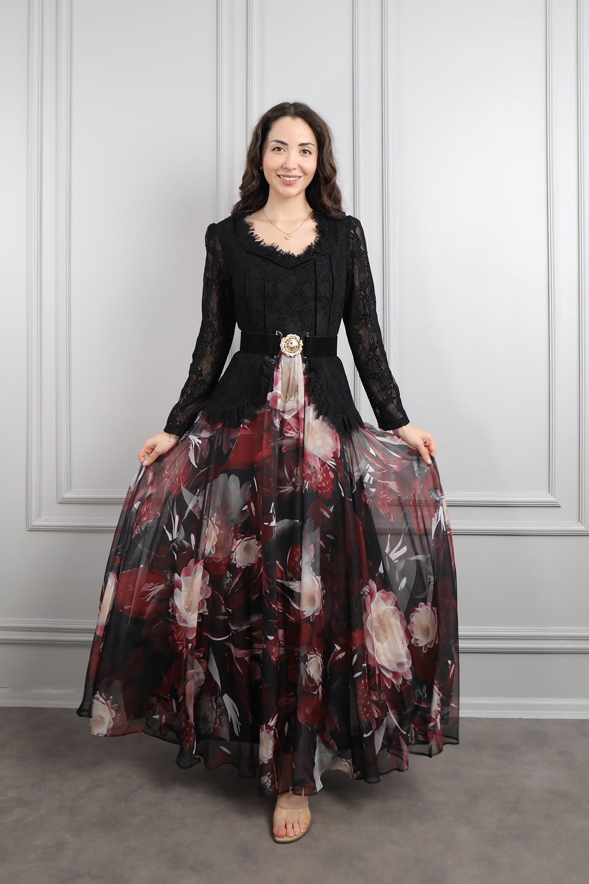 Beli Kemerli Dantelli Desenli Büyük Beden Şifon Elbise Siyah-Bordo Özellikleri