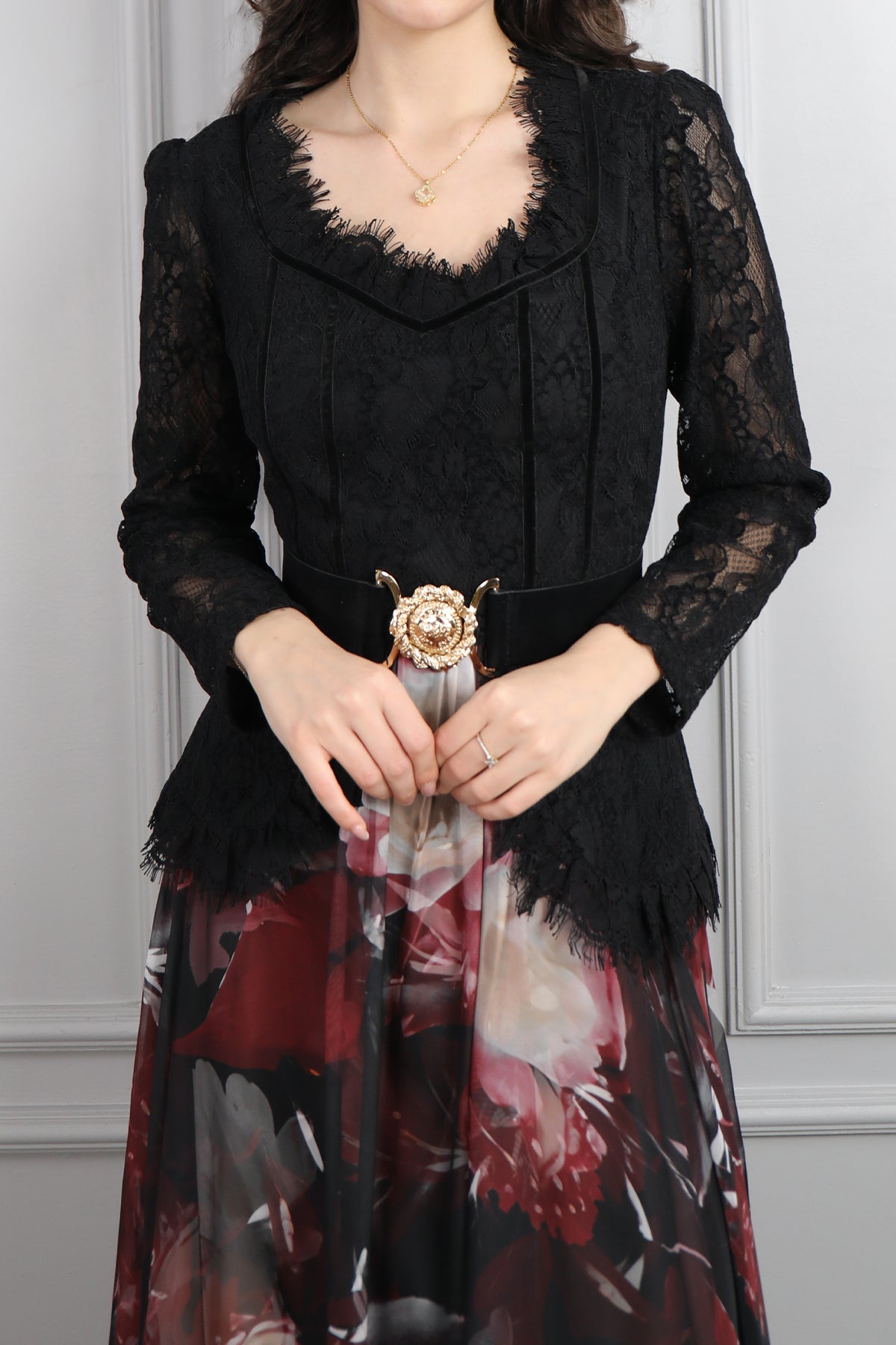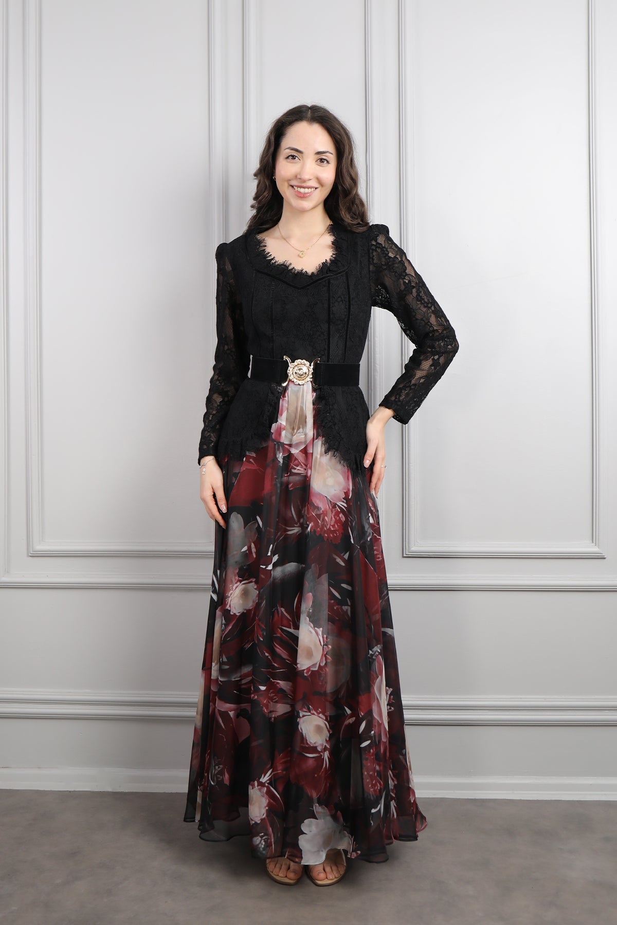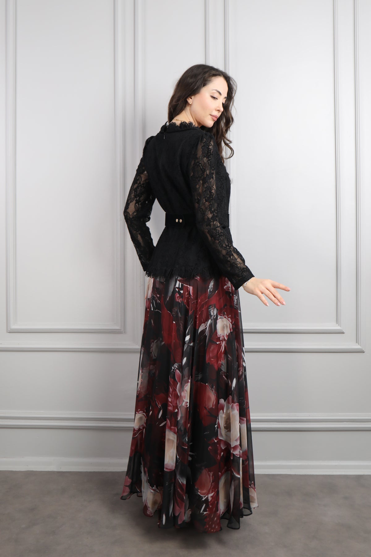 Beli Kemerli Dantelli Desenli Büyük Beden Şifon Elbise Siyah-Bordo Özellikleri