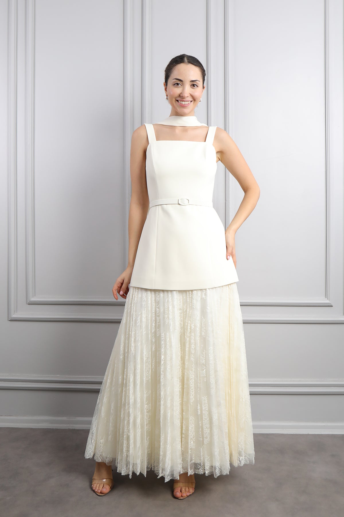 Beli Kemerli Fular Detaylı Elbise Takım Ekru Özellikleri