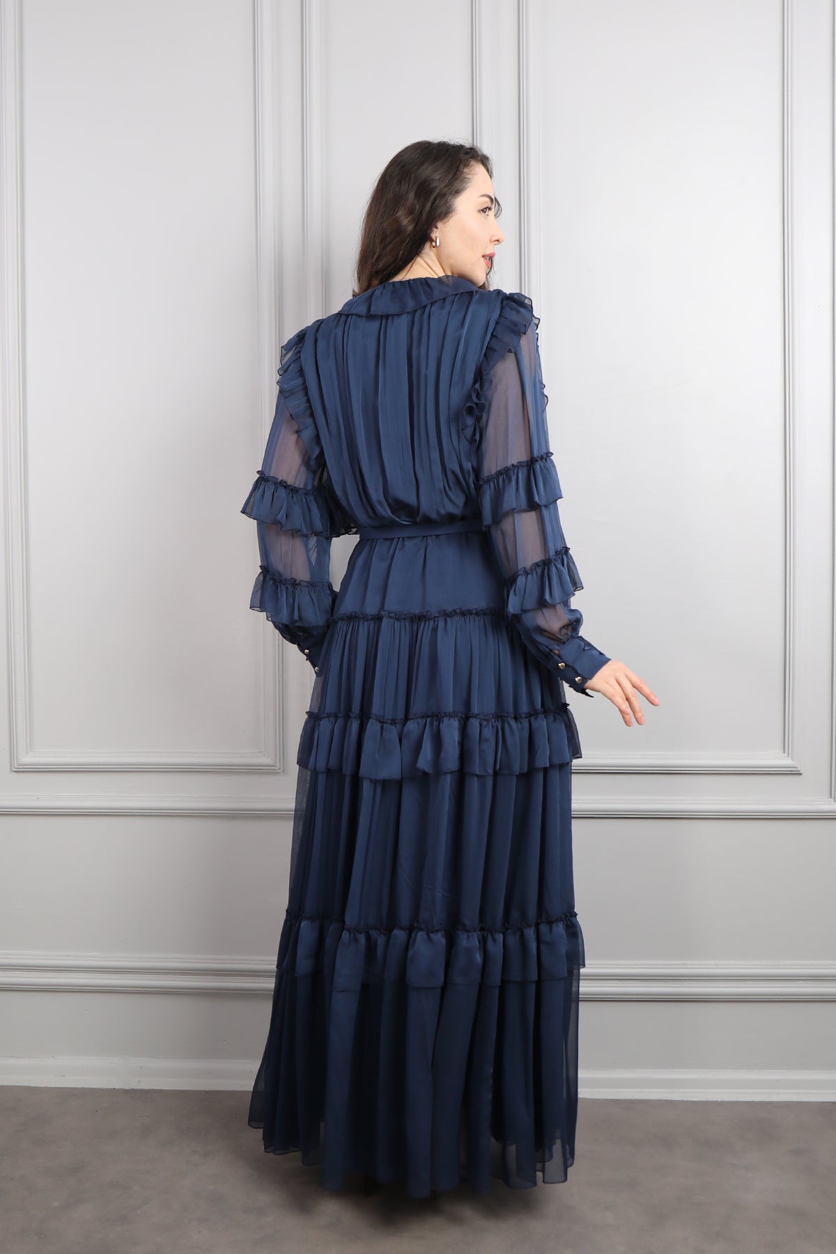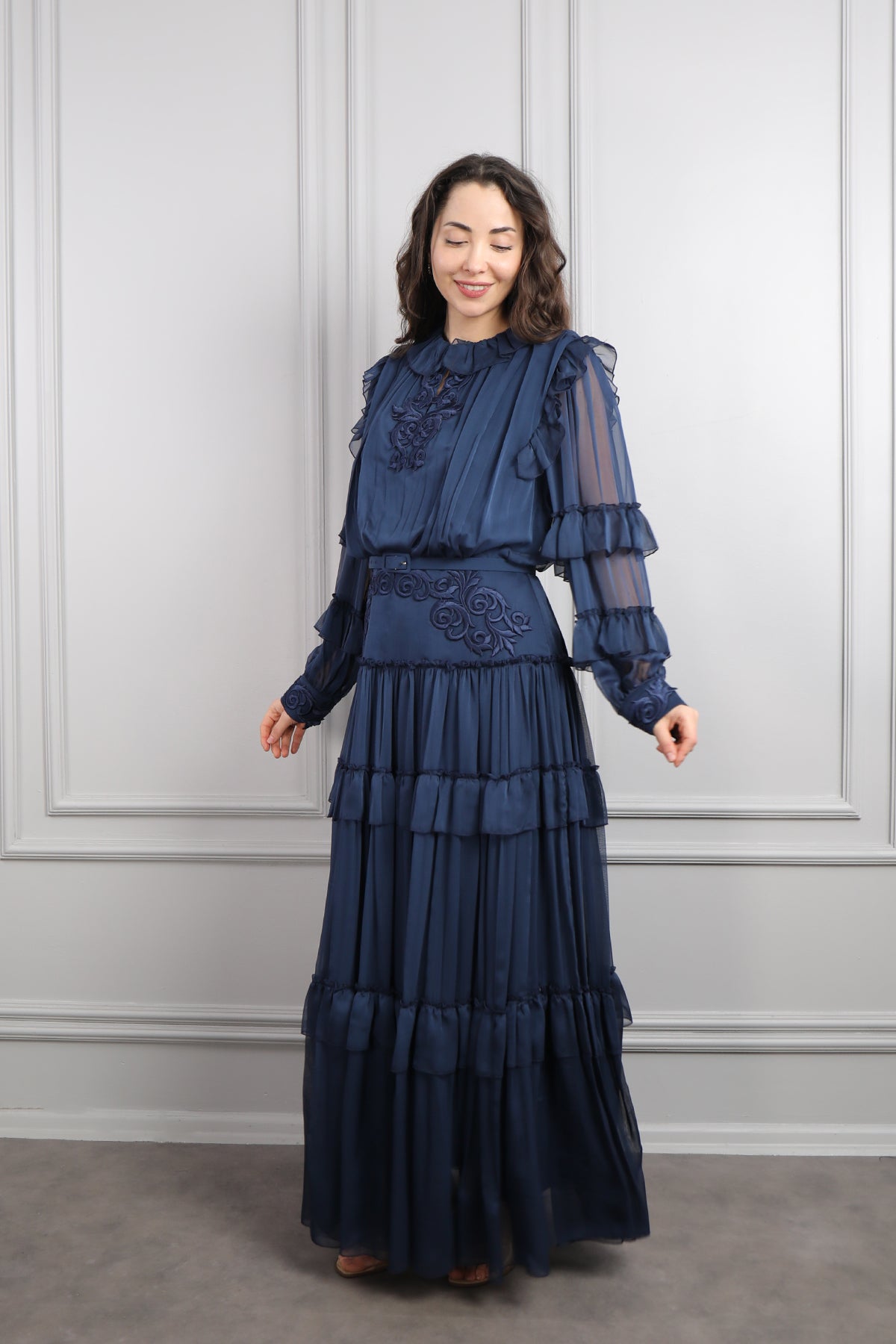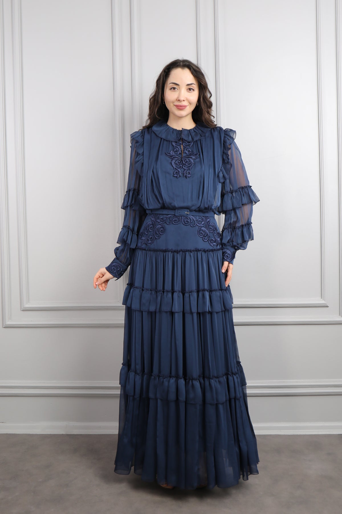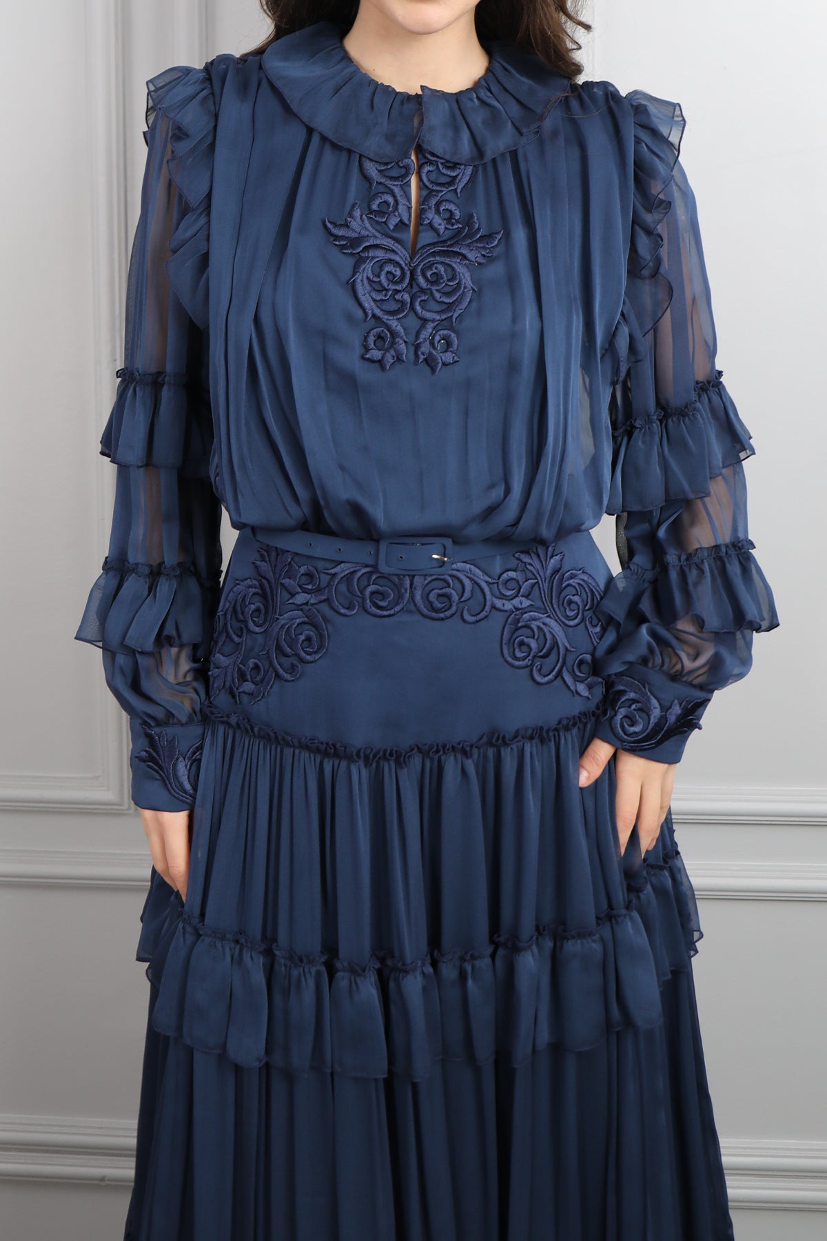 Beli Kemerli İşlemeli Fırfır Detaylı Büyük Beden Şifon Elbise Lacivert