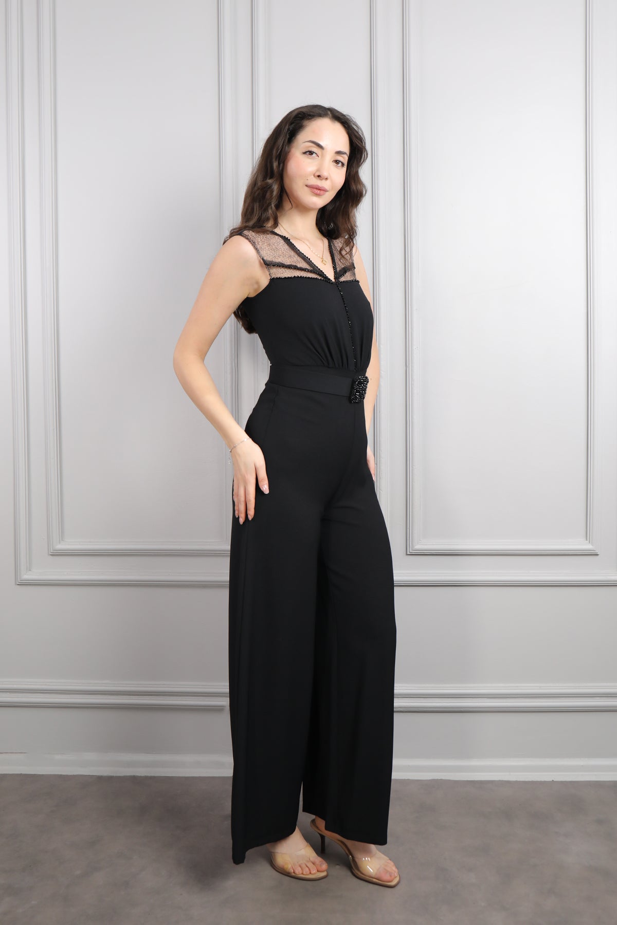 Beli Kemerli Omuuz Transparan Detaylı Boncuk İşlemeli Tulum Siyah