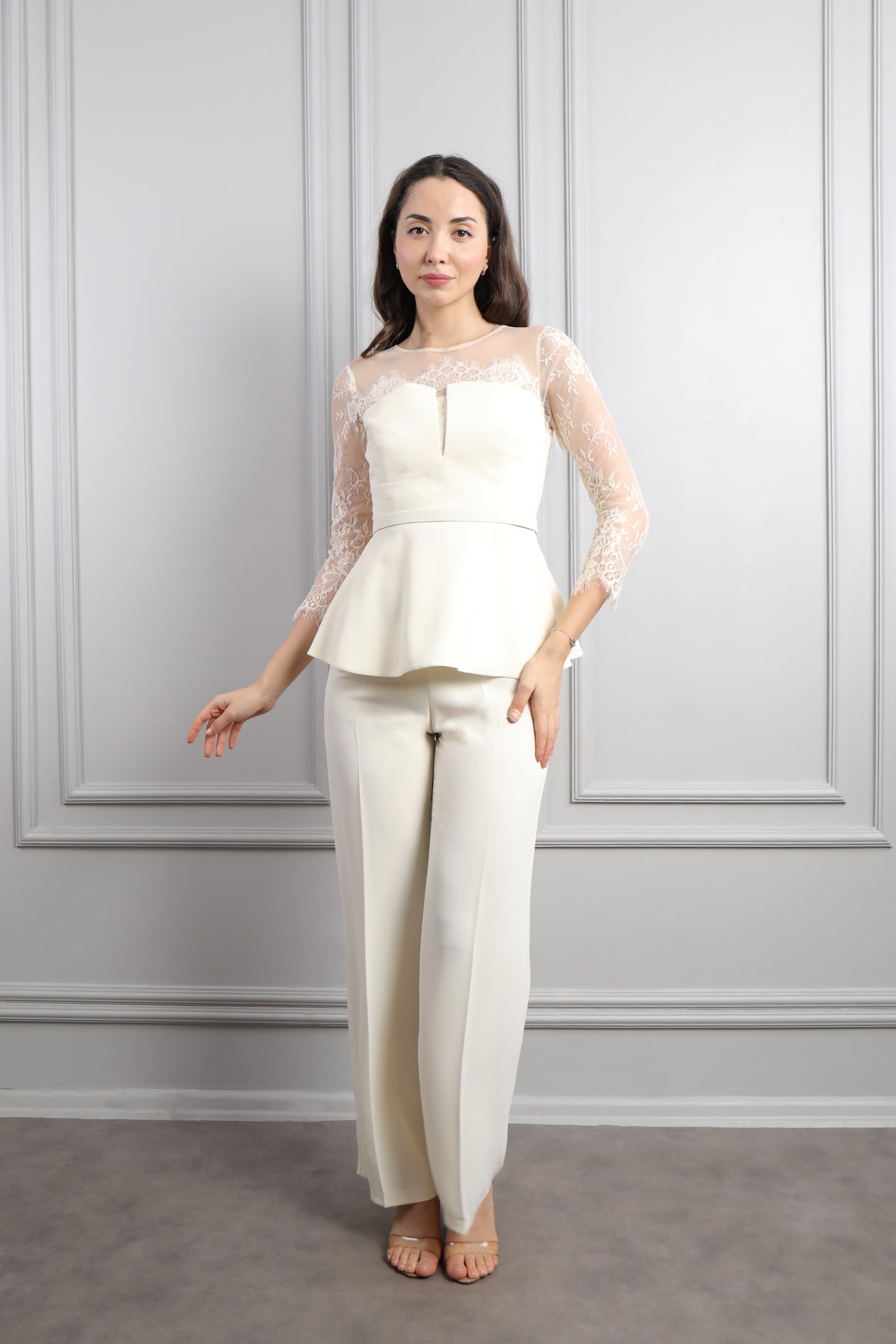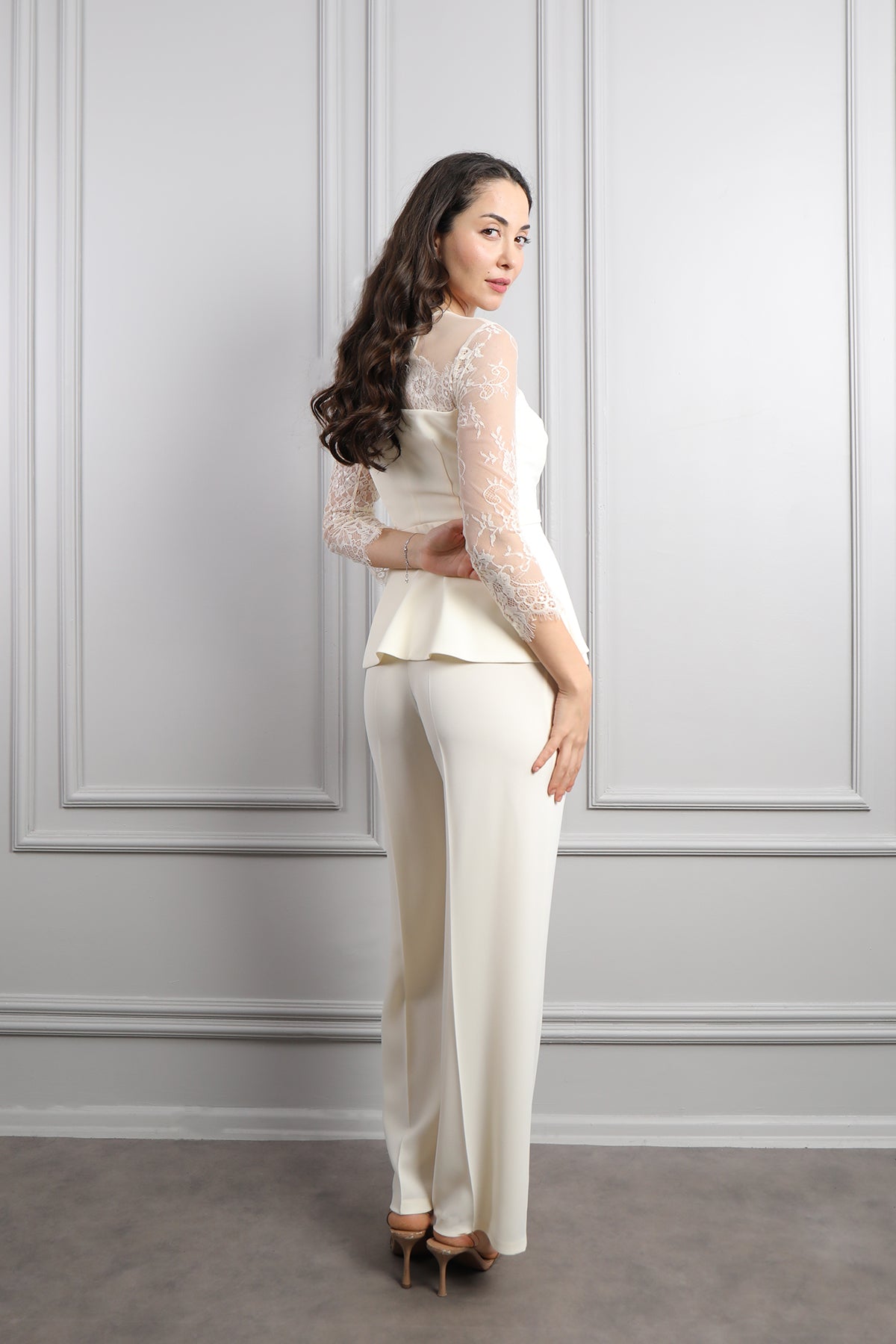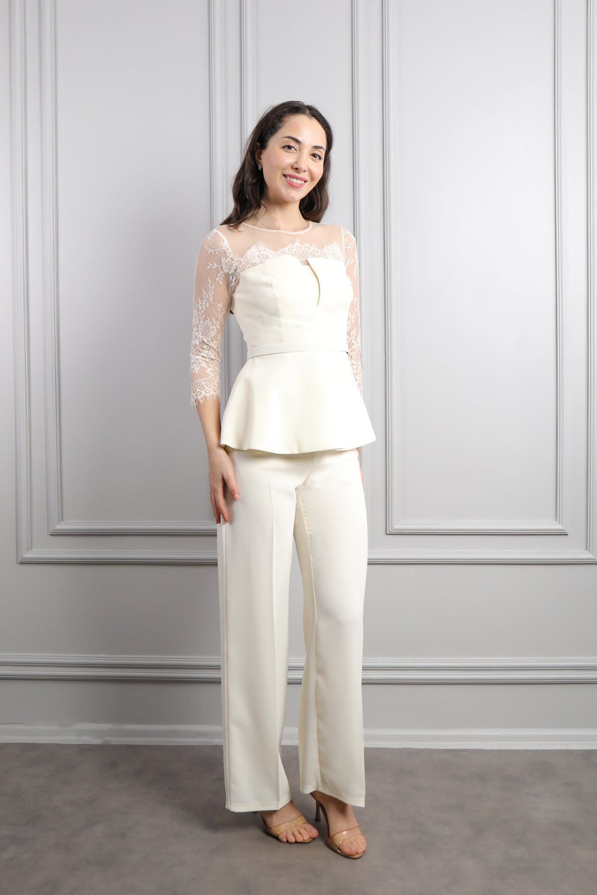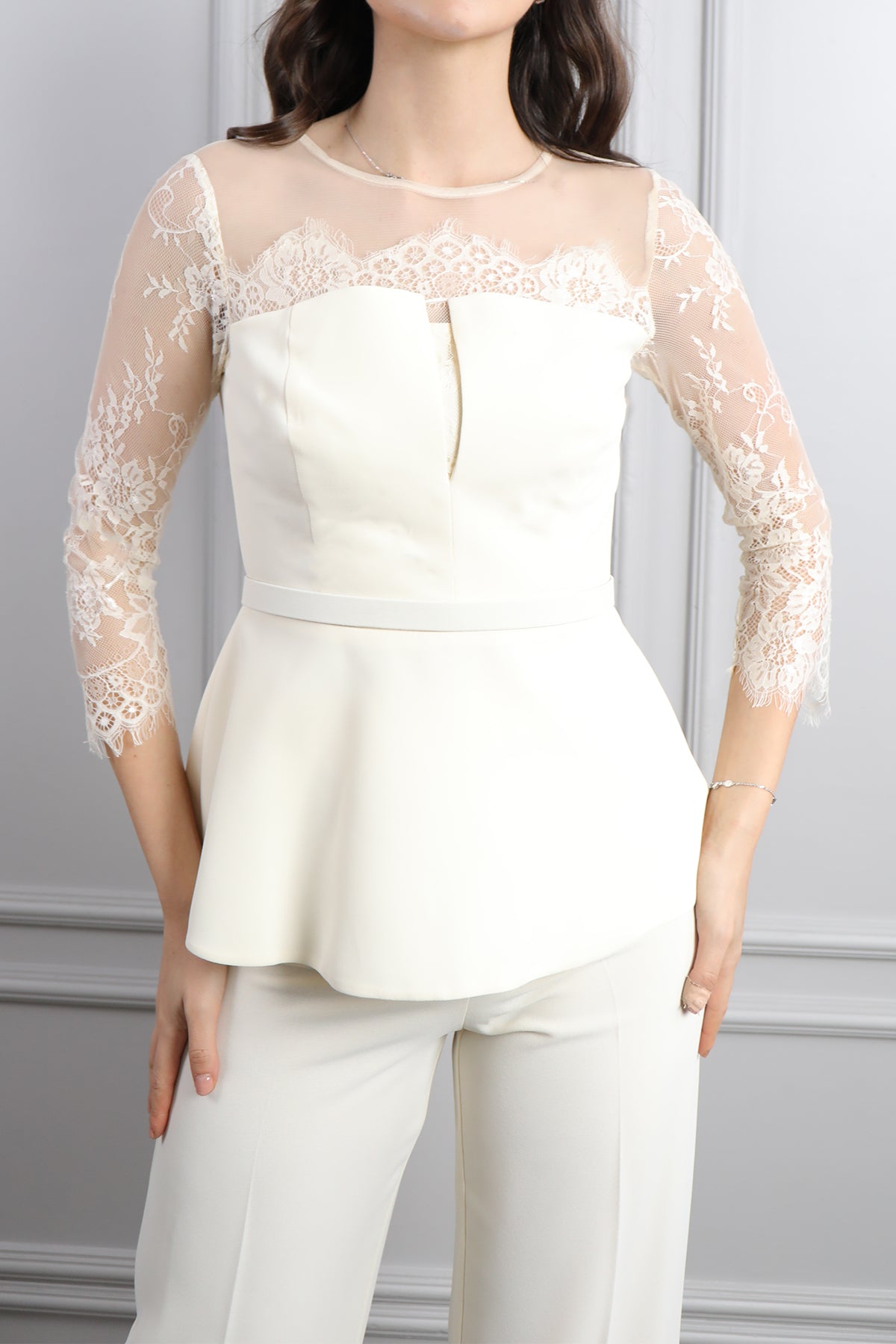 Beli Kemerli Trasparan Detaylı Pantolon Takım Ekru