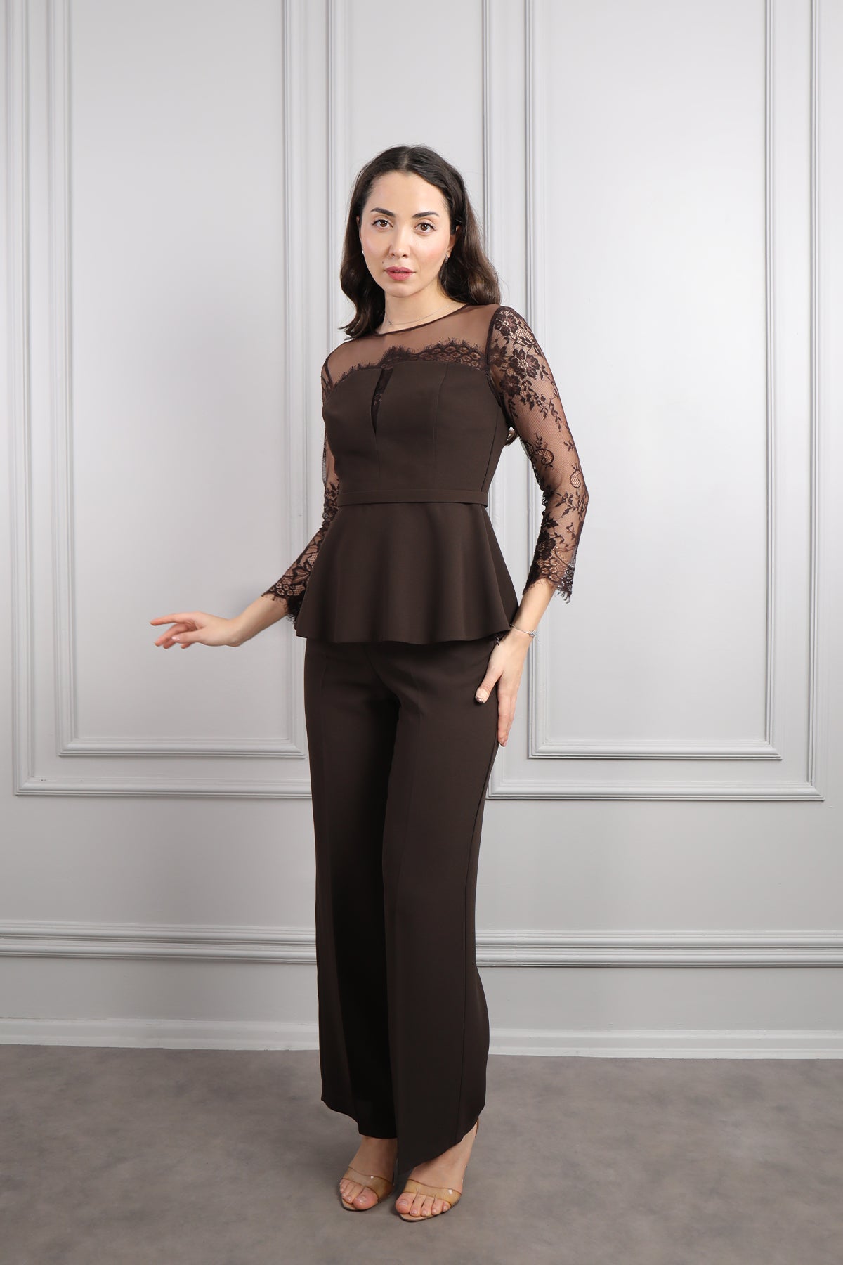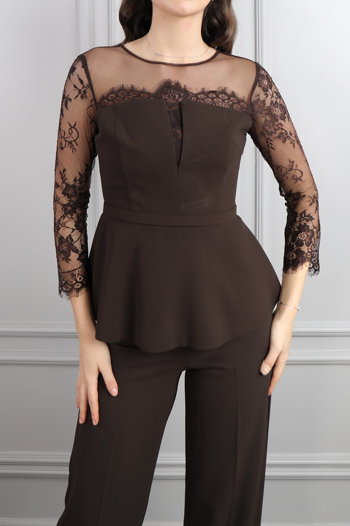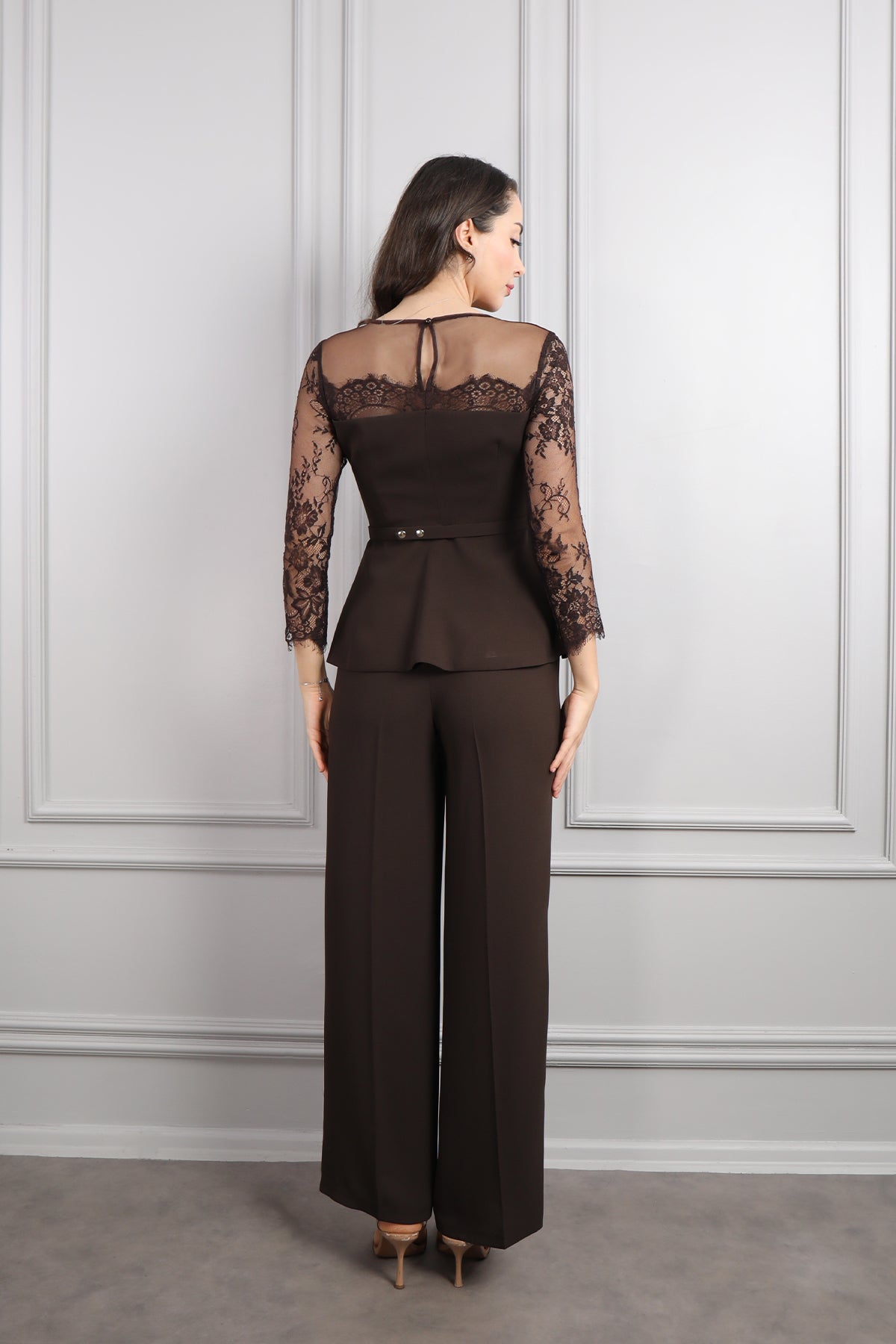Beli Kemerli Trasparan Detaylı Pantolon Takım Kahve