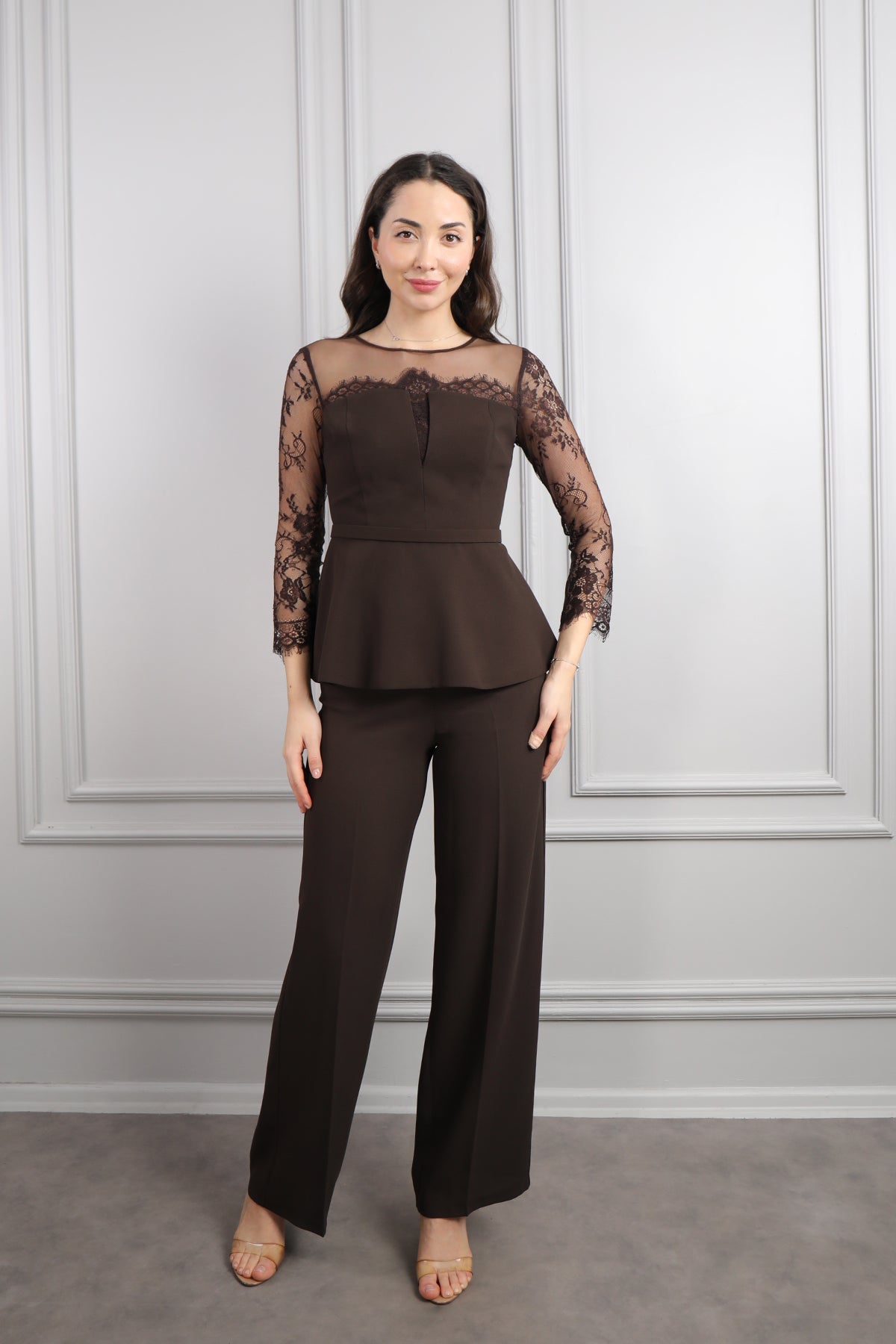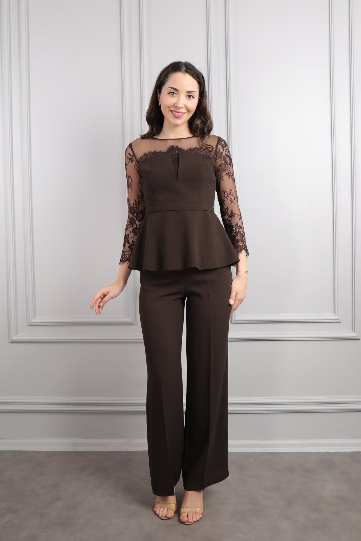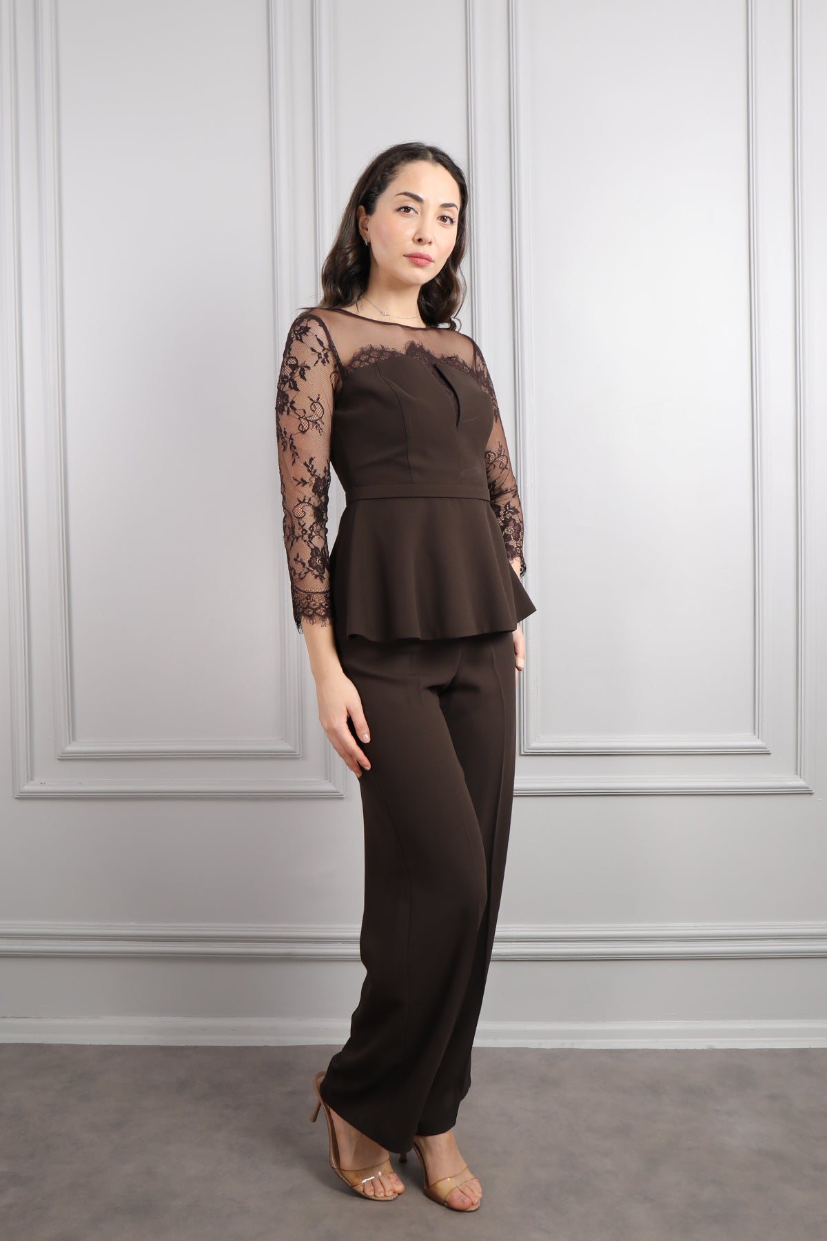 Beli Kemerli Trasparan Detaylı Pantolon Takım Kahve