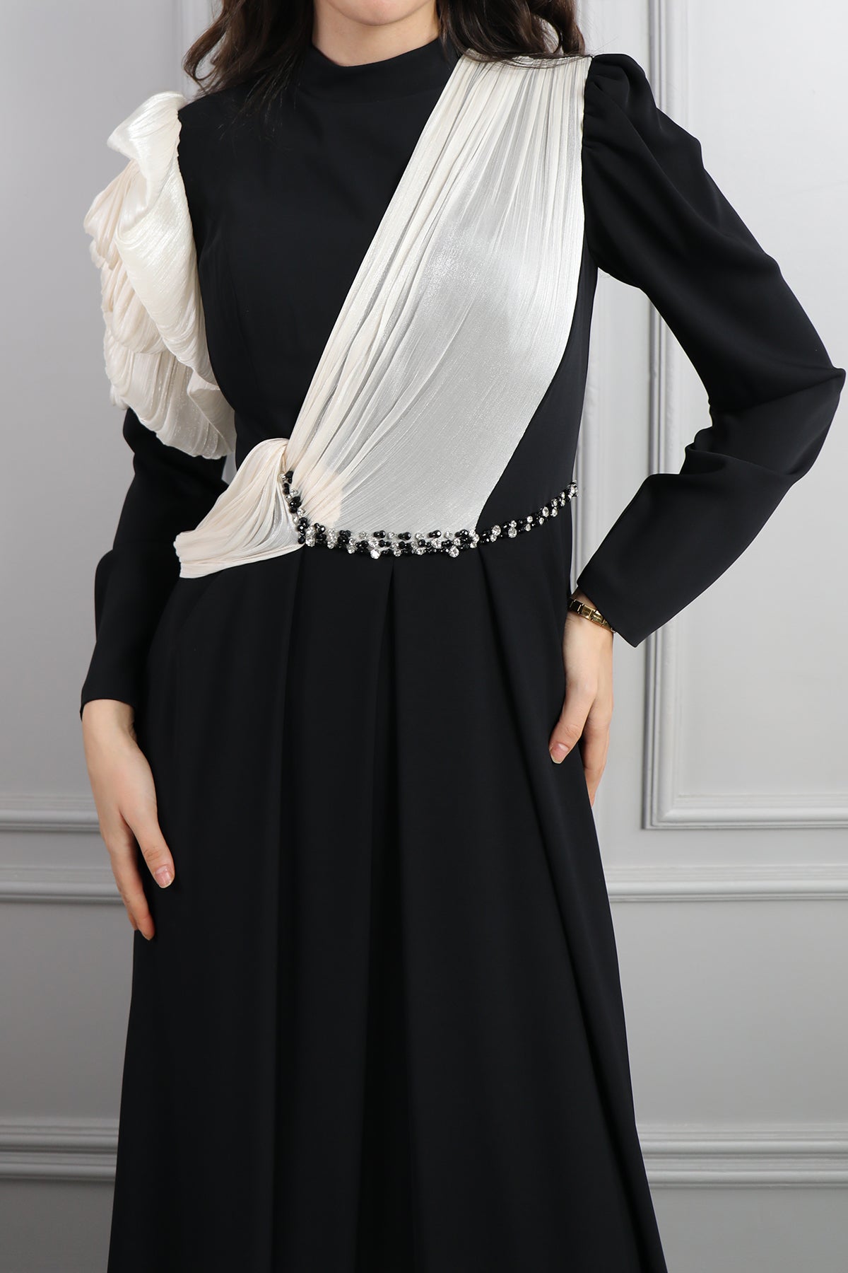 Beli Taş İşlemeli Şifon Detaylı Tesettür Elbise Siyah