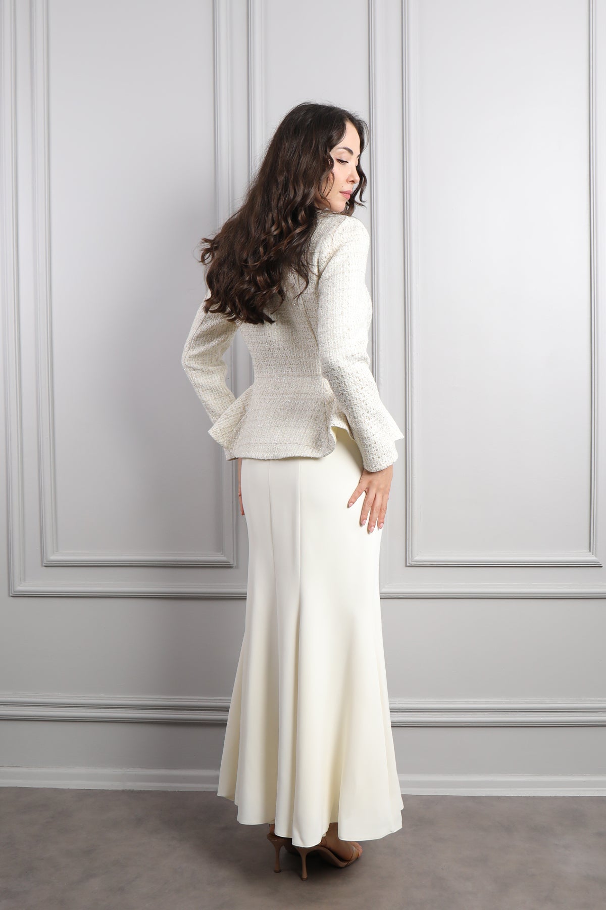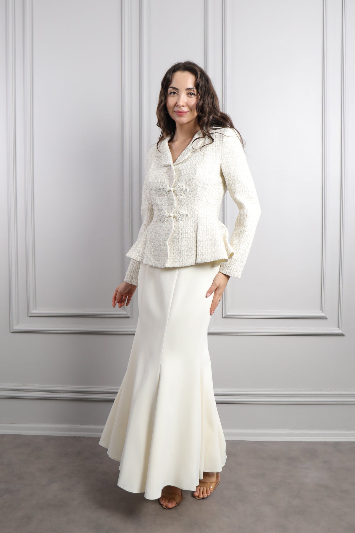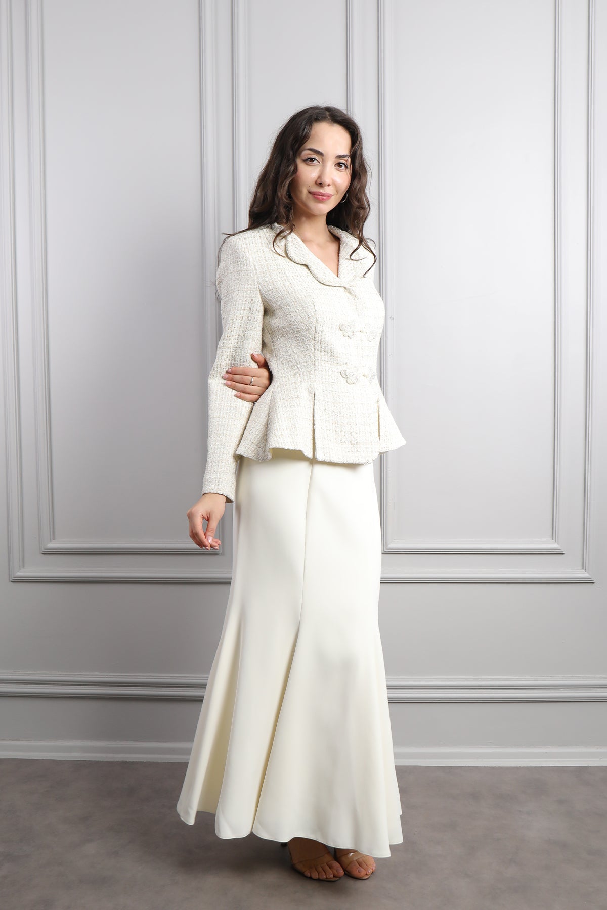 Boncuk Düğme Detaylı Tüvit Ceket Etek Takım Ekru
