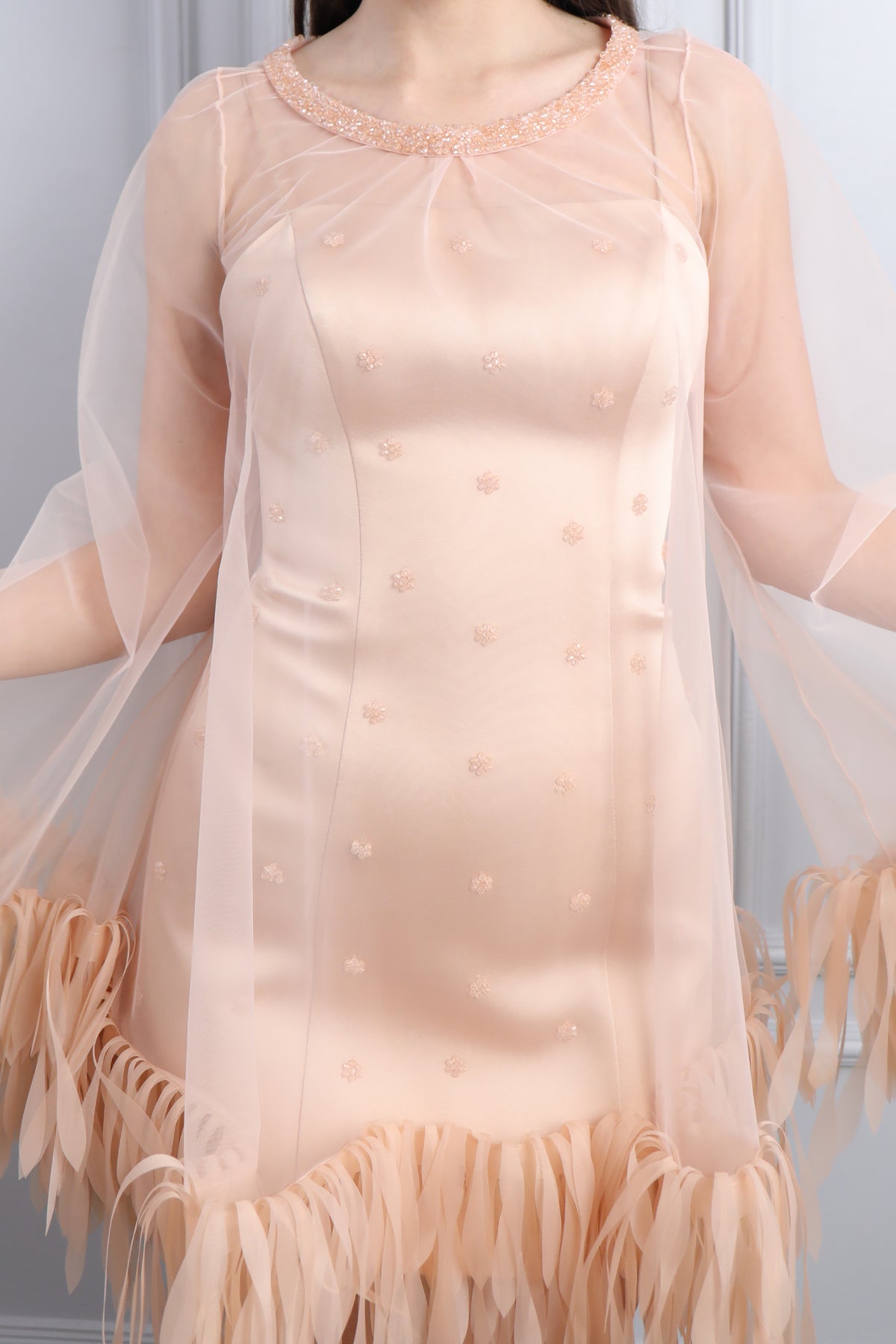 Boncuk İşlemeli Pelerini Tül Detaylı Kısa Boy Saten Abiye Gold