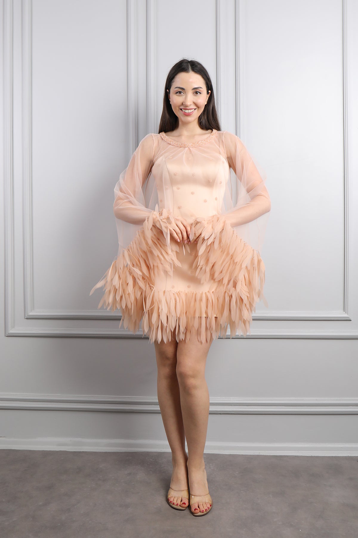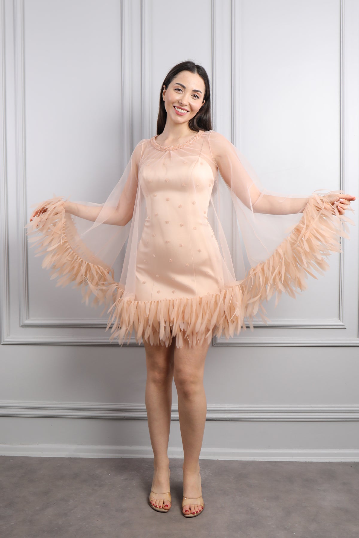 Boncuk İşlemeli Pelerini Tül Detaylı Kısa Boy Saten Abiye Gold Özellikleri