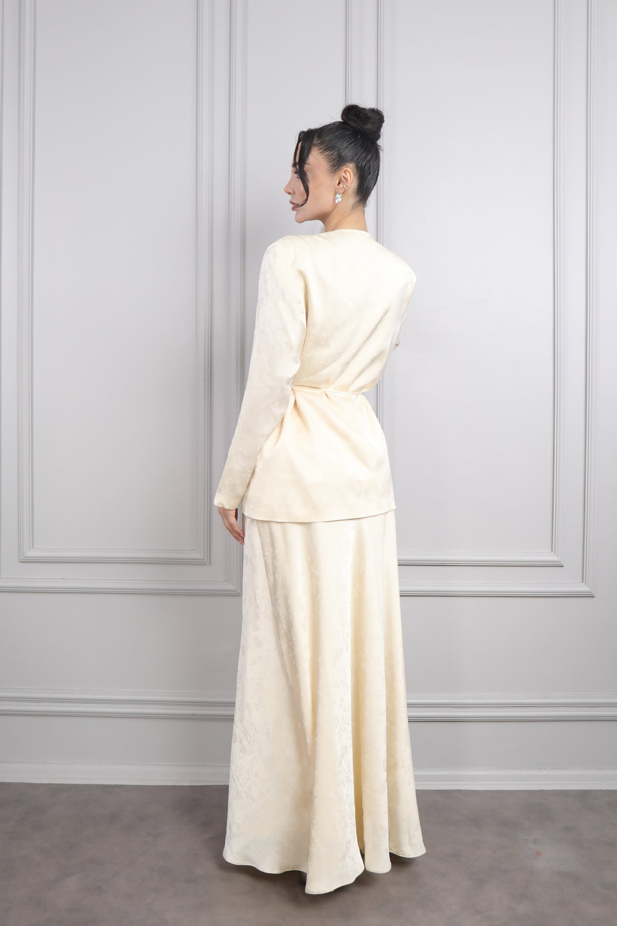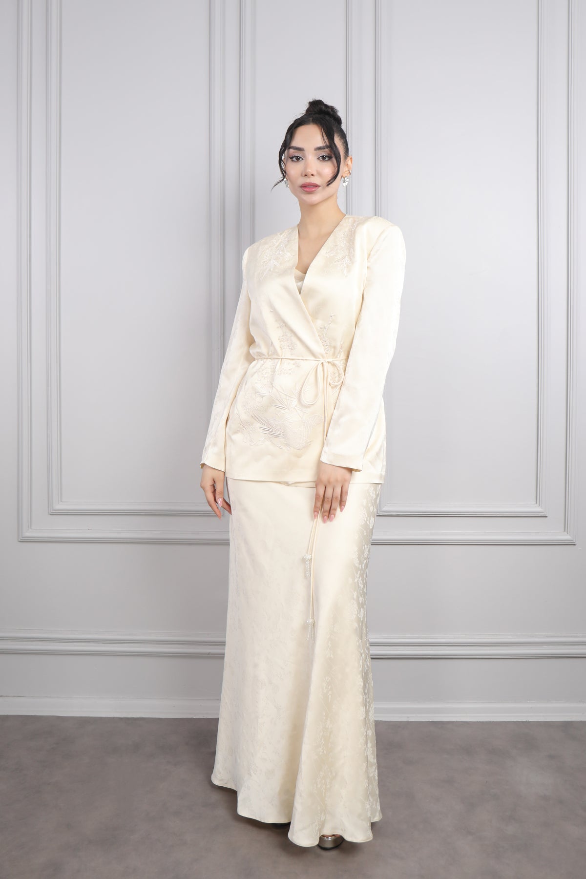 Ceketi Boncuk İşlemeli Desenli Beli Kuşaklı Saten Etek Takım Ekru