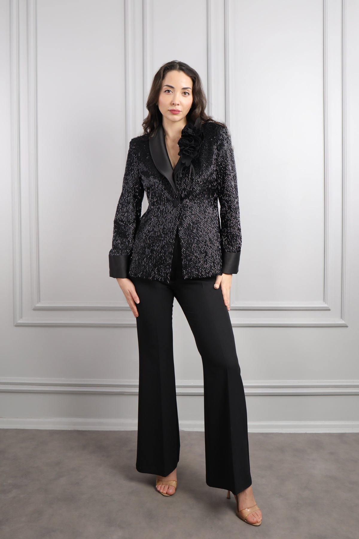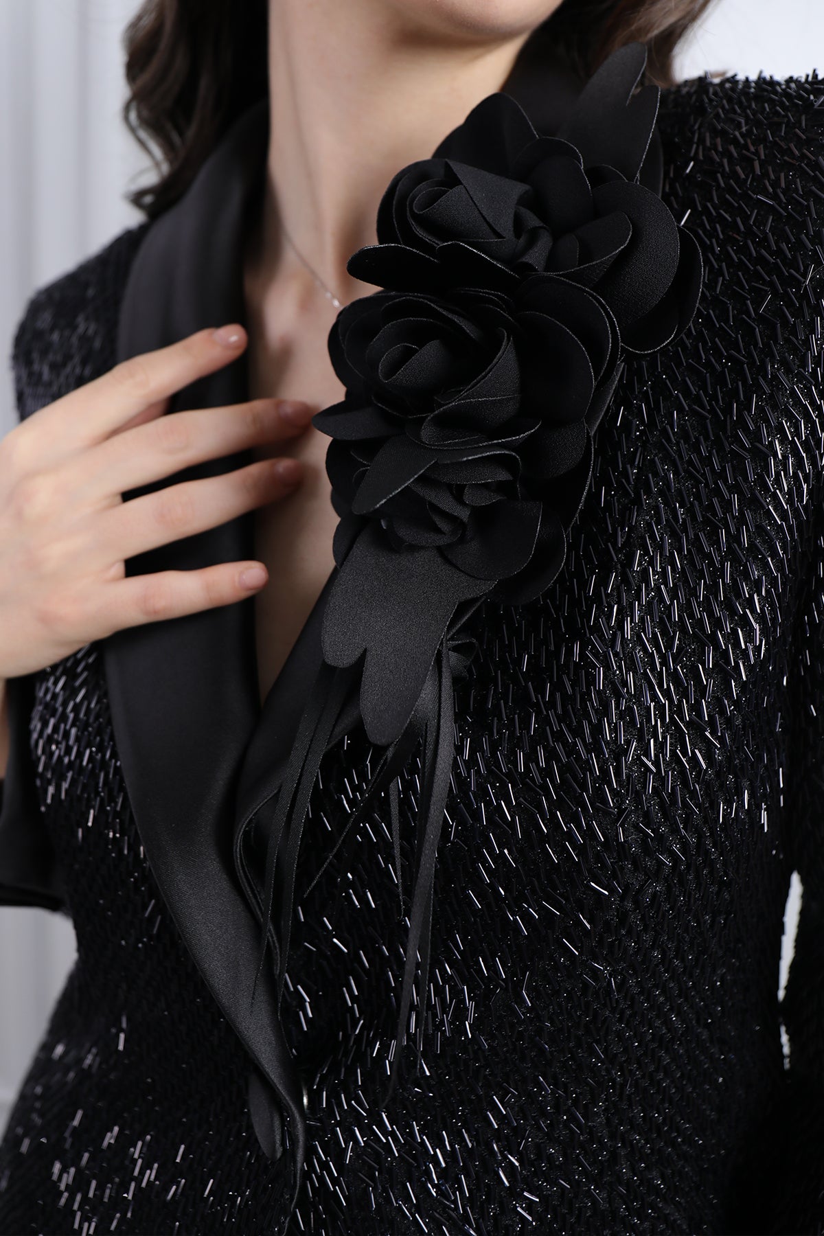 Ceketi Çiçek Detaylı Boncuk İşlemeli Pantolon Takım Siyah