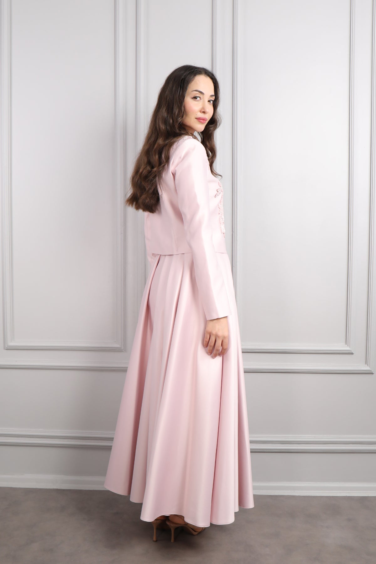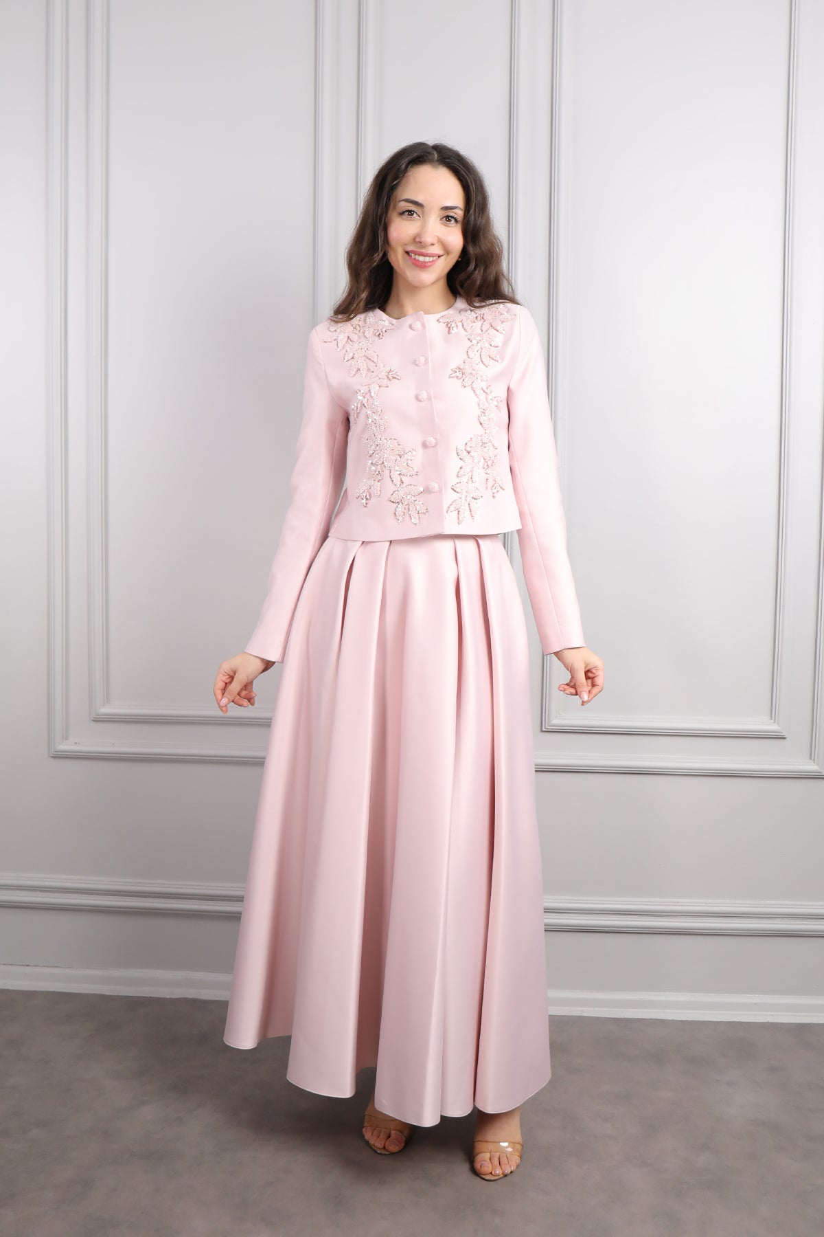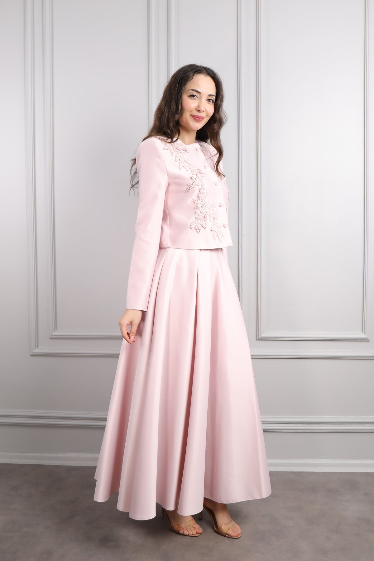 Ceketi Düğme Detaylı Boncuk İşlemeli Etek Takım Pudra Özellikleri
