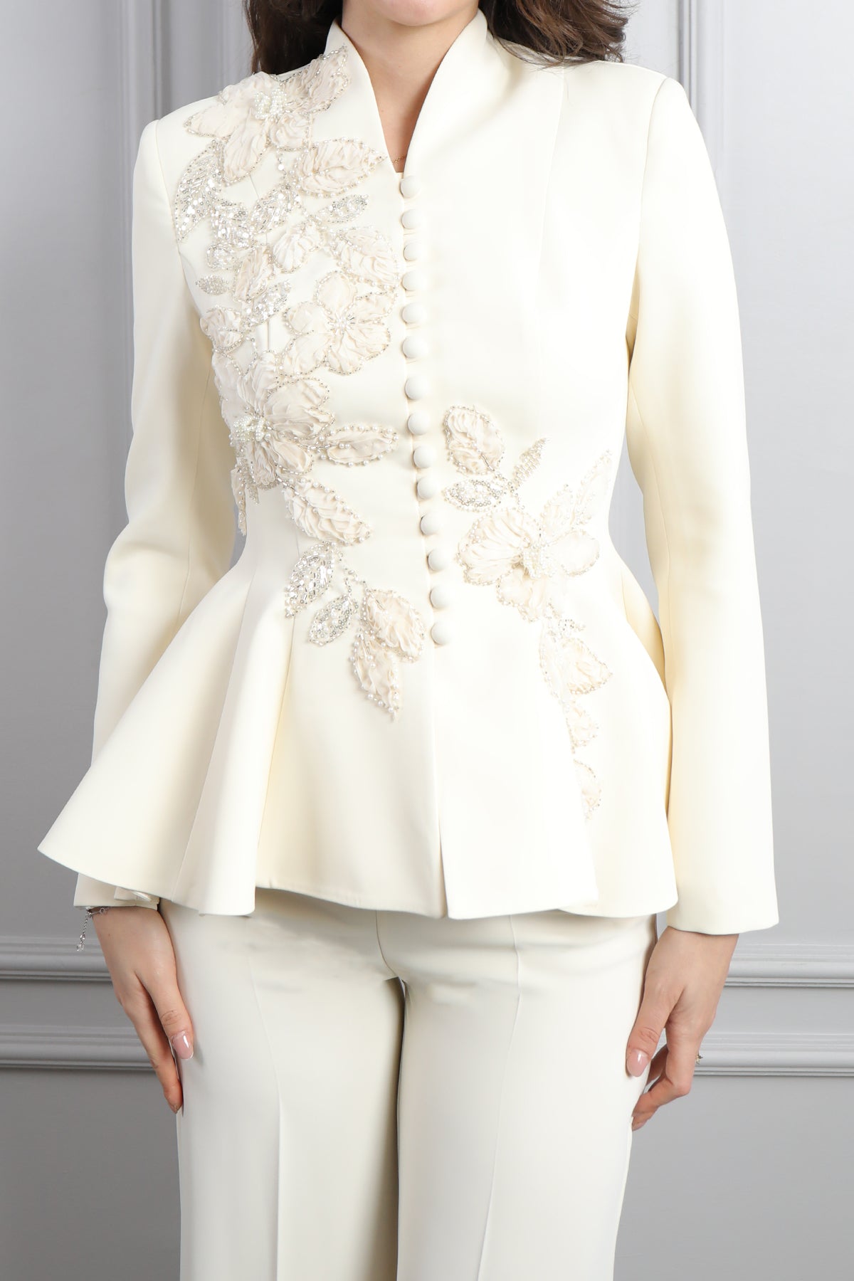 Ceketi Düğme Detaylı Çiçek İşlemeli Pantolon Takım Ekru