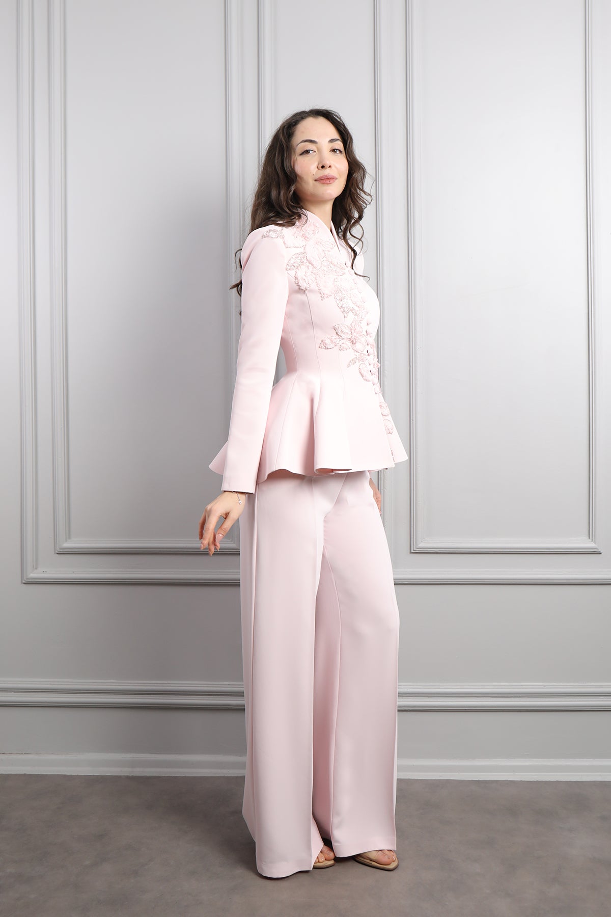 Ceketi Düğme Detaylı Çiçek İşlemeli Pantolon Takım Pudra