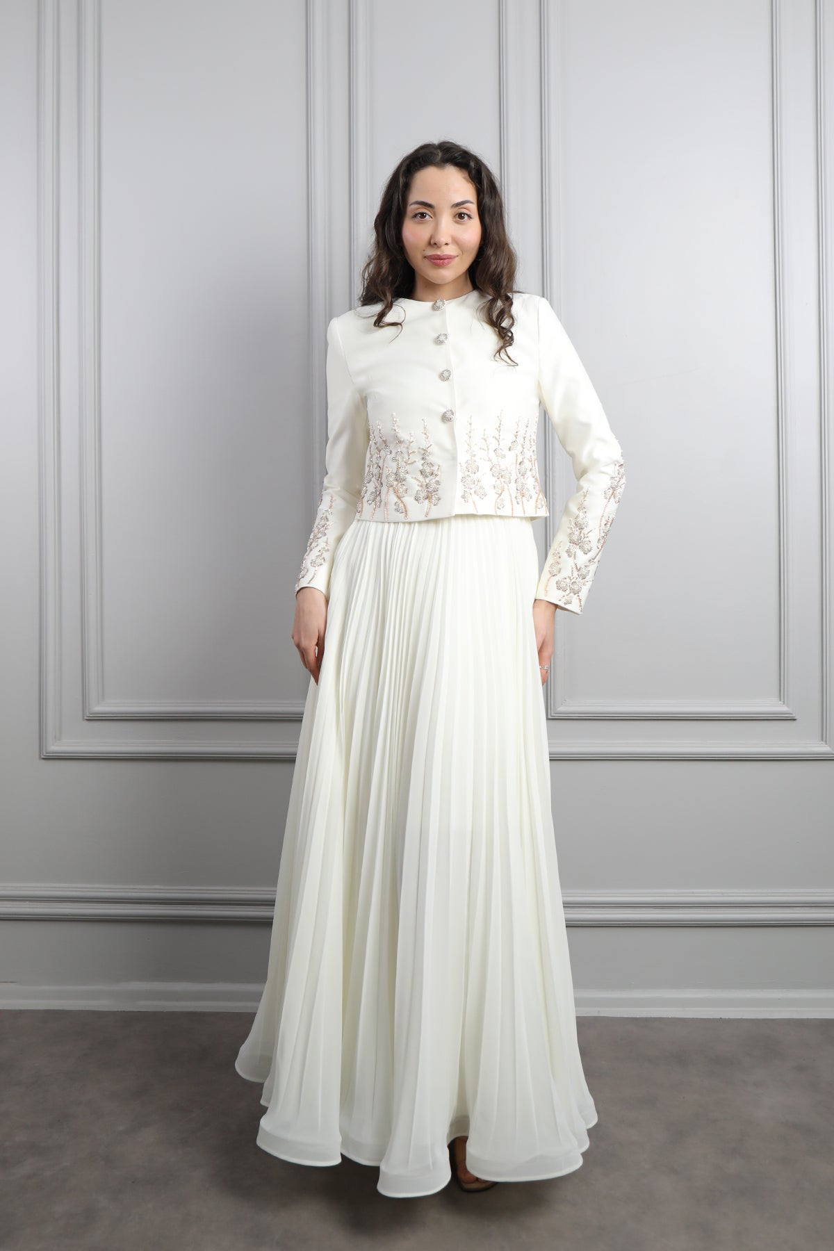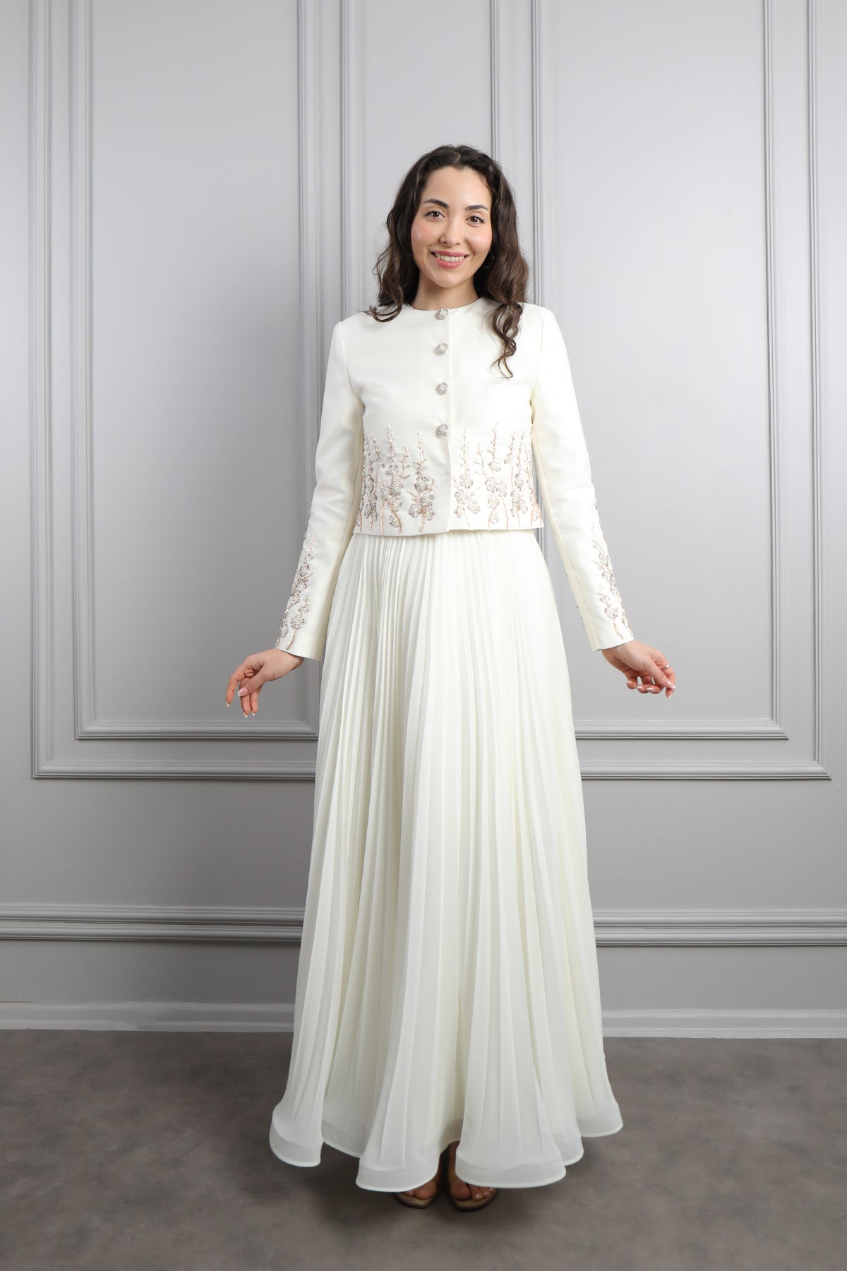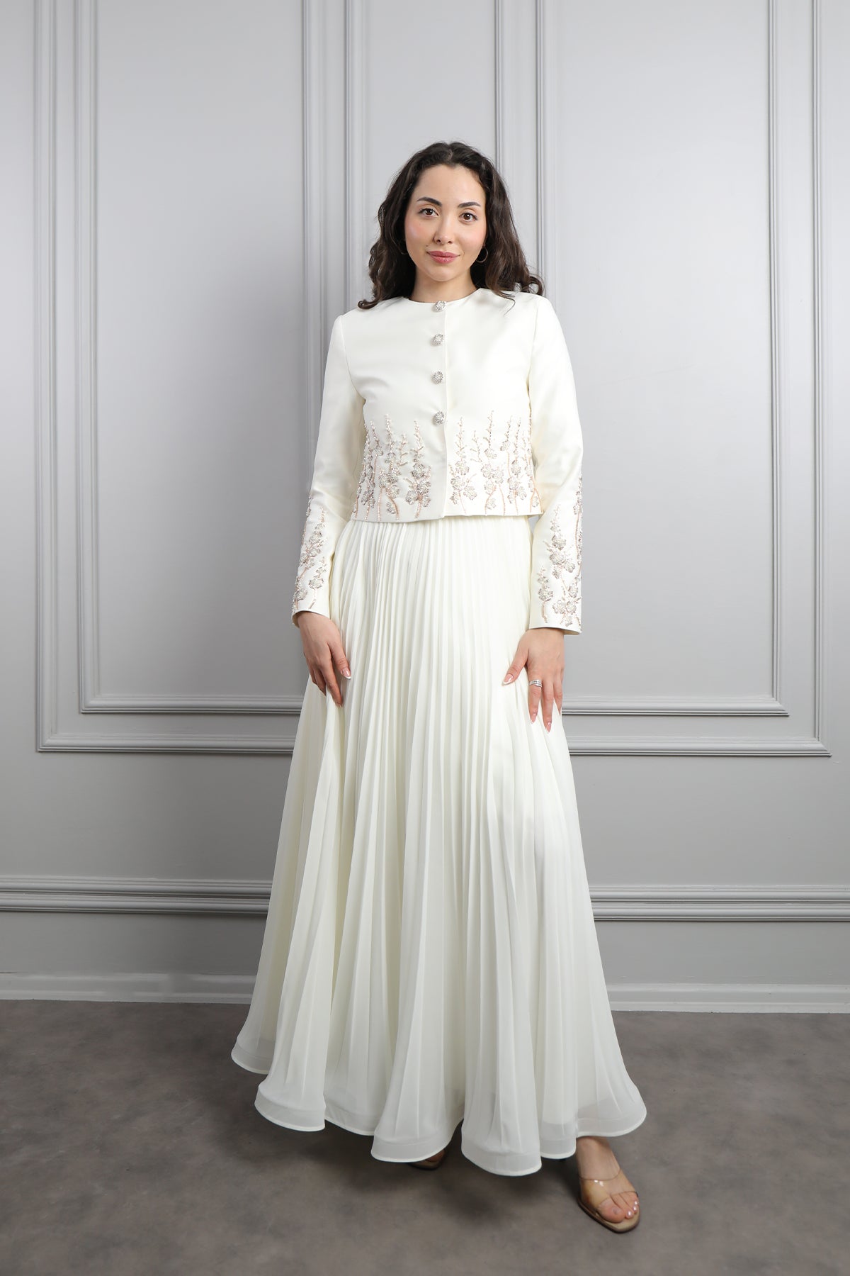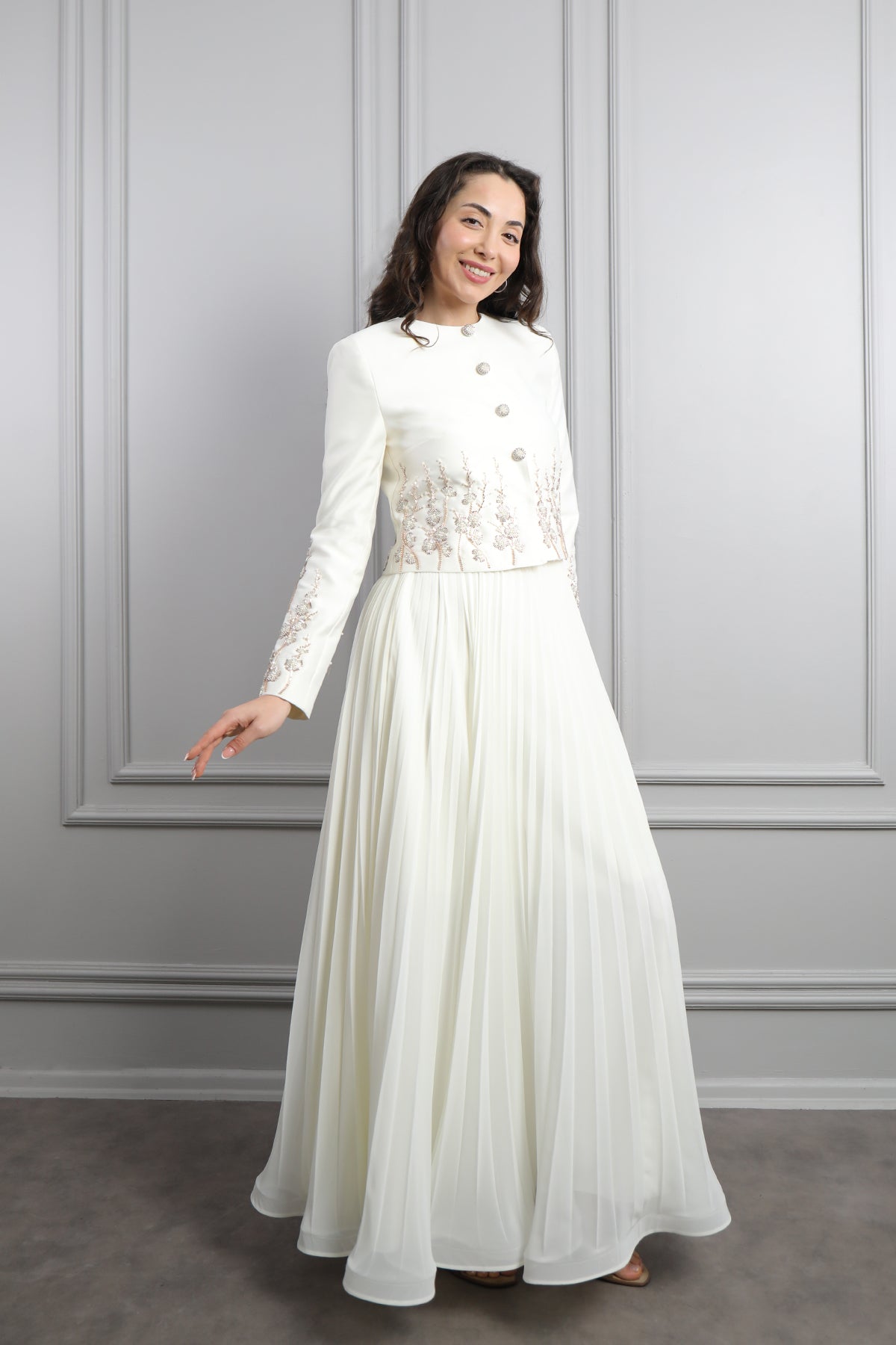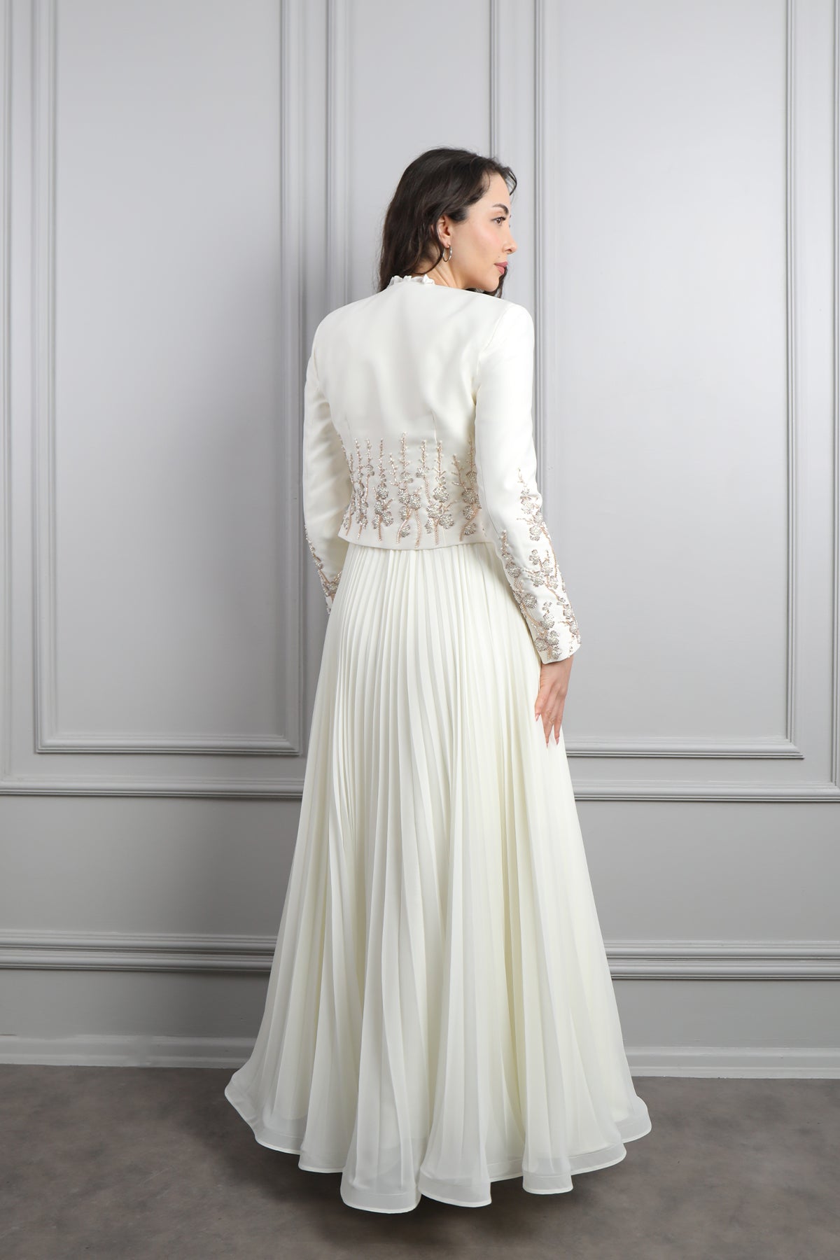 Ceketi Düğmeli Boncuk İşlemeli Pileli Elbise Takım Ekru