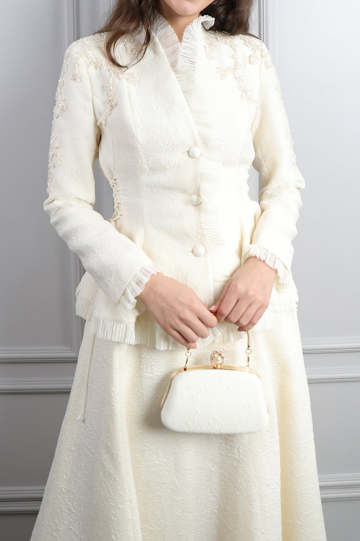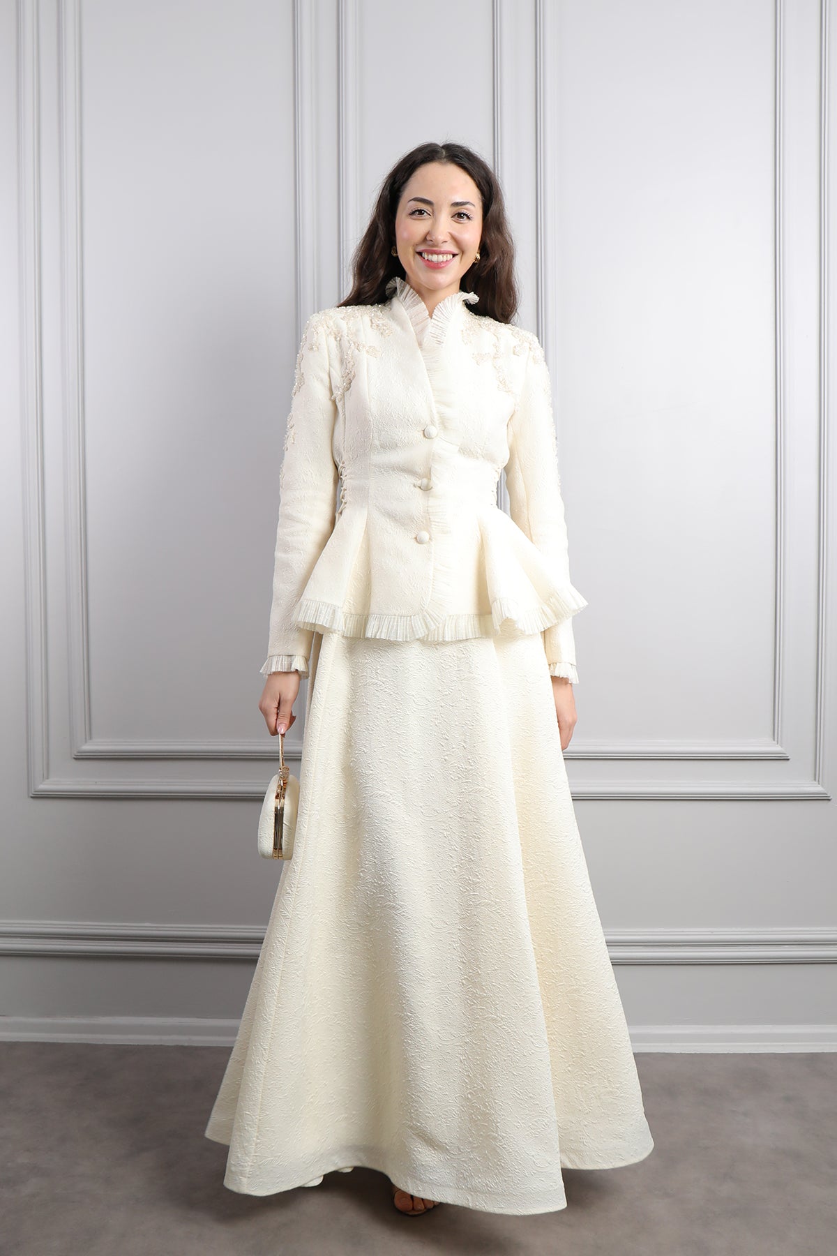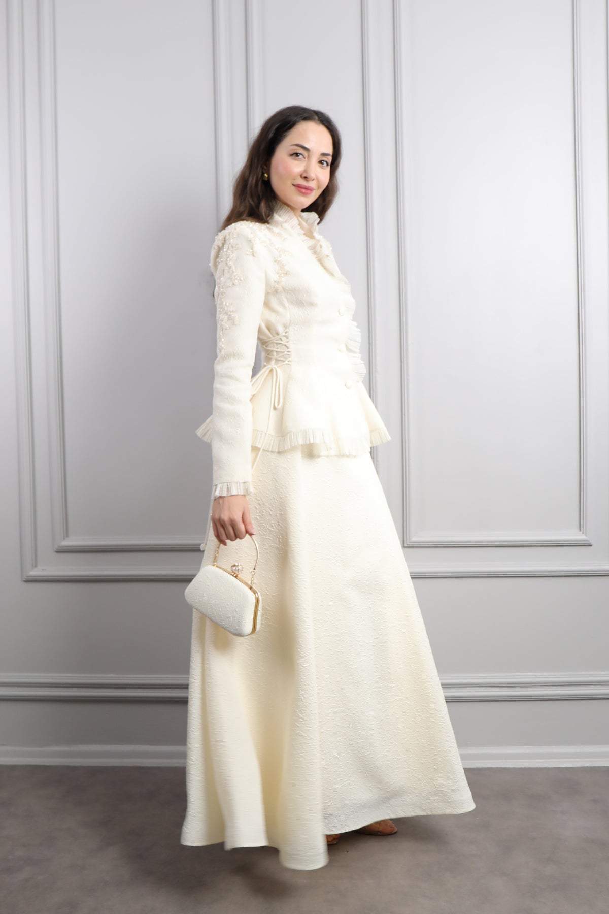 Ceketi Fırfırlı Boncuk İşlemeli Çanta Aksesuar Detaylı Etek Takım Ekru