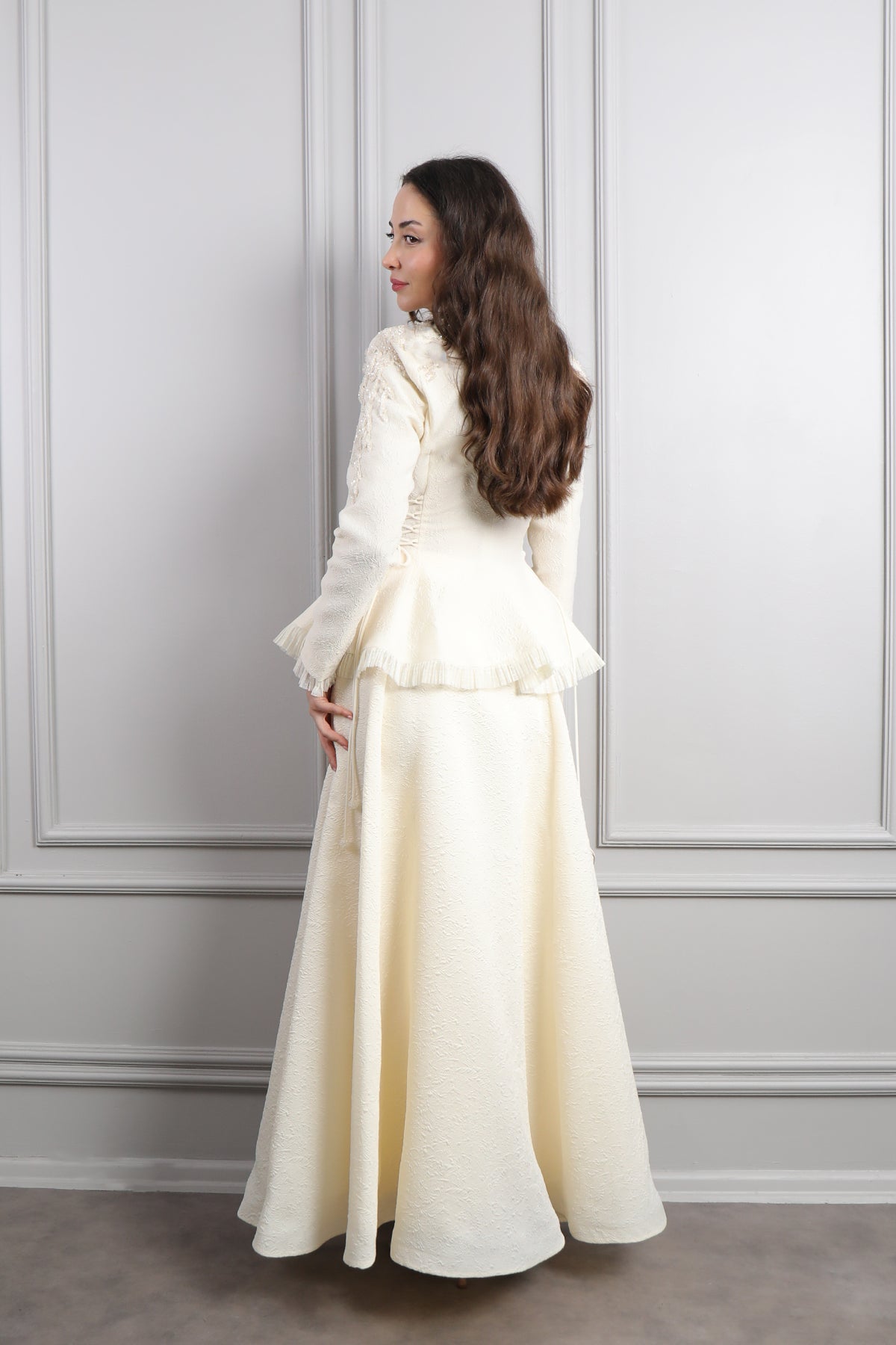 Ceketi Fırfırlı Boncuk İşlemeli Çanta Aksesuar Detaylı Etek Takım Ekru Özellikleri