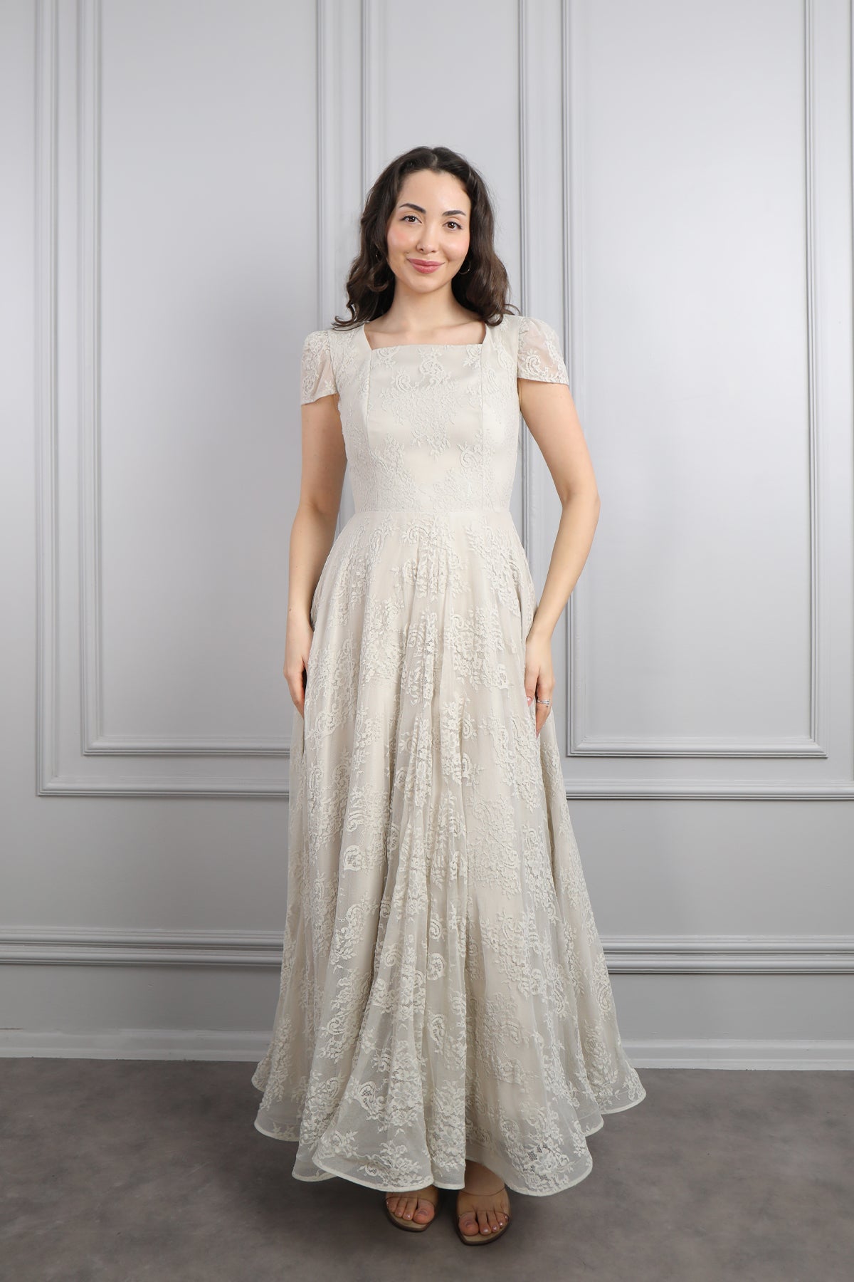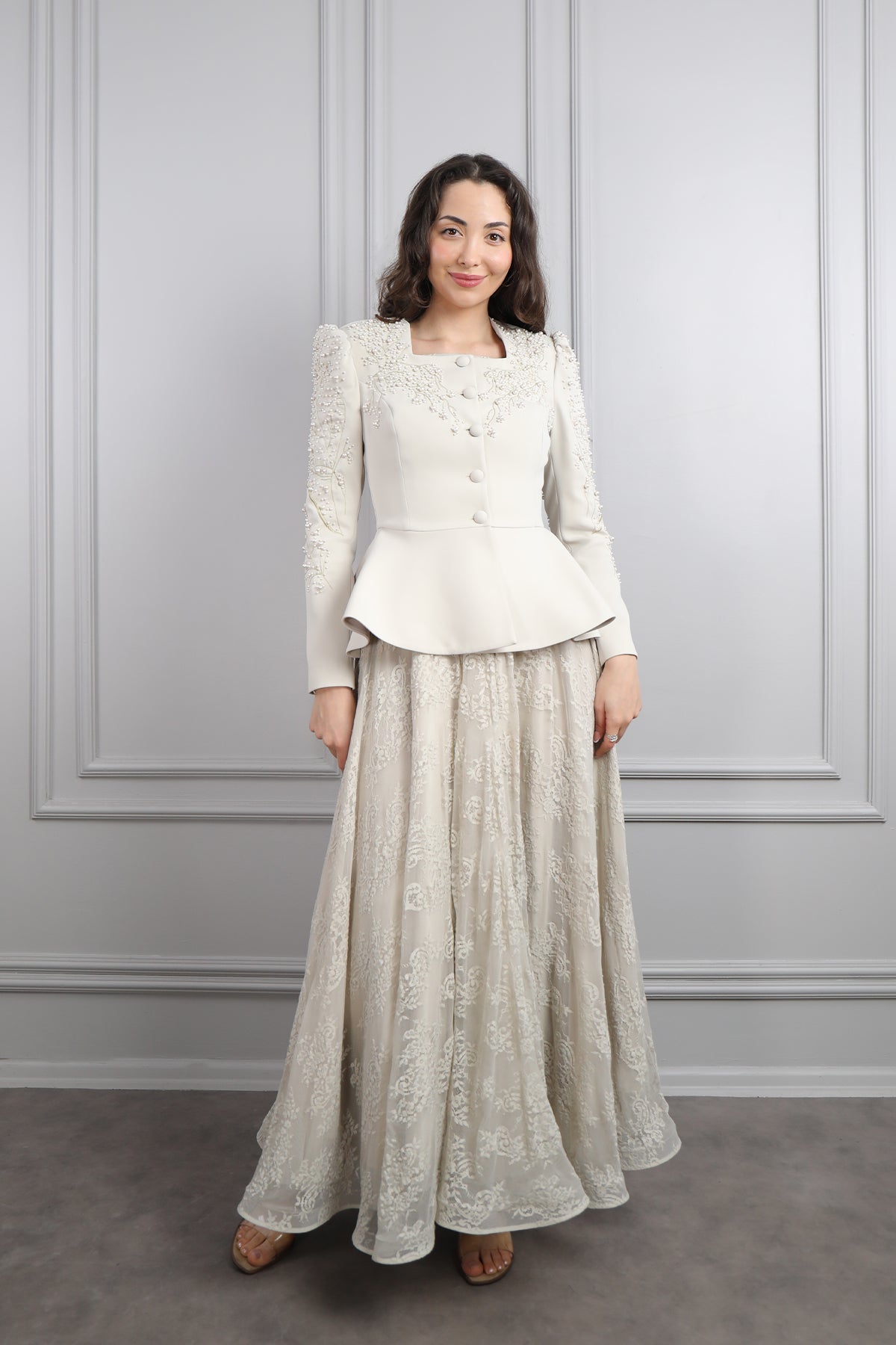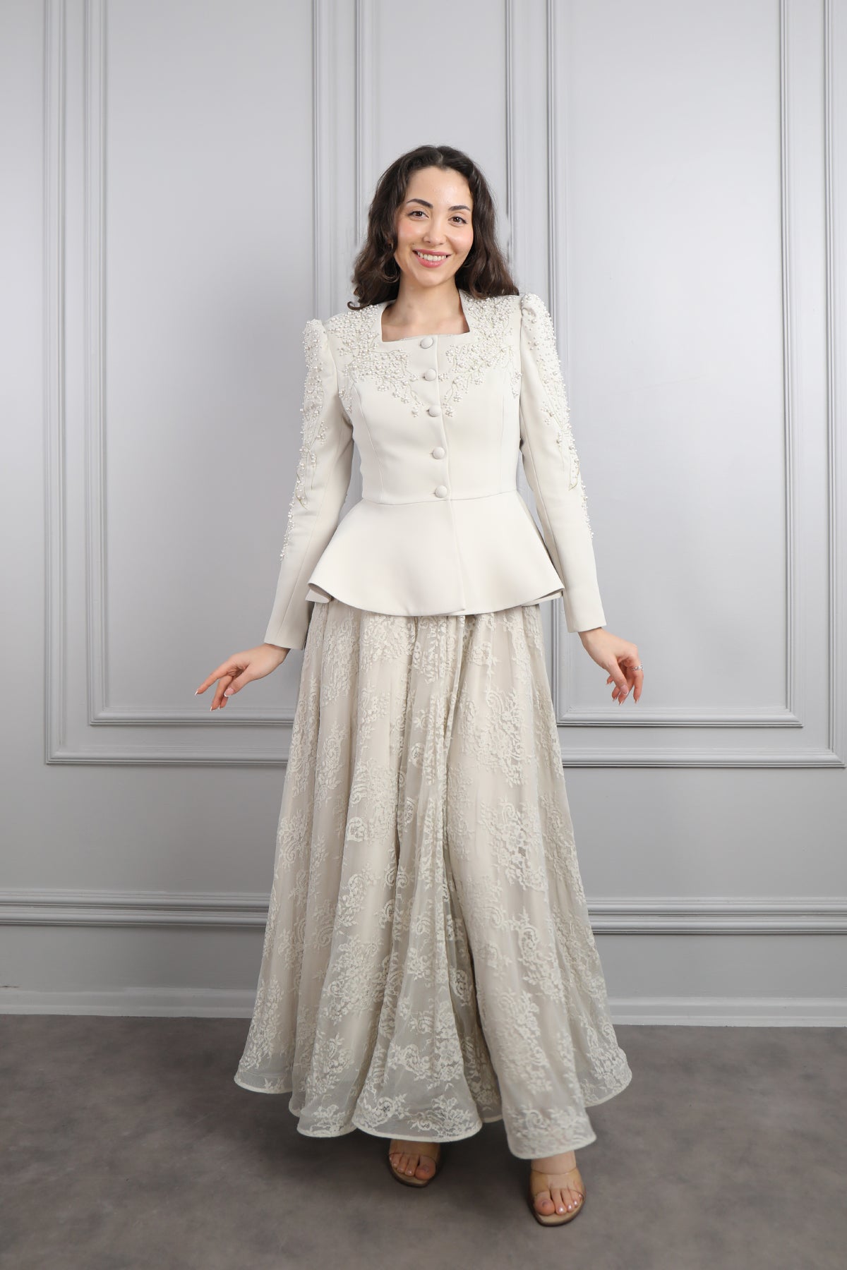 Ceketi İnci İşlemeli Dantelli Elbise Takım Bej