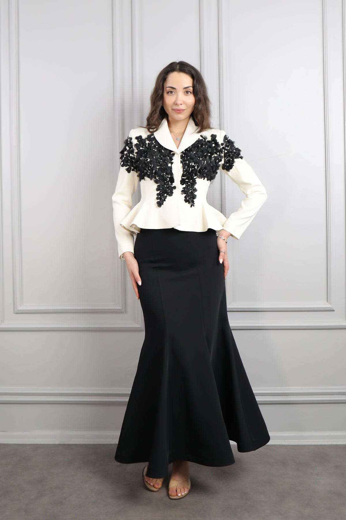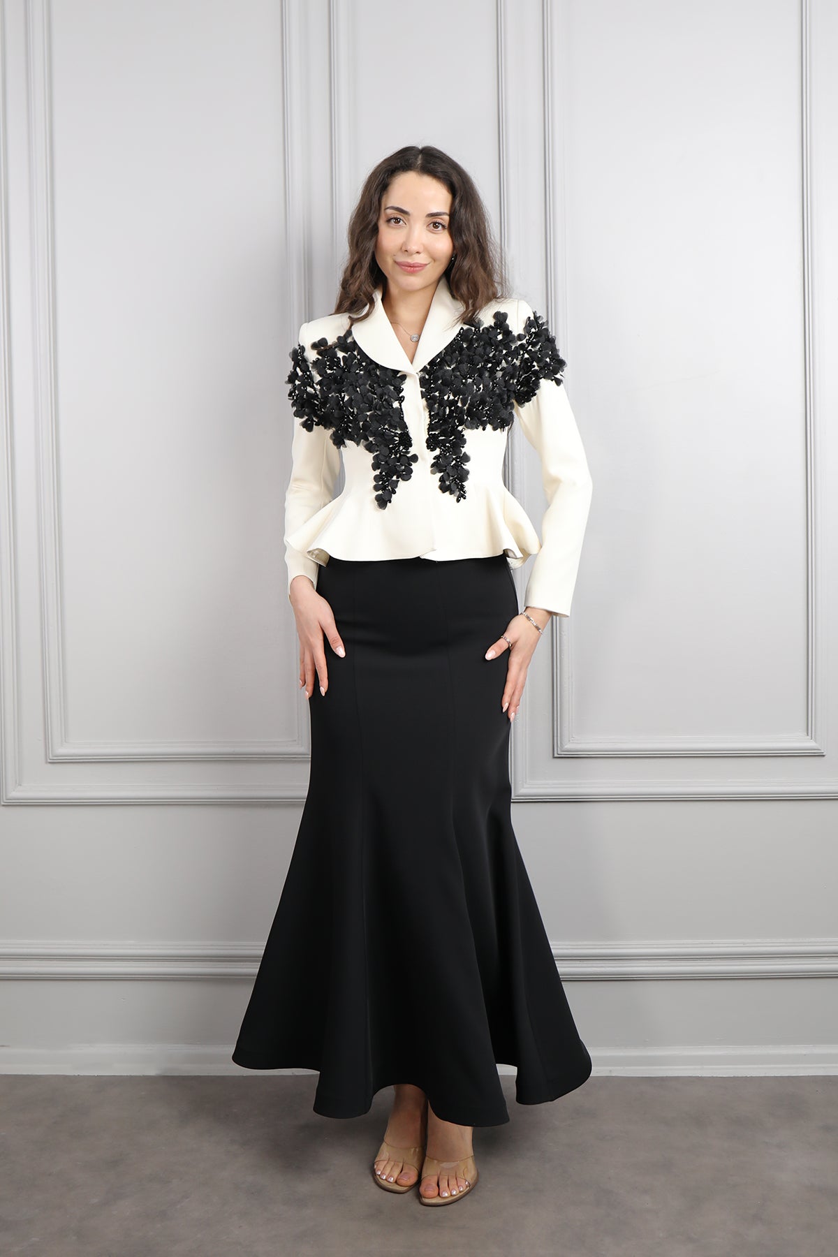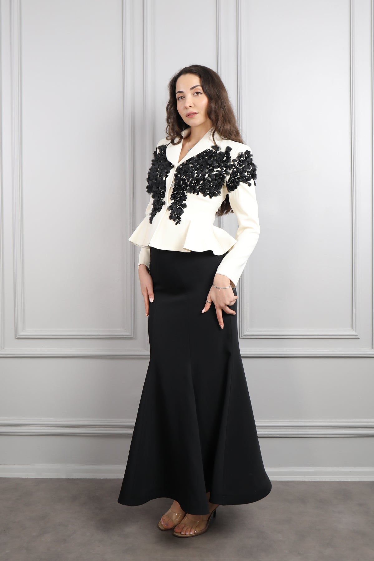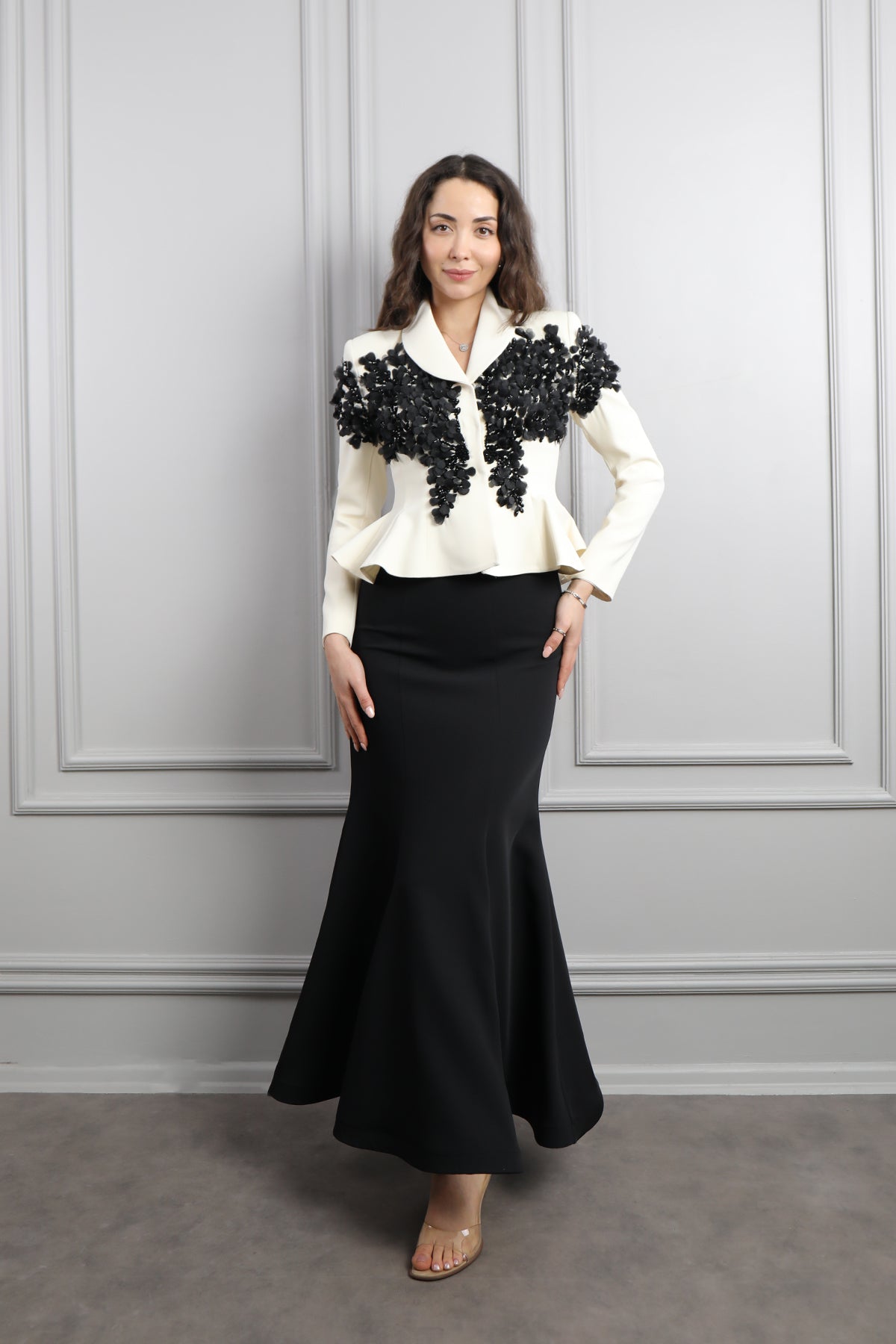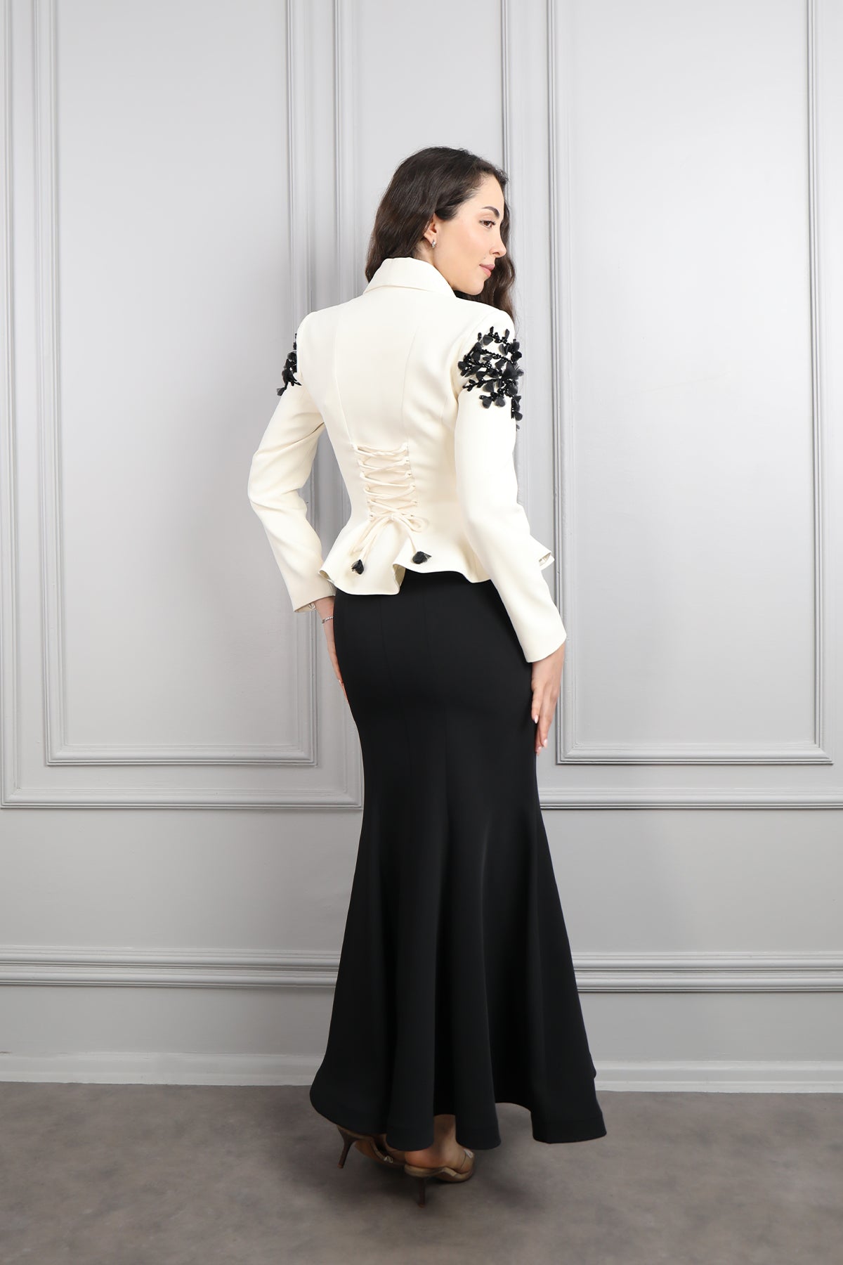 Ceketi İşlemeli Sırtı Bağlamalı Etek Takım Siyah-Ekru Özellikleri
