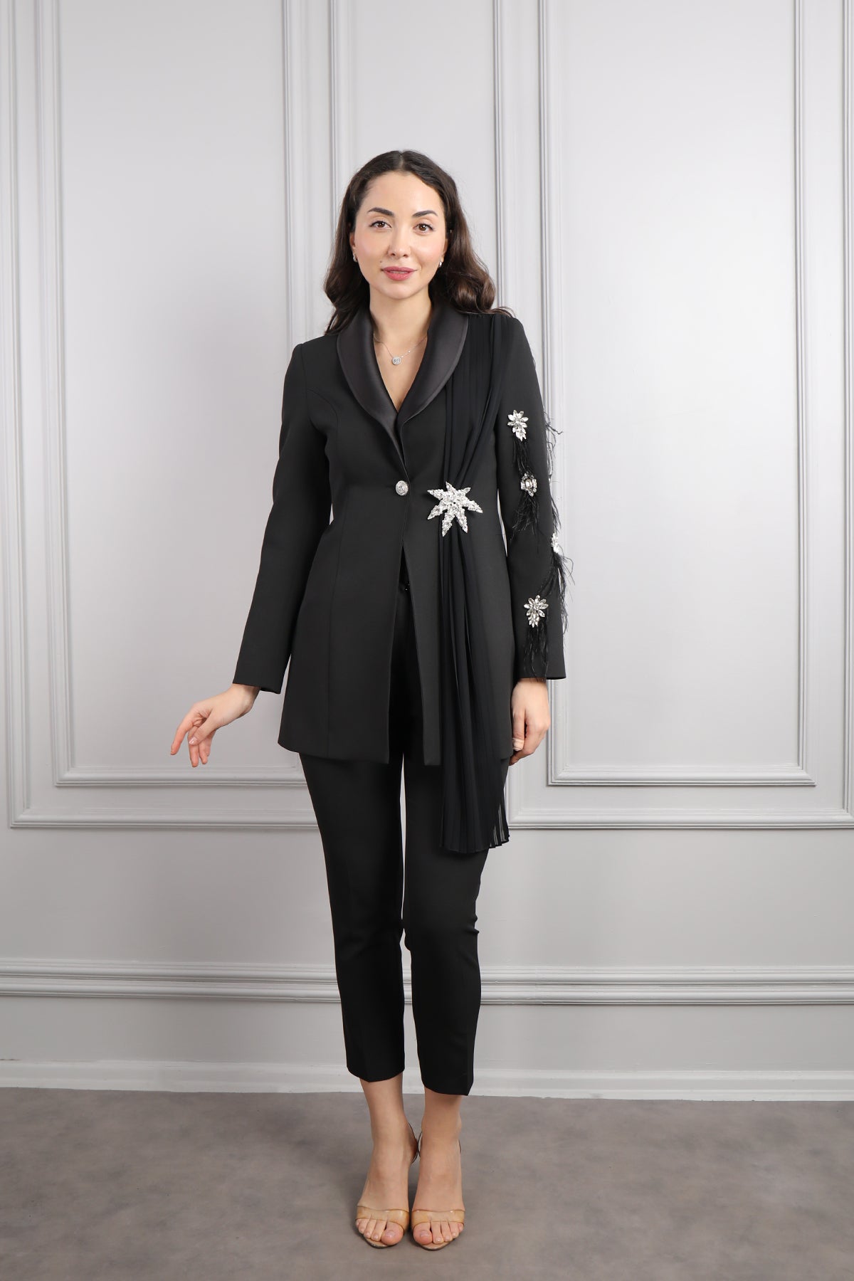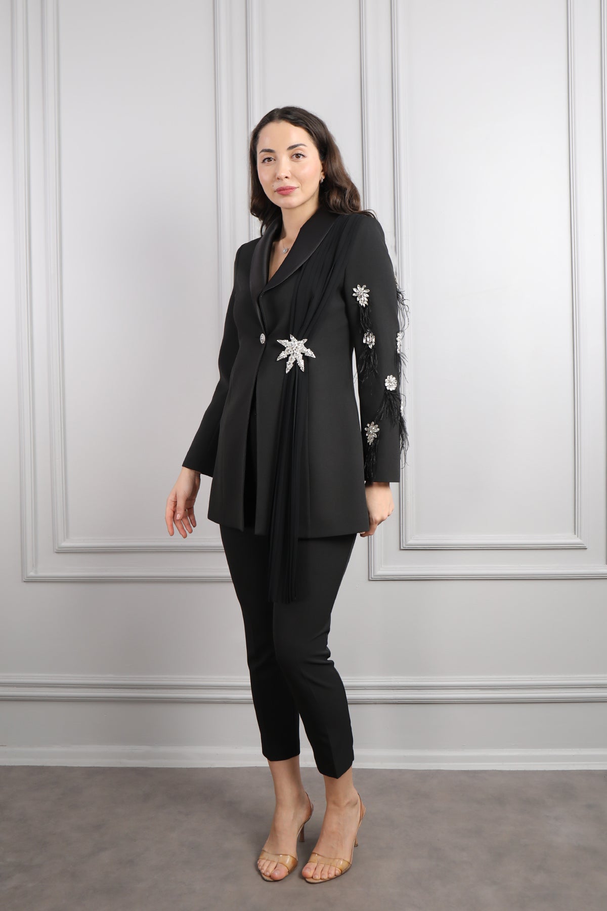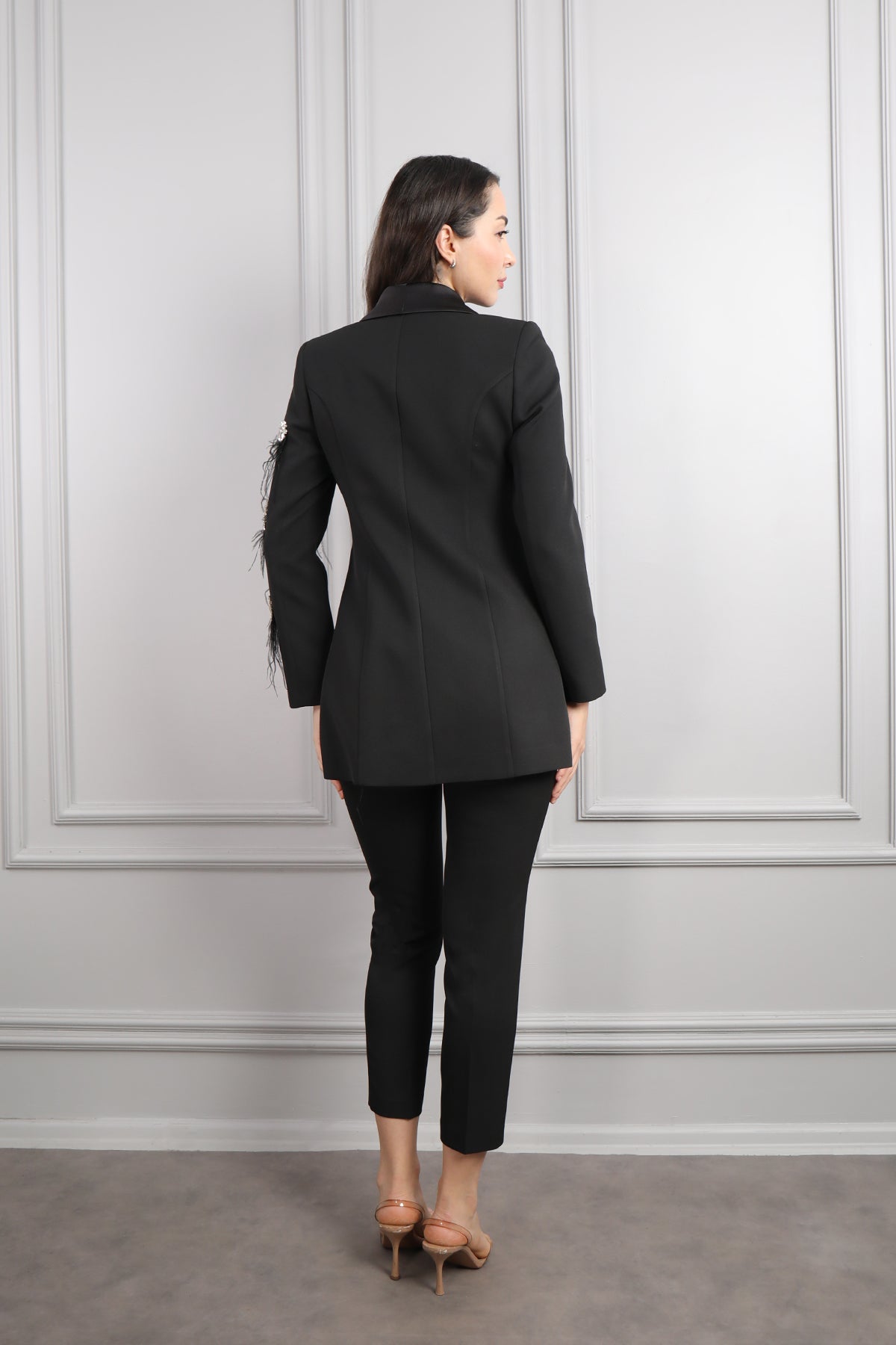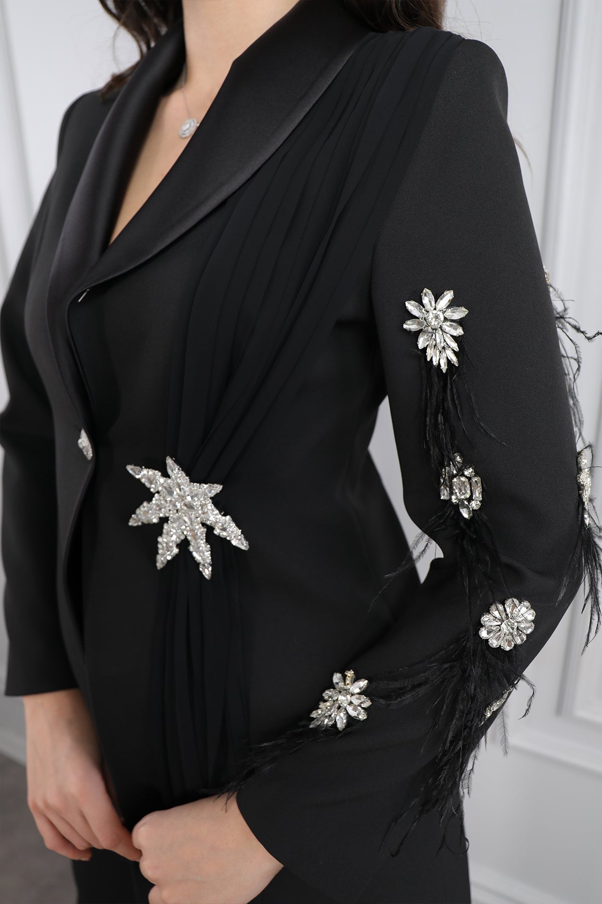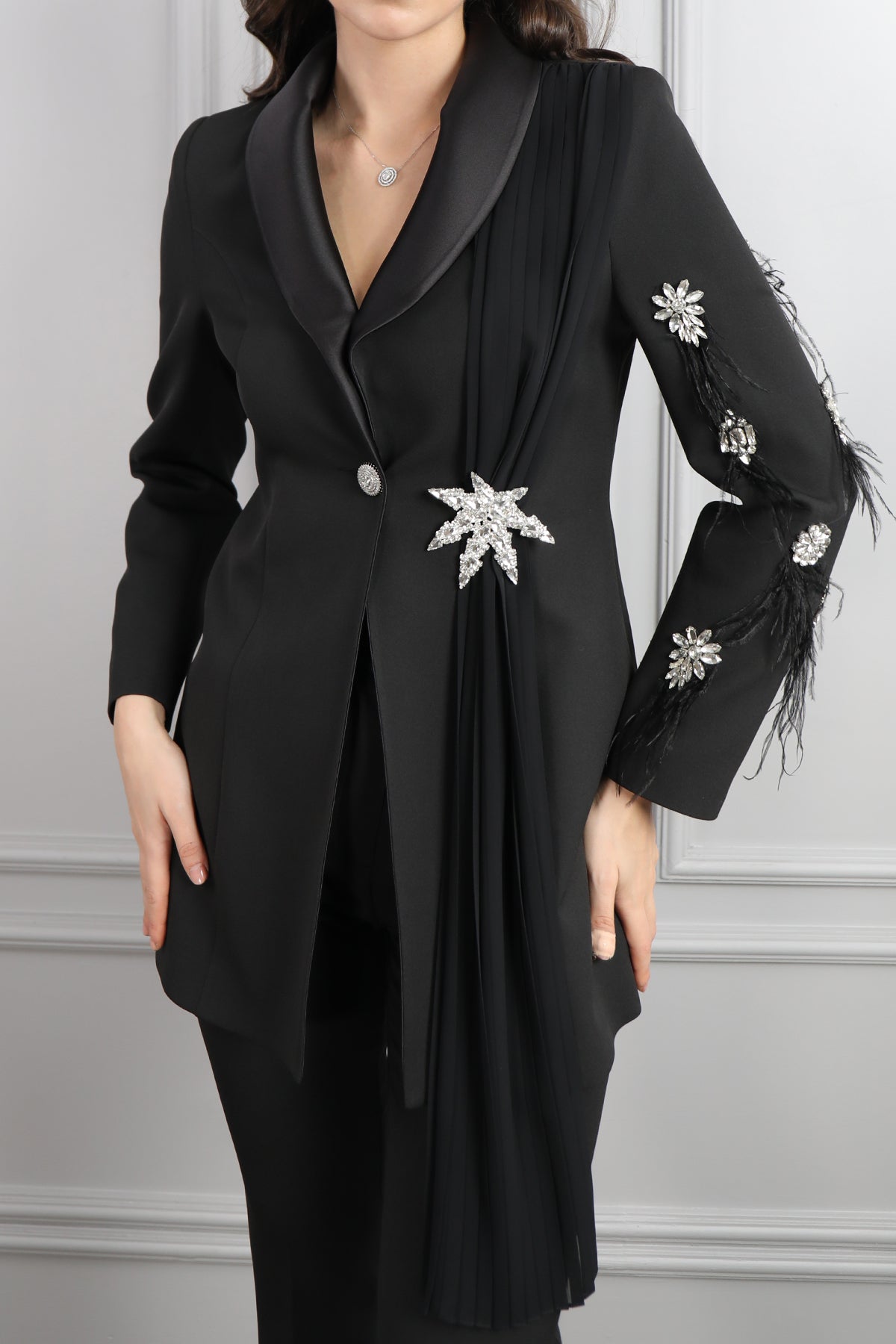 Ceketi Taş Detaylı Tüylü Pelerinli Büyük Beden Pantolon Takım Siyah Özellikleri