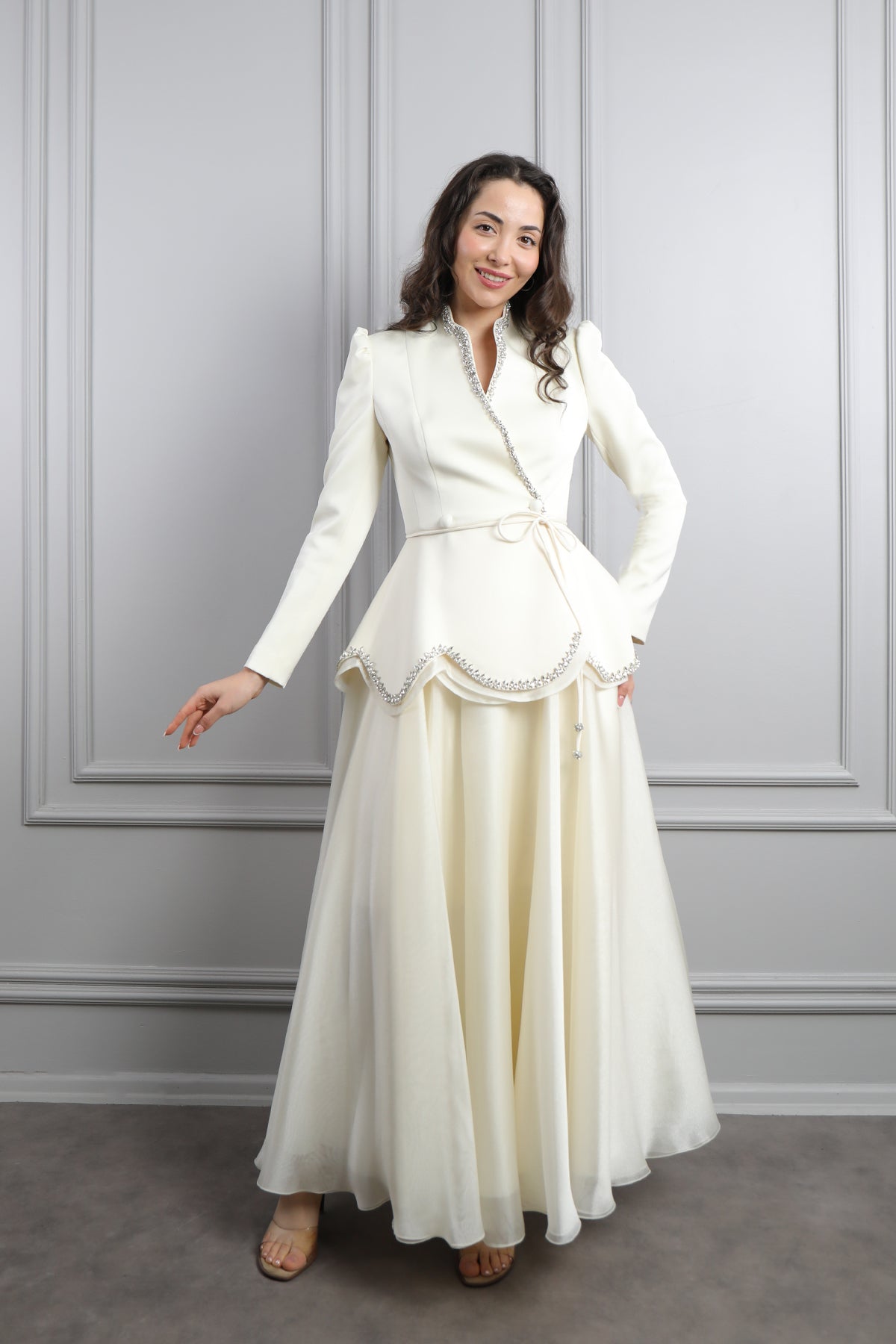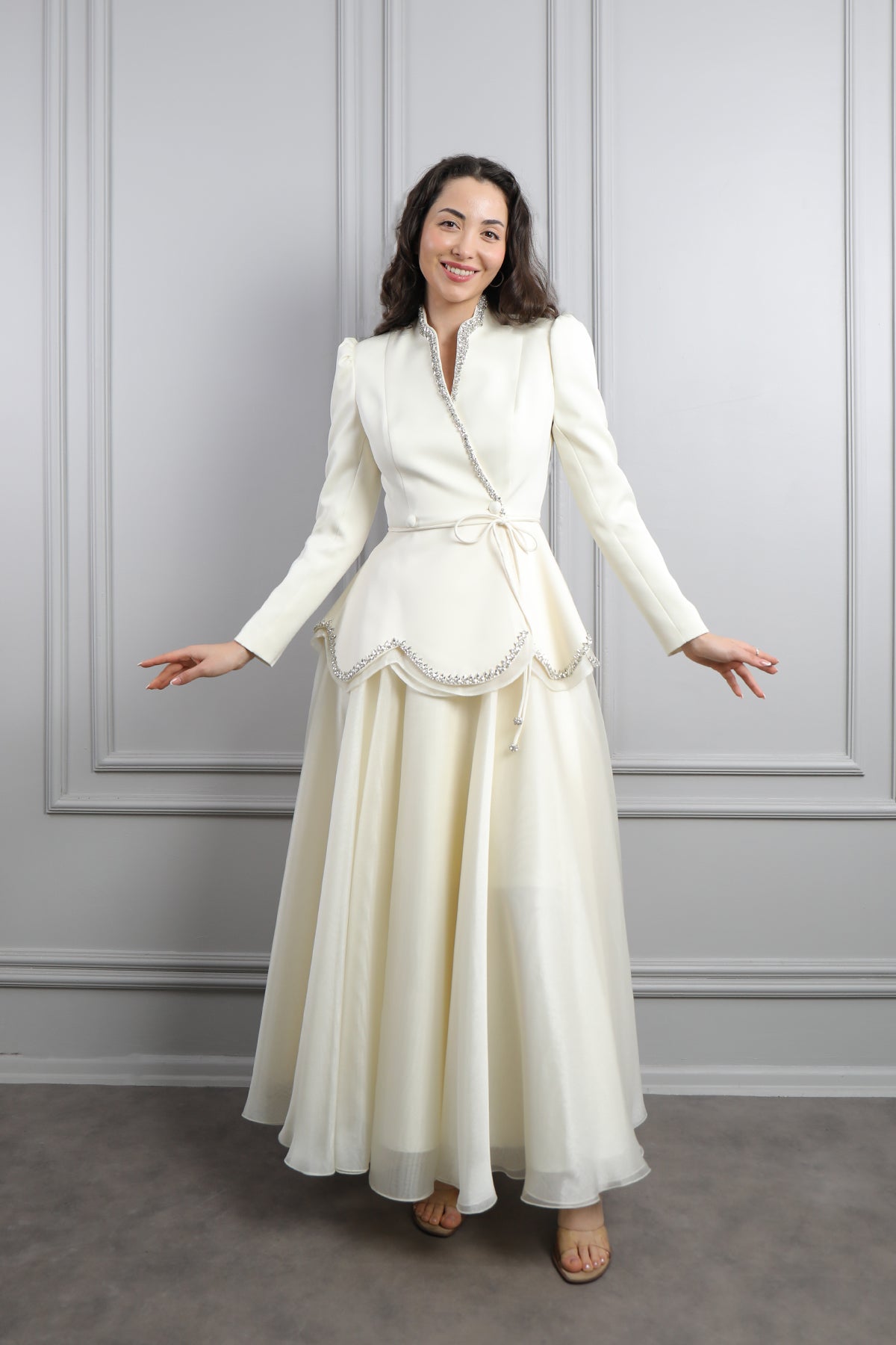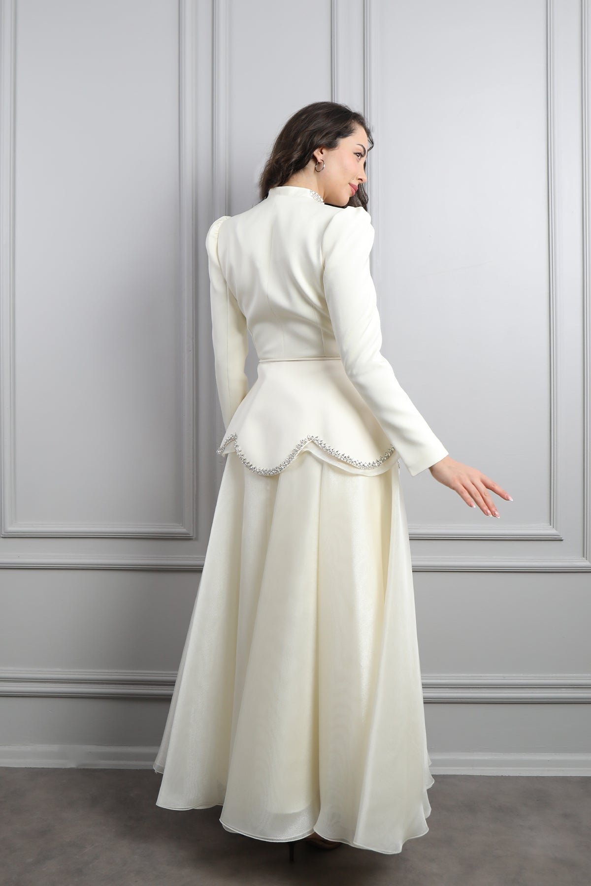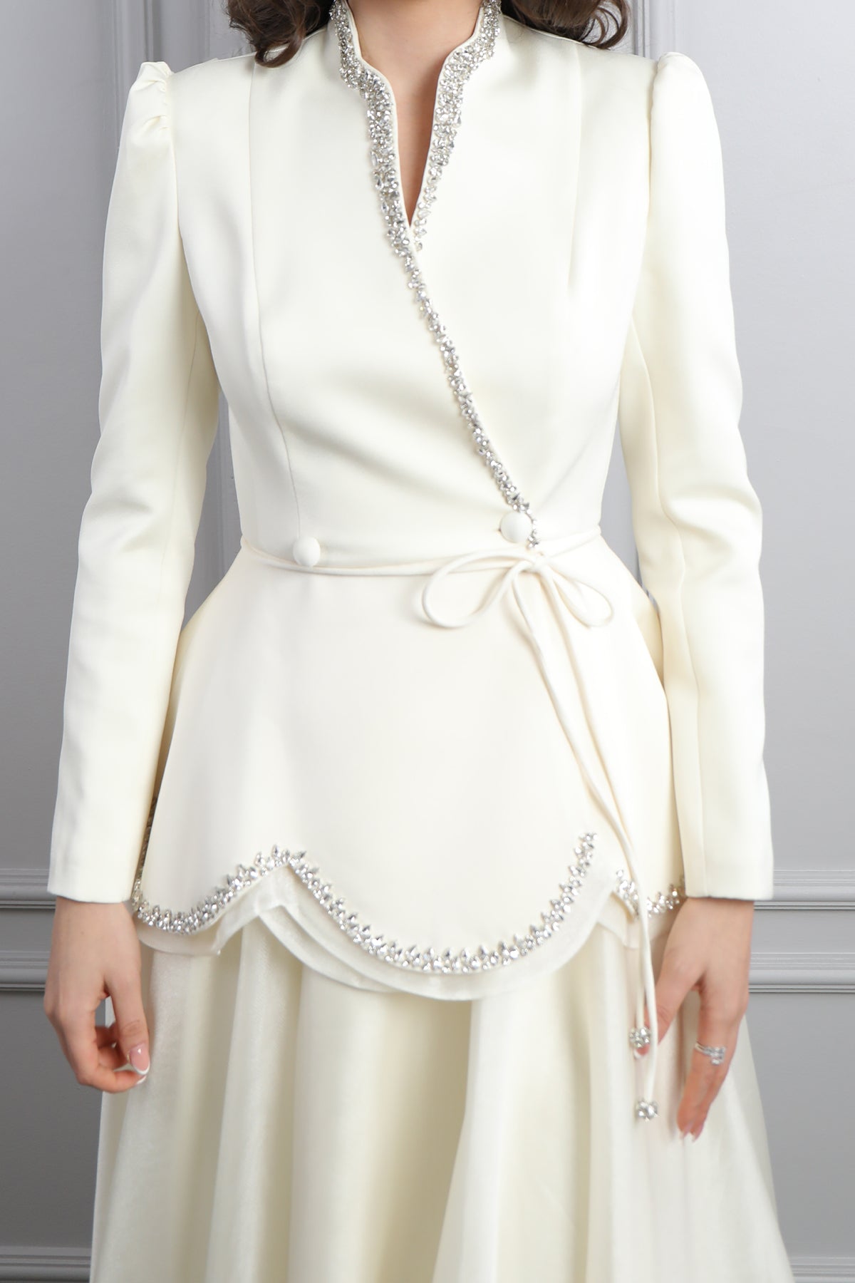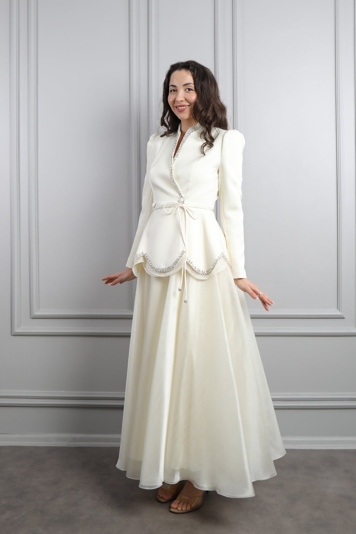 Ceketi Taş İşlemeli Beli Kuşaklı Saten Etek Takım Ekru