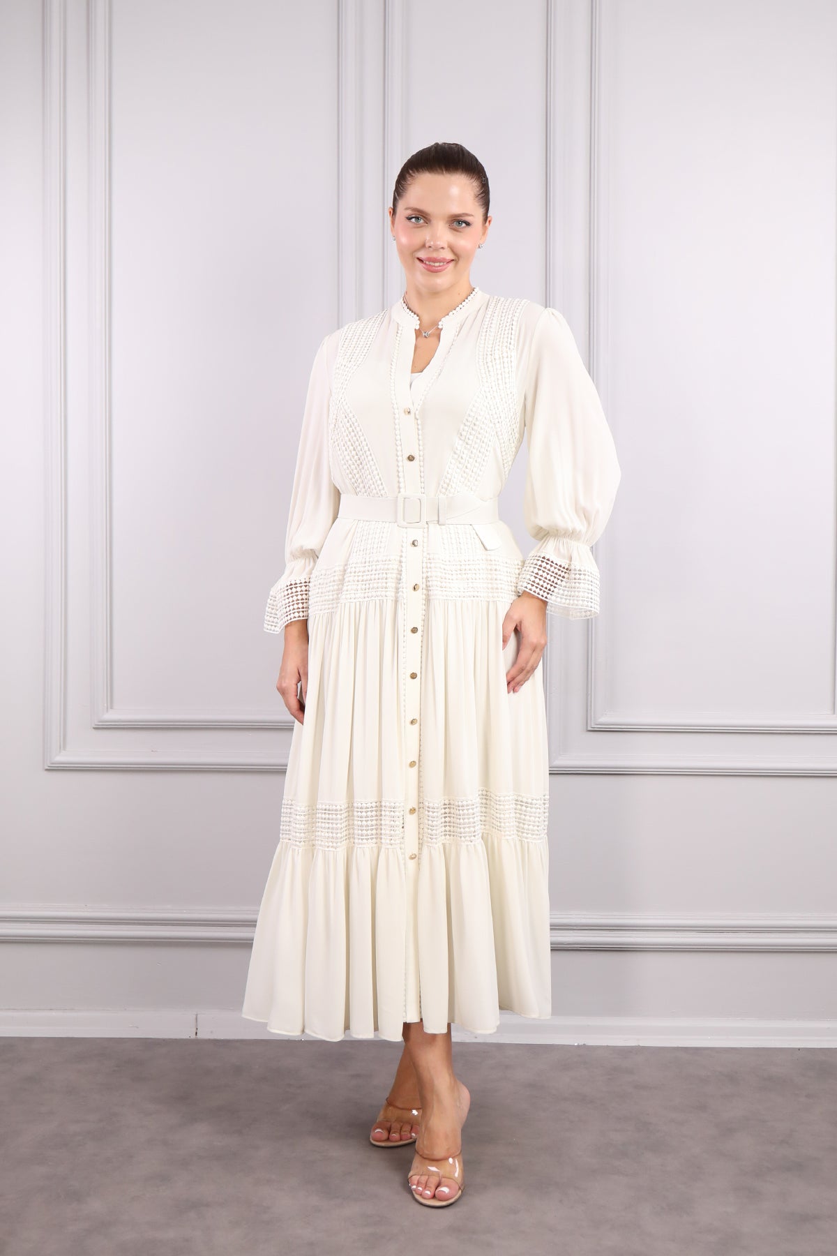 Beli Kemerli Önü Düğme Detaylı Midi Boy Elbise Ekru