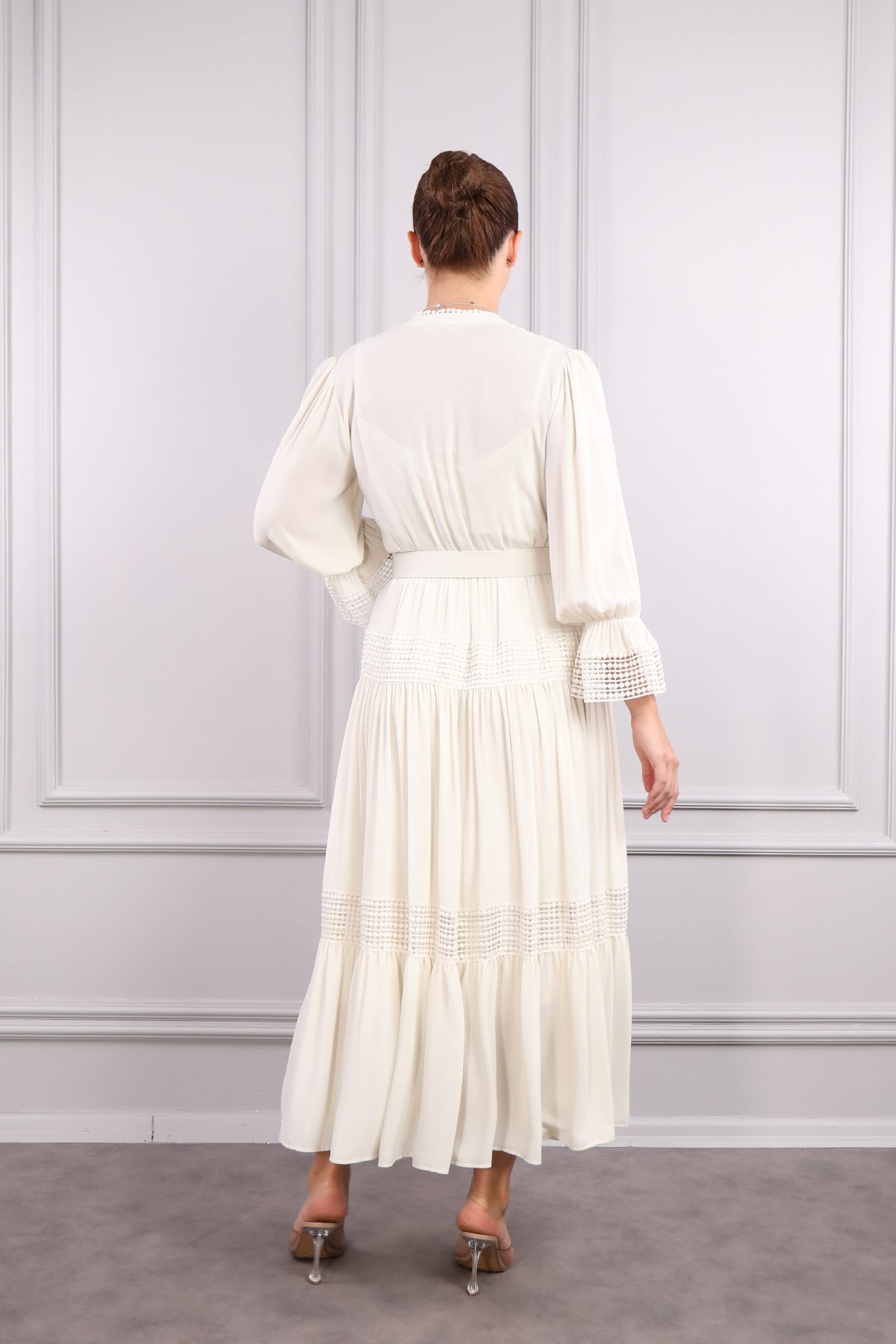 Hakim yaka görünümünde elbisemiz v yaka dekoltesi verilerek tasarlanırken dantel detayları verilerek modern bir görünüm kazandırılmıştır. Geniş kol detayı ve ön kısmına düğmeler eklenerek bütünlük sunulan elbisemiz midi boydur. Özel günlerinizde tercih edebileceğiniz elbisemizi seçmeniz sizler için ideal bir tercih olacaktır.