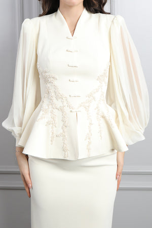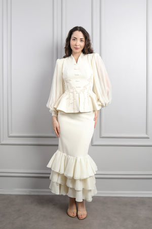 İnci İşlemeli Fırfır Detaylı Pantolon Takım Ekru