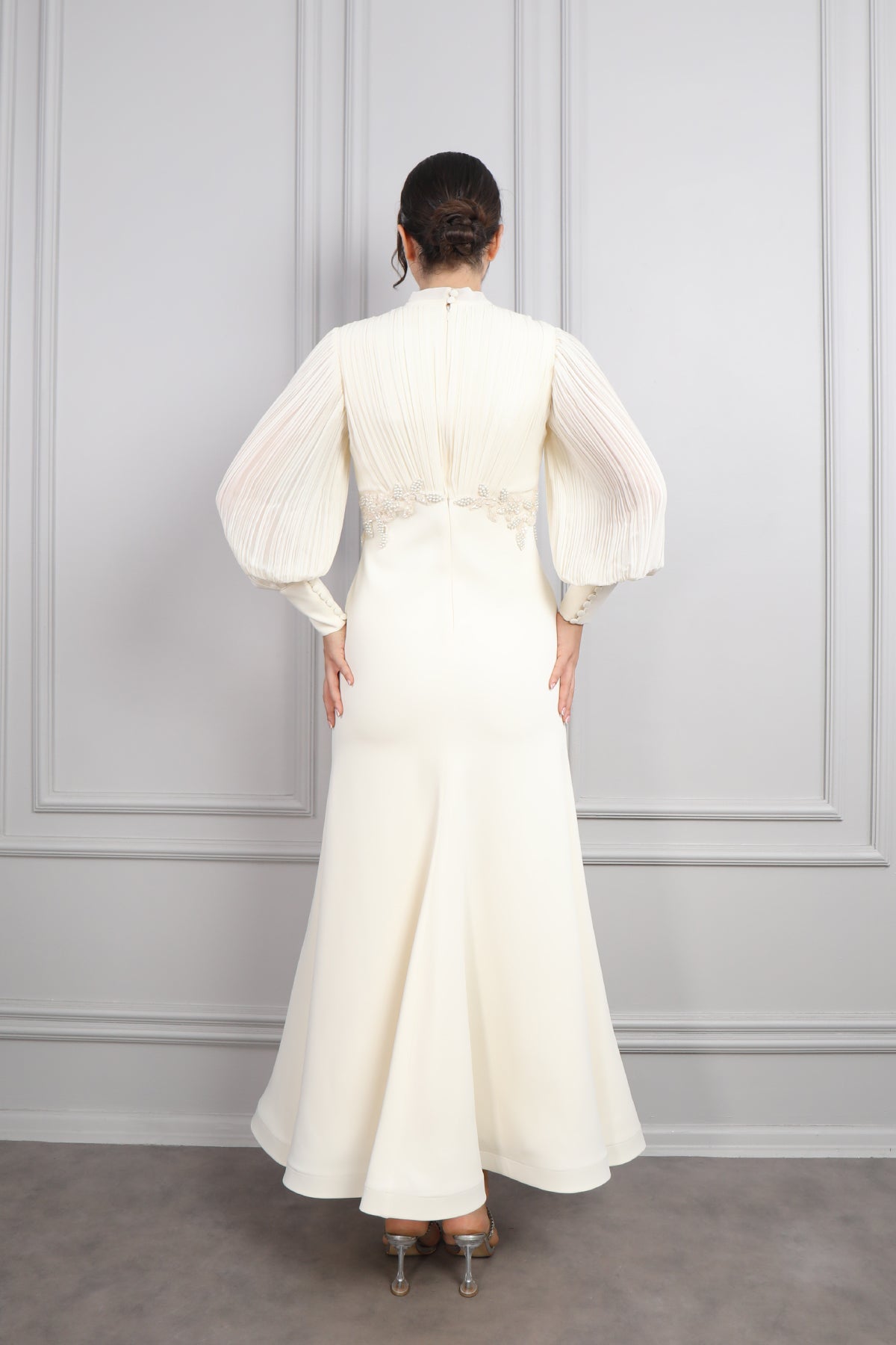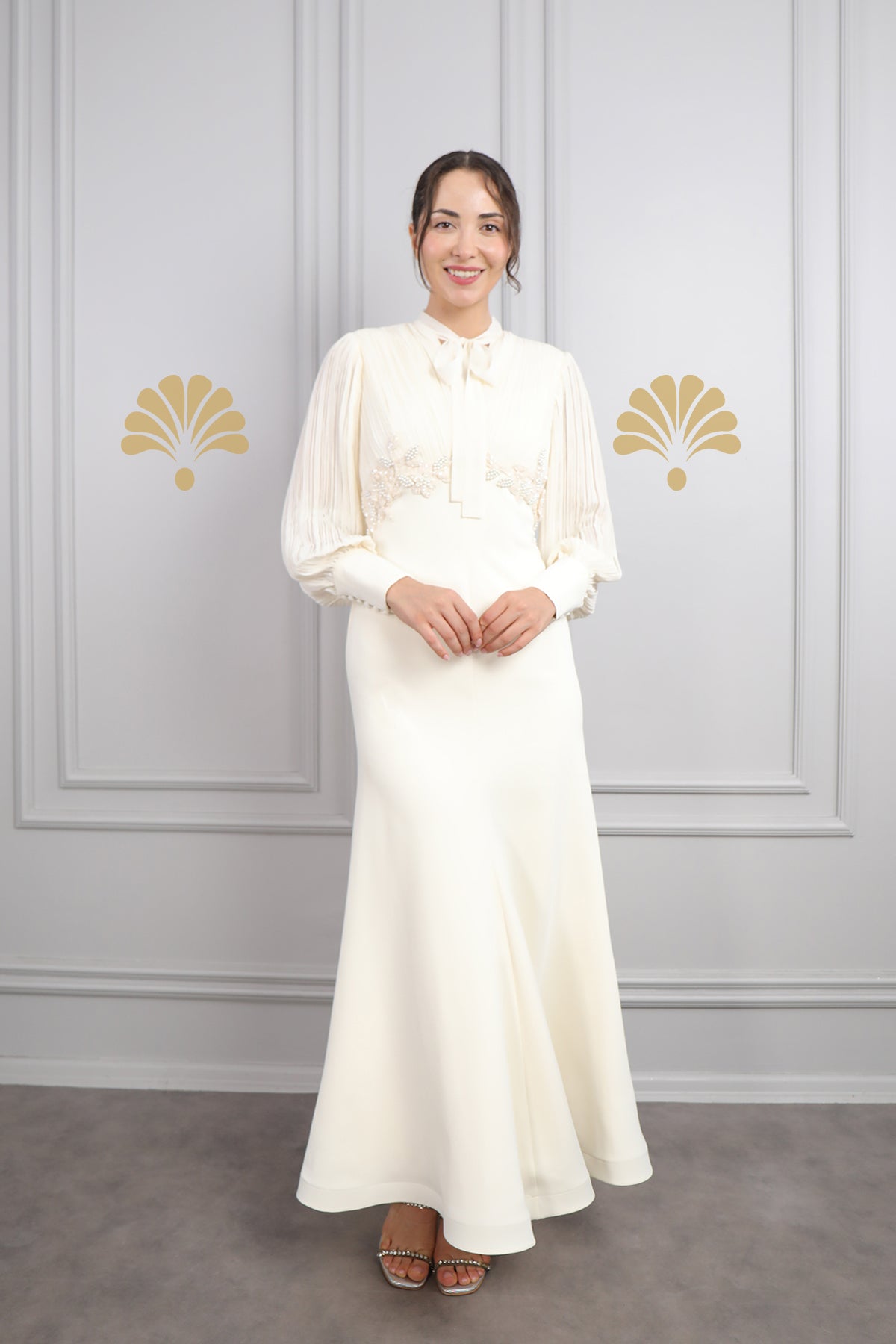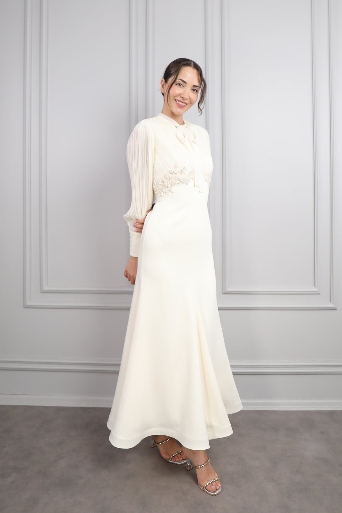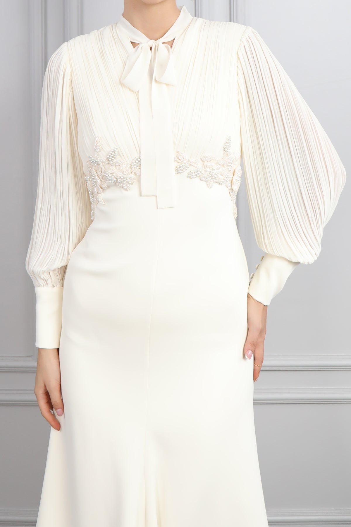 Zamansız şıklığı modern detaylarla birleştiren bu yakası bağlamalı, beli boncuk işlemeli elbise, özel günlerde fark yaratmak isteyen kadınlar için tasarlandı. Saf krem tonundaki rengiyle asil bir duruş sergileyen elbise, ince zevklere hitap eden zarif detaylarla göz dolduruyor. Plise detaylı uzun kolları, elbiseye hem romantik hem de sofistike bir hava katarken, göğüs altındaki boncuk işlemeleri feminen vurguyu zarifçe öne çıkarıyor. Bağcıklı yaka detayı, klasik gömlek yaka stiline modern bir dokunuş kazandırarak, elbiseye özgün bir karakter katıyor. Yüksek kaliteli kumaşı ve dökümlü yapısı sayesinde hem konforlu hem de şık bir kullanım sunan bu elbise nişan, söz, mezuniyet ve özel davetler için ideal bir tercih olacaktır.