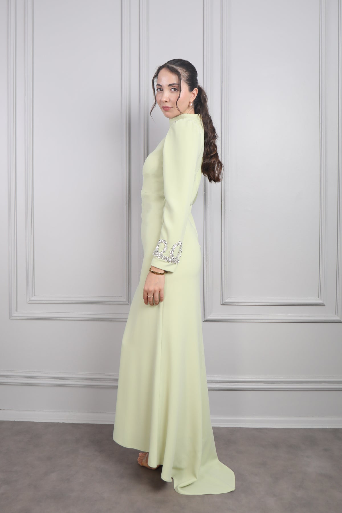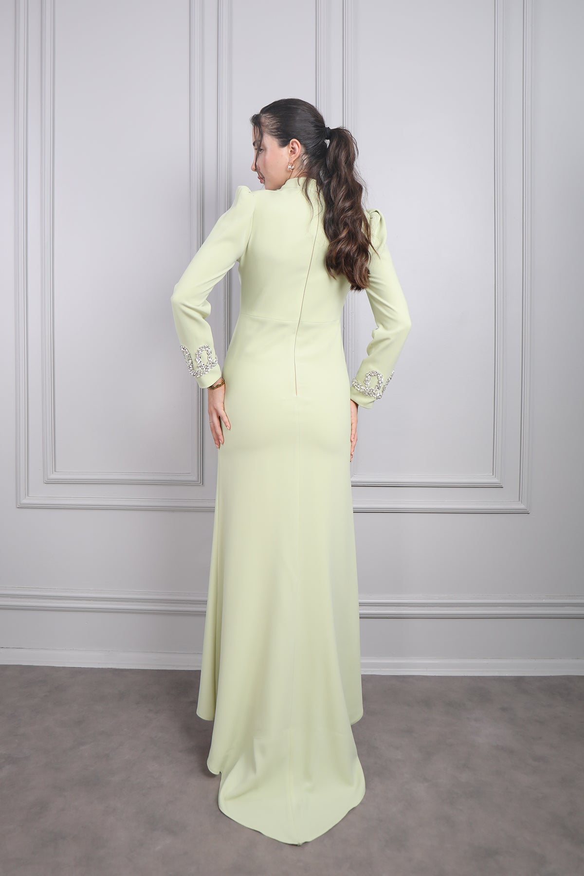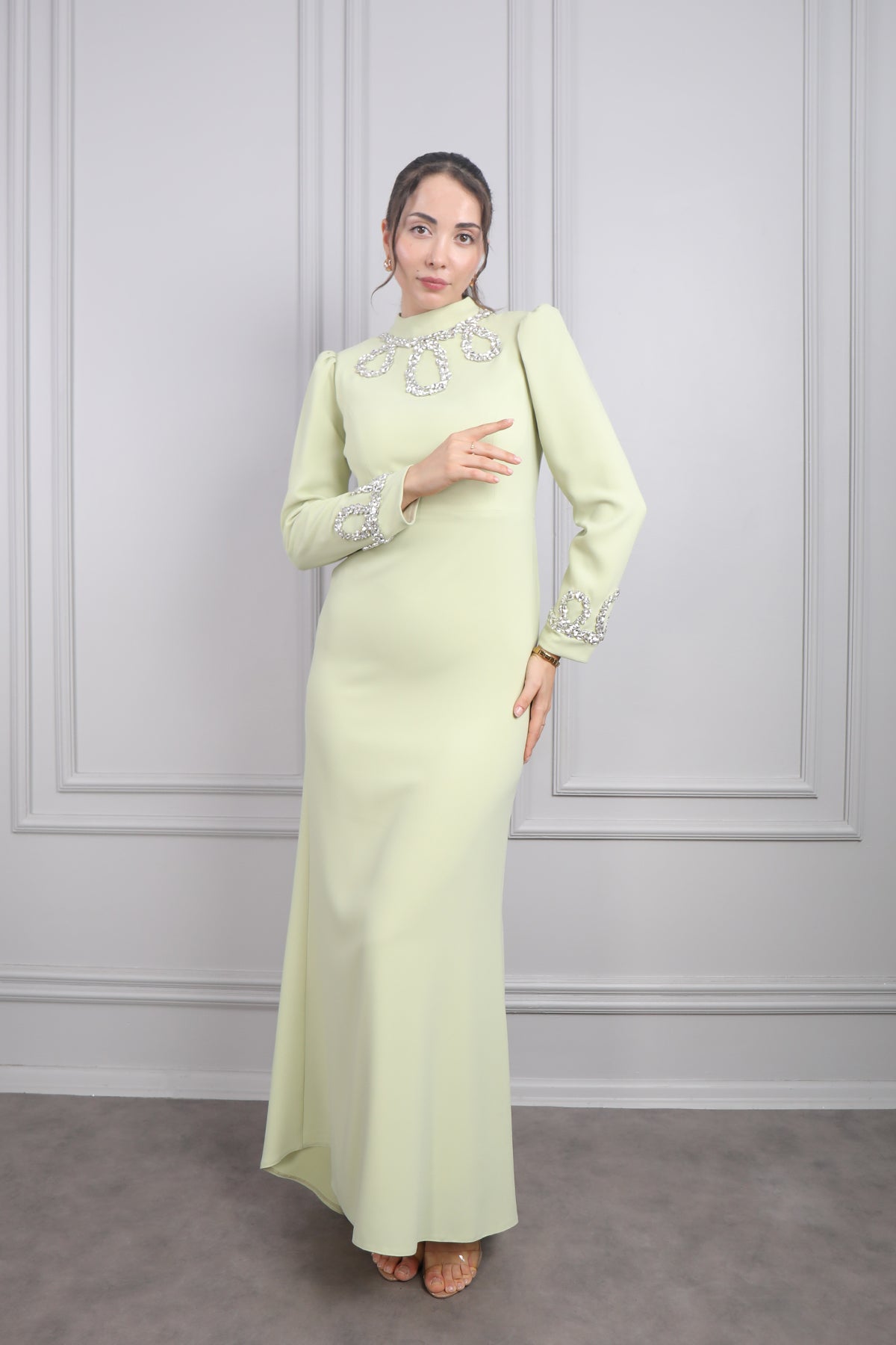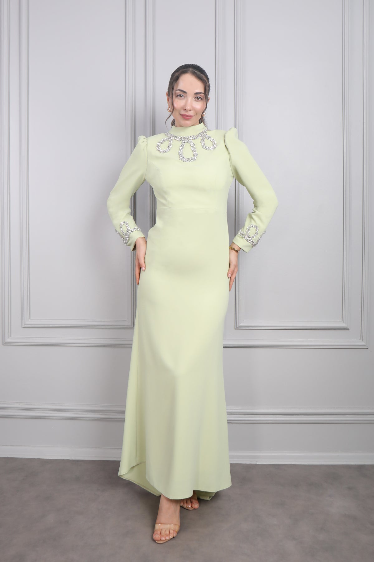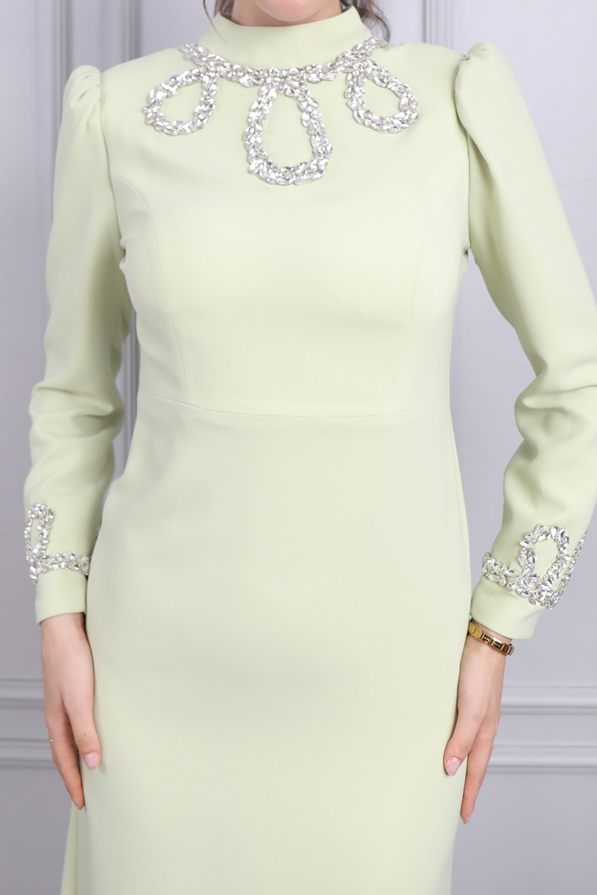 Hakim Yakası Taş Detaylı Tesettür Abiye F.Yeşil