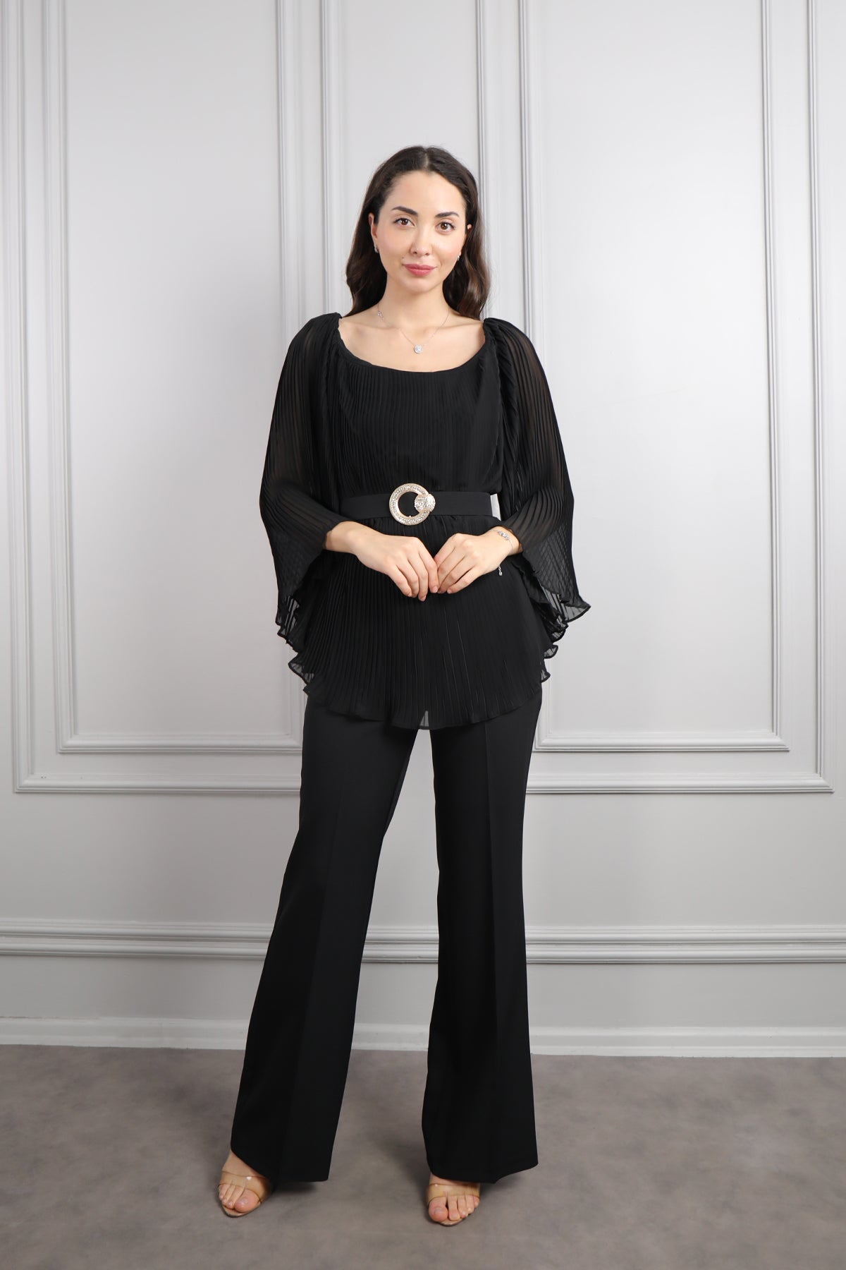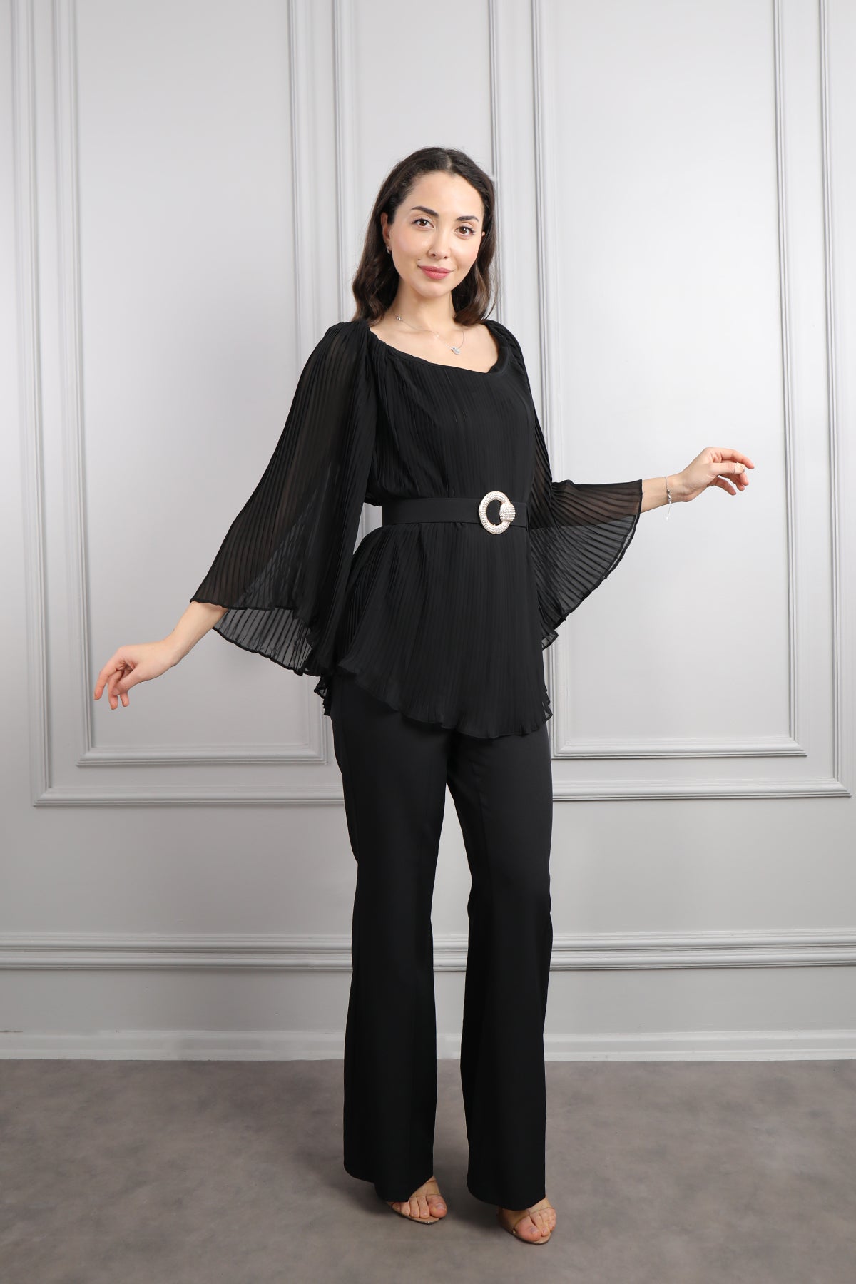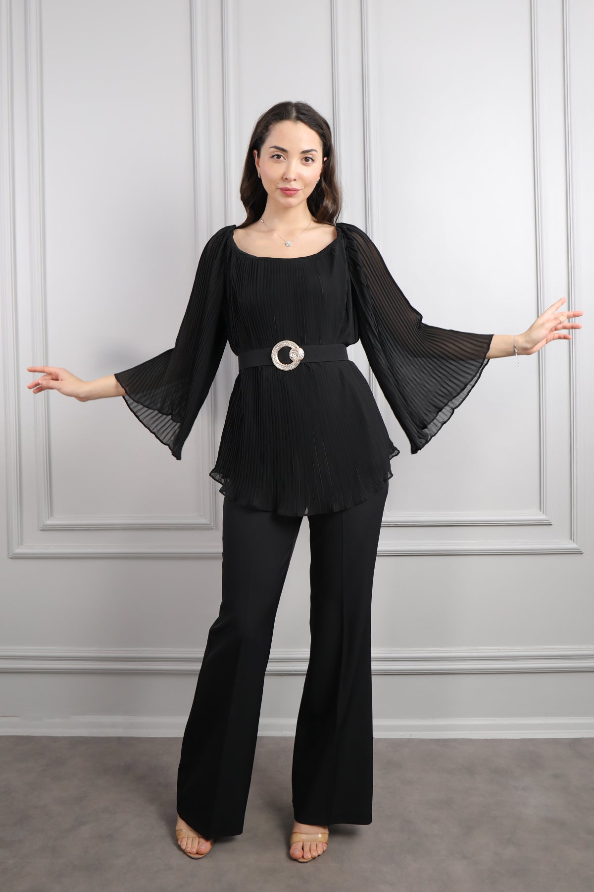 Geniş Yaka Beli Kemerli Pileli Büyük Beden Pantolon Takım Siyah Özellikleri