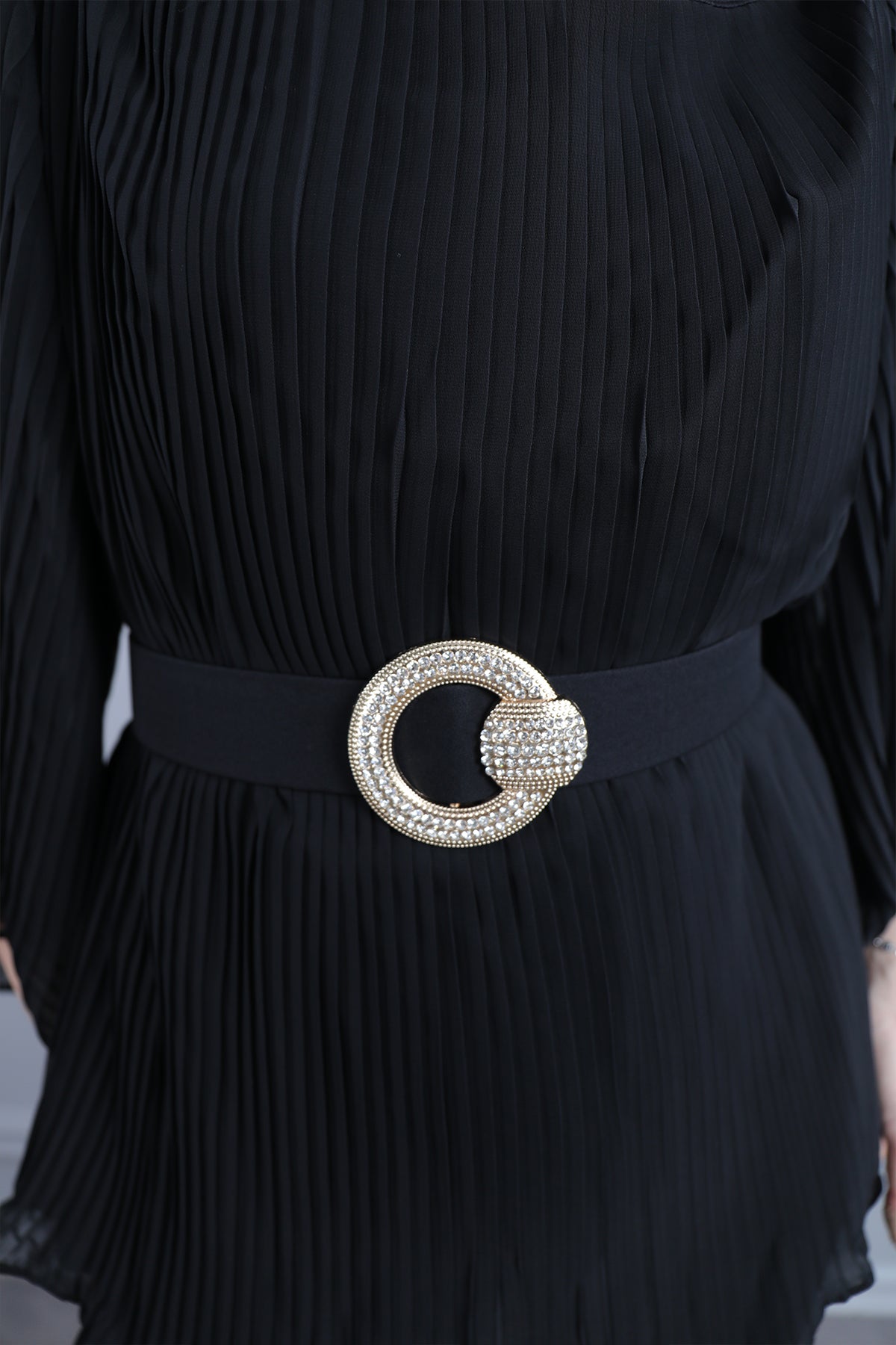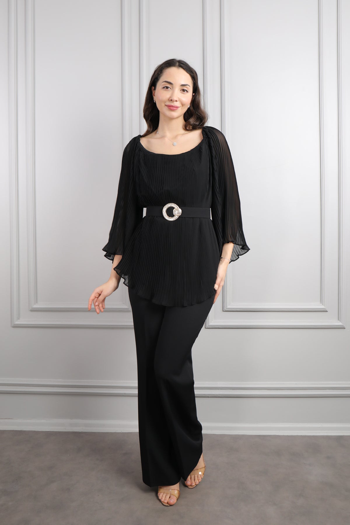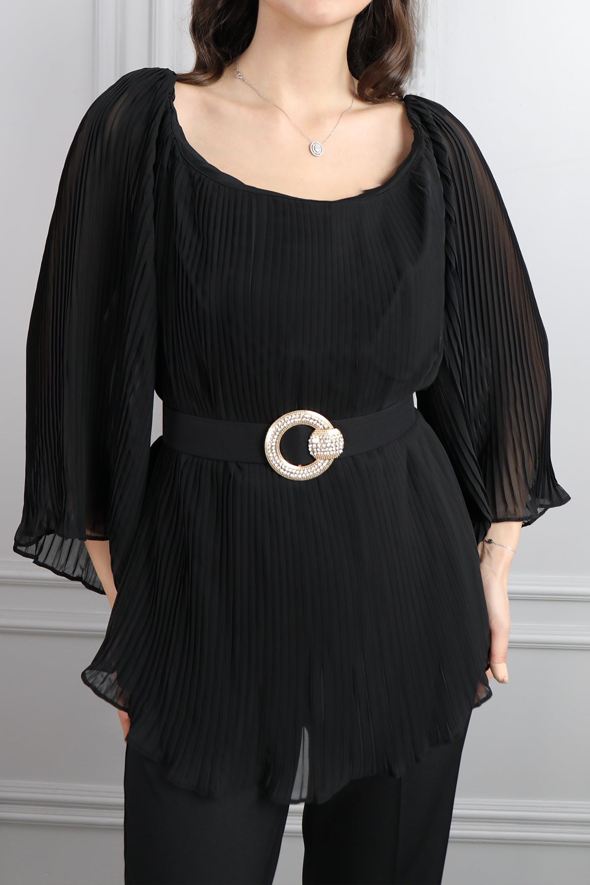 Geniş Yaka Beli Kemerli Pileli Büyük Beden Pantolon Takım Siyah Özellikleri