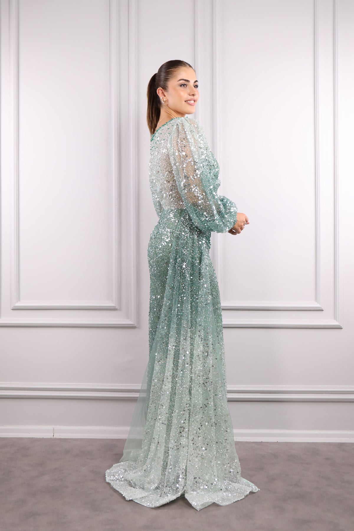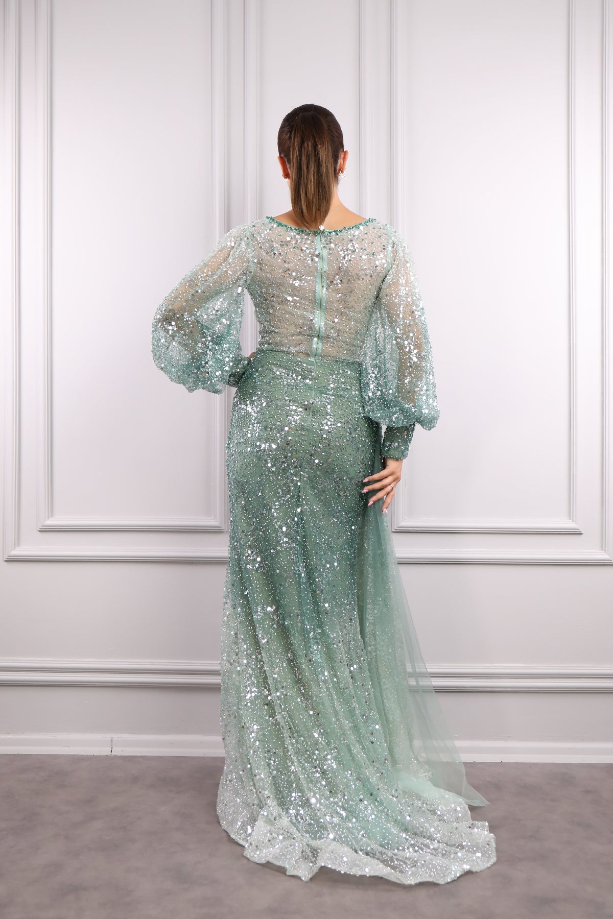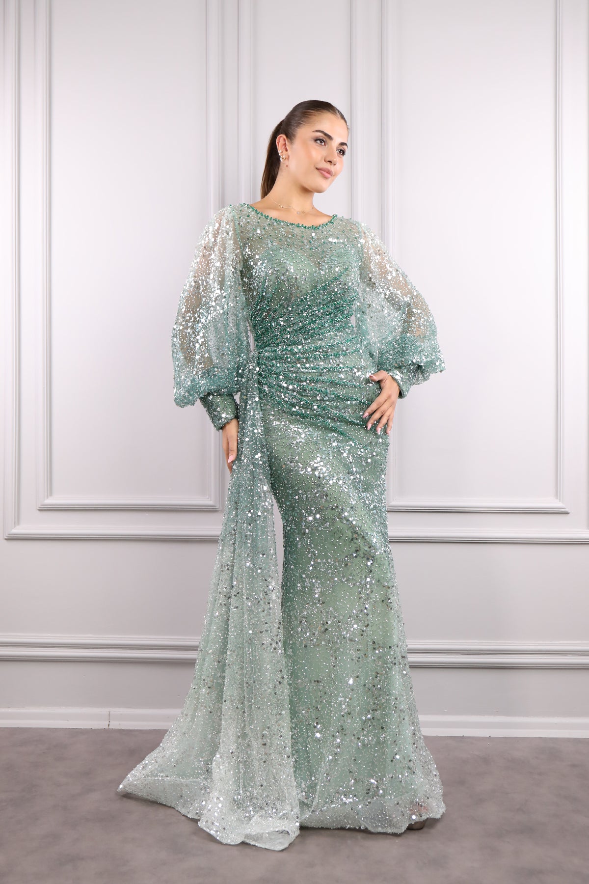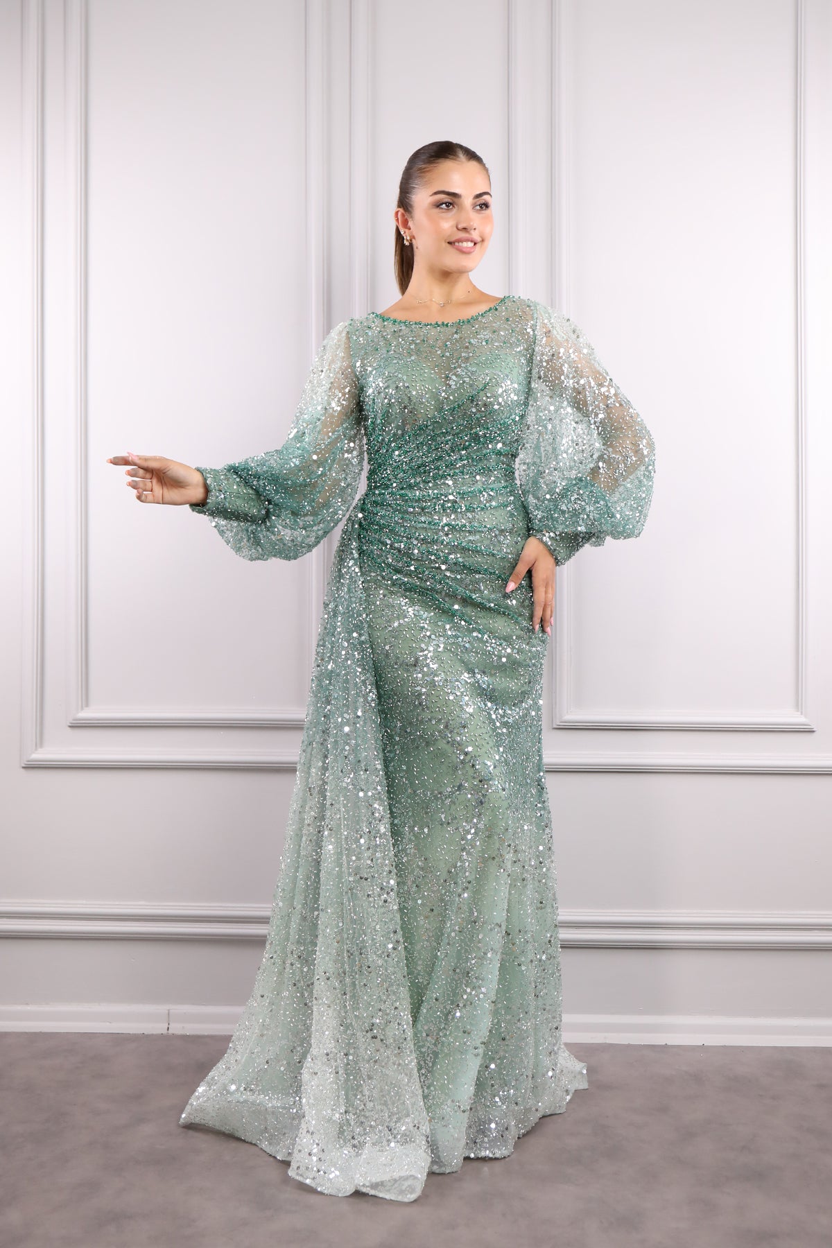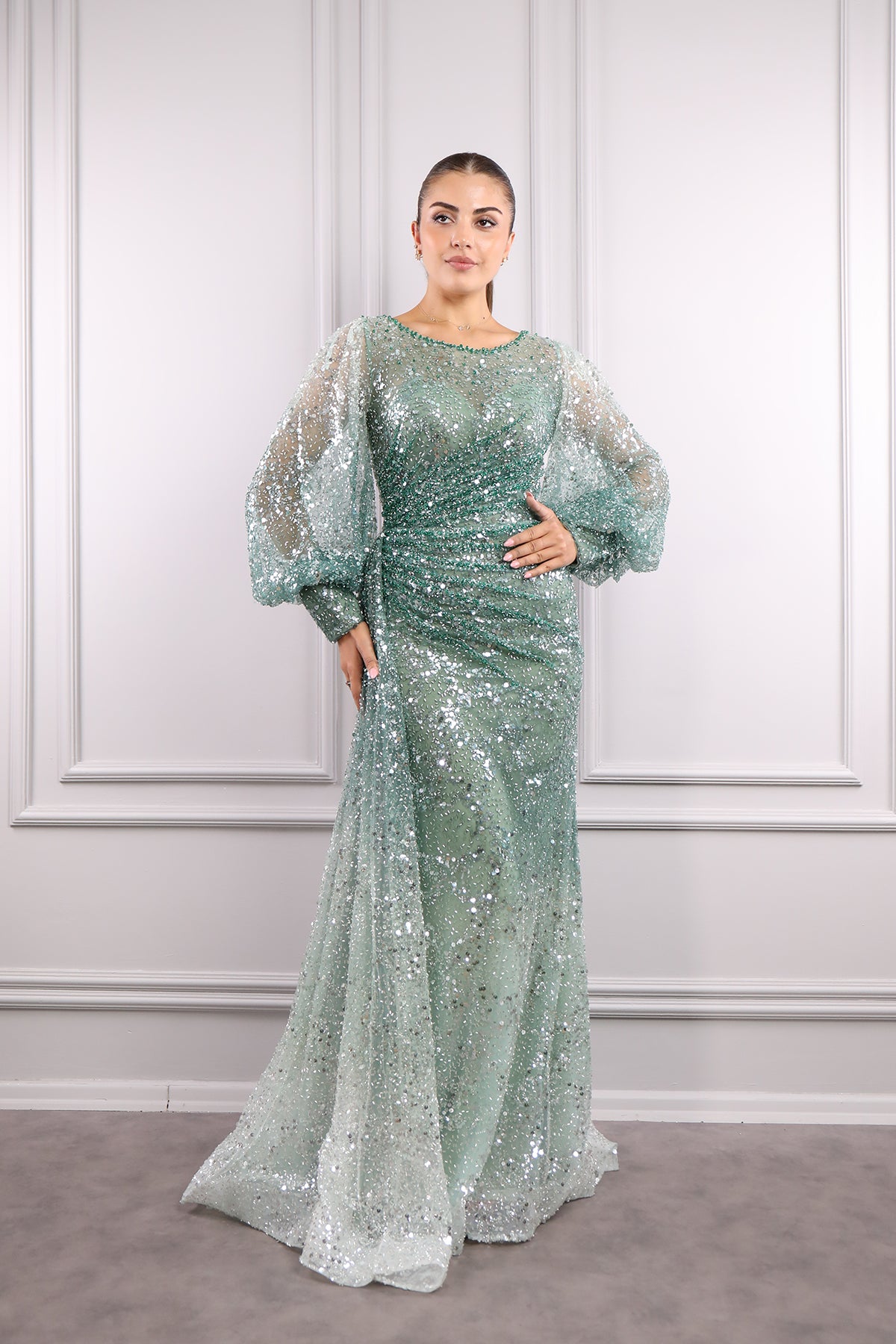 Geniş yaka abiyemizin tamamı payet ve boncuk işlemeleriyle tasarlanarak göz alıcı bir tasarım sunulmuştur. Balon kol detayıyla hareketlendirilirken balık modelinde inen abiyemizin bel kısmında oluşan drapelerle dikkat çekici bir görünüme sahiptir. Belinden aşağı inen kuyruk görünümüyle özel tasarıma sahip olan tam boy abiyemizi nişan veya davetlerinizde tercih etmeniz sizler için ideal bir seçim olacaktır.
